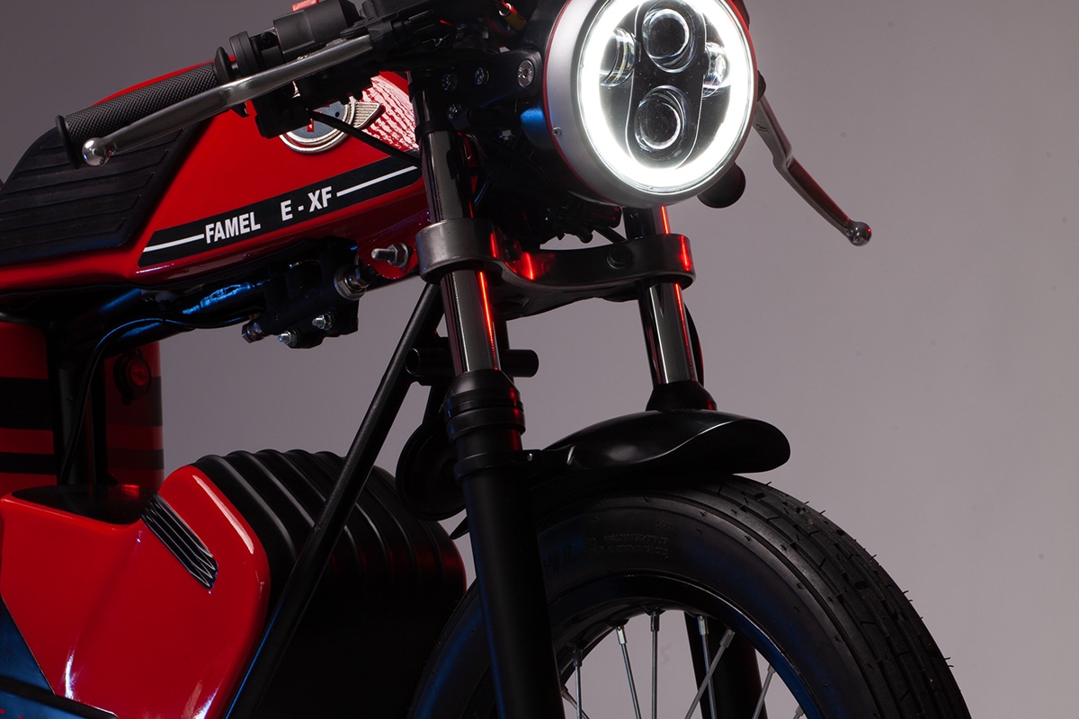 A Famel regressa ao final da década de 70 onde foi concebida inicialmente a XF-17; o seu design esguio, mas aspeto e performances desportivas fizeram com que fosse um dos modelos mais cobiçados e coroaram-na como a rainha das motorizadas portuguesas. Invocando toda a herança deste modelo icónico, a nova E-XF promete trazer a Famel de volta às estradas com um design clássico, mas eletrificado, utilizando um motor à roda com potência máxima de 5kW, e velocidade máxima de 70km/h (limite legal de 45km/h) que prometem trazer alguma diversão às deslocações diárias. “A ideia de eletrificar surgiu durante o restauro de uma XF-17 antiga que possuo; hoje em dia ainda se comercializam peças novas para restaurar o que permite uma partilha de componentes significativa” explica Joel Sousa.