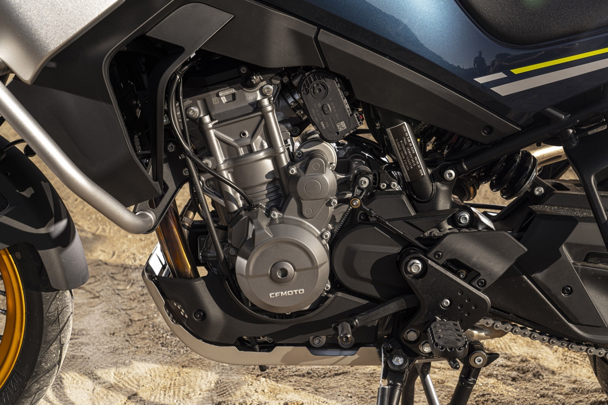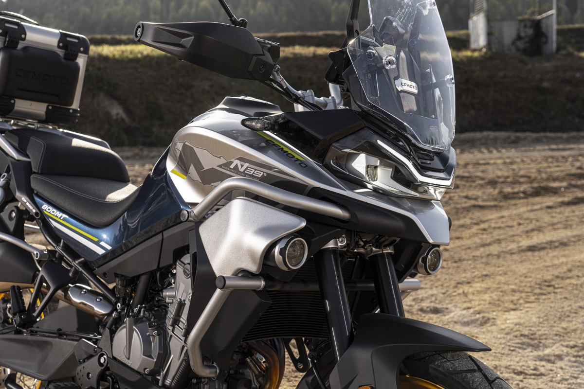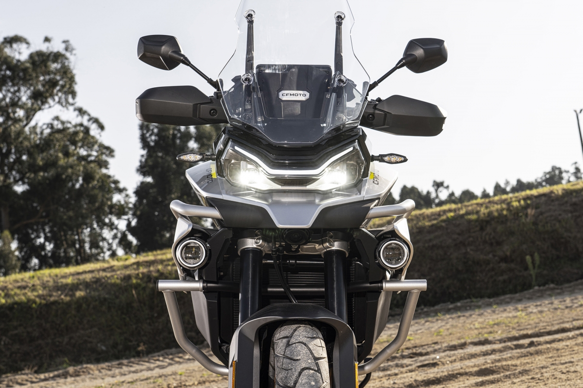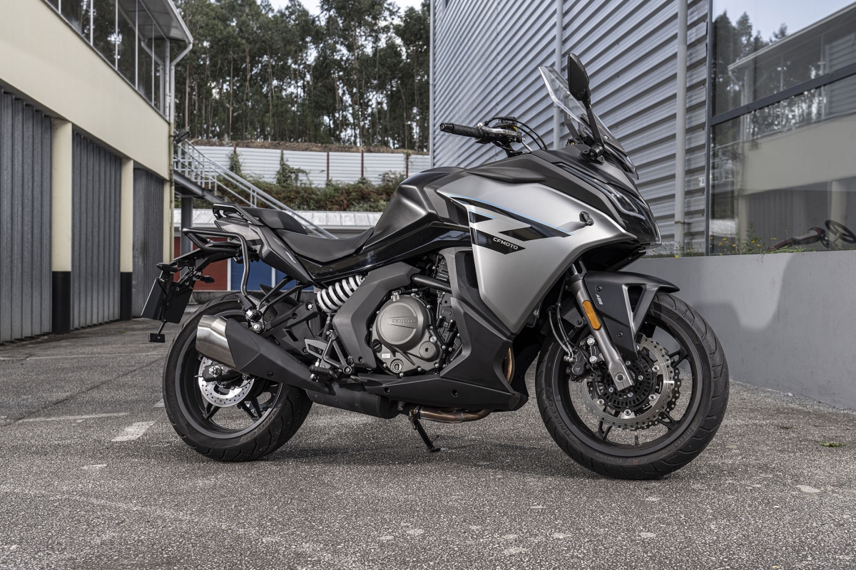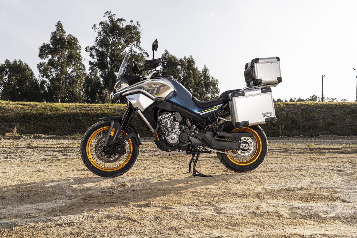 Em Portugal a CFMOTO é representada pela Puretech, uma empresa de Matosinhos, cidade onde foi feita a apresentação das motos da marca. A novidade mais aguardada era a 800MT, uma trail do segmento intermédio com o motor LC8, o mesmo bicilindrico paralelo com 95 cv que equipa a KTM 790. Com um design muito apurado, é normal a surpresa por parte de quem a vê ao esperar ver nela o logótipo de uma marca mais familiar, porventura europeia ou japonesa. Da extensa lista de funcionalidades e equipamento destacamos: ride-by-wire, modos de condução, quick-shifter, cruise-control, punhos e assento aquecidos, smart-key, luzes automáticas com DRL, luzes de nevoeiro, alarme antirroubo, sistema de navegação integrado e painel TFT de 7 polegadas. A suspensão e amortecedor são KYB (Kayaba), os travões com pinças radiais J.Juan (marca espanhola comprada pela Brembo), temos embraiagem assistida e deslizante e ainda vem montado um amortecedor de direção. Vai estar disponível em duas versões: com rodas em liga leve ou de raios e pneus de estrada ou perfil misto, mas com o mesmo diâmetro 19 e 17 polegadas. Por fim o depósito com 19 litros de capacidade garante uma excelente autonomia.