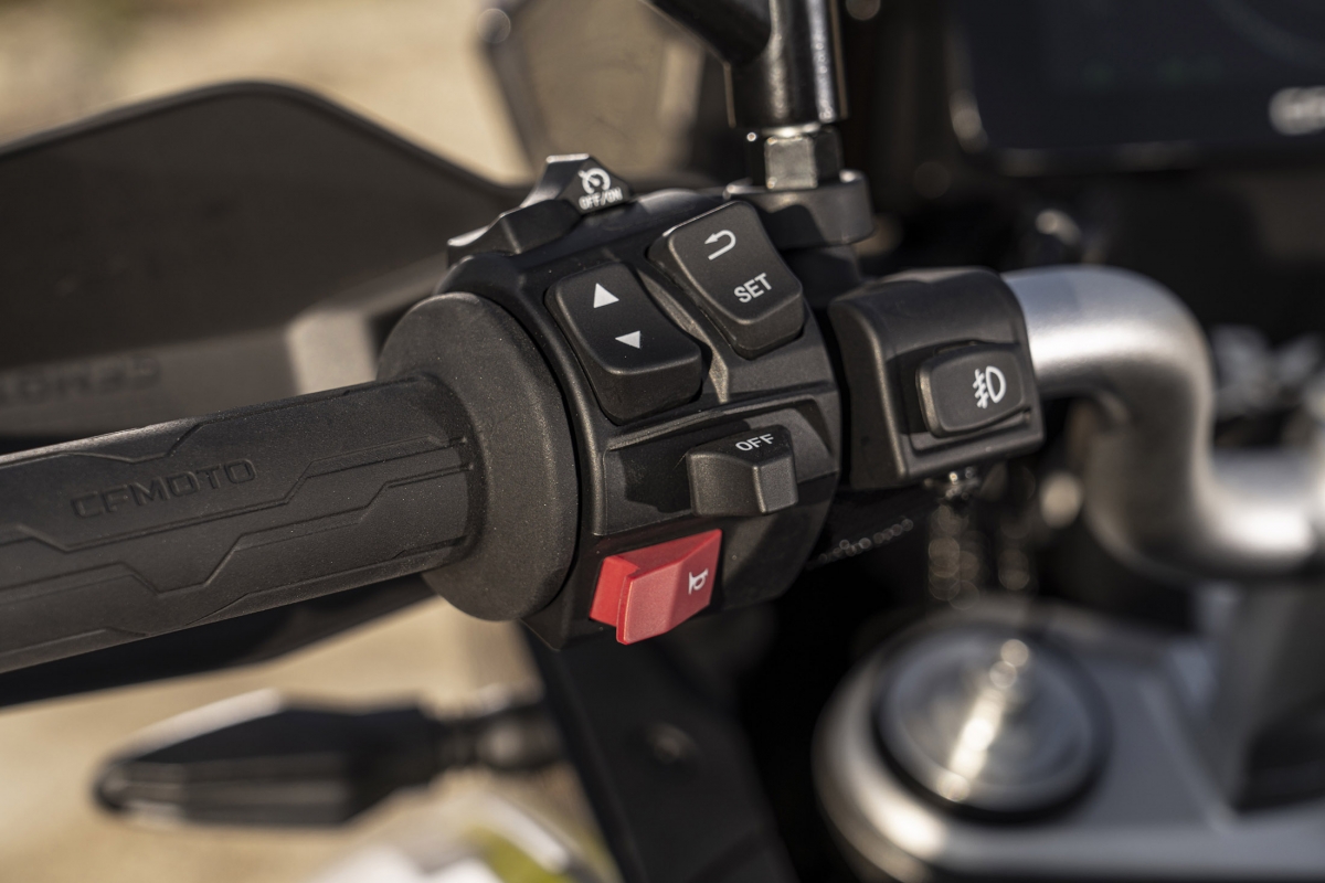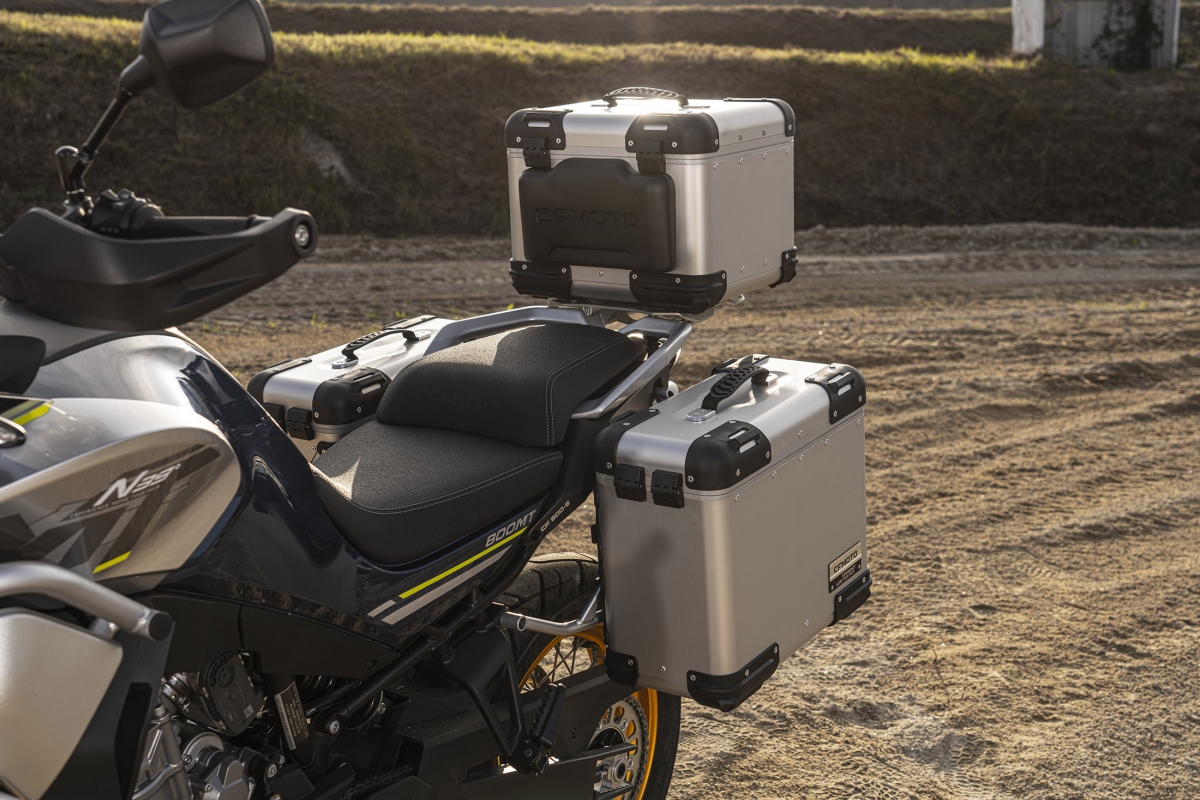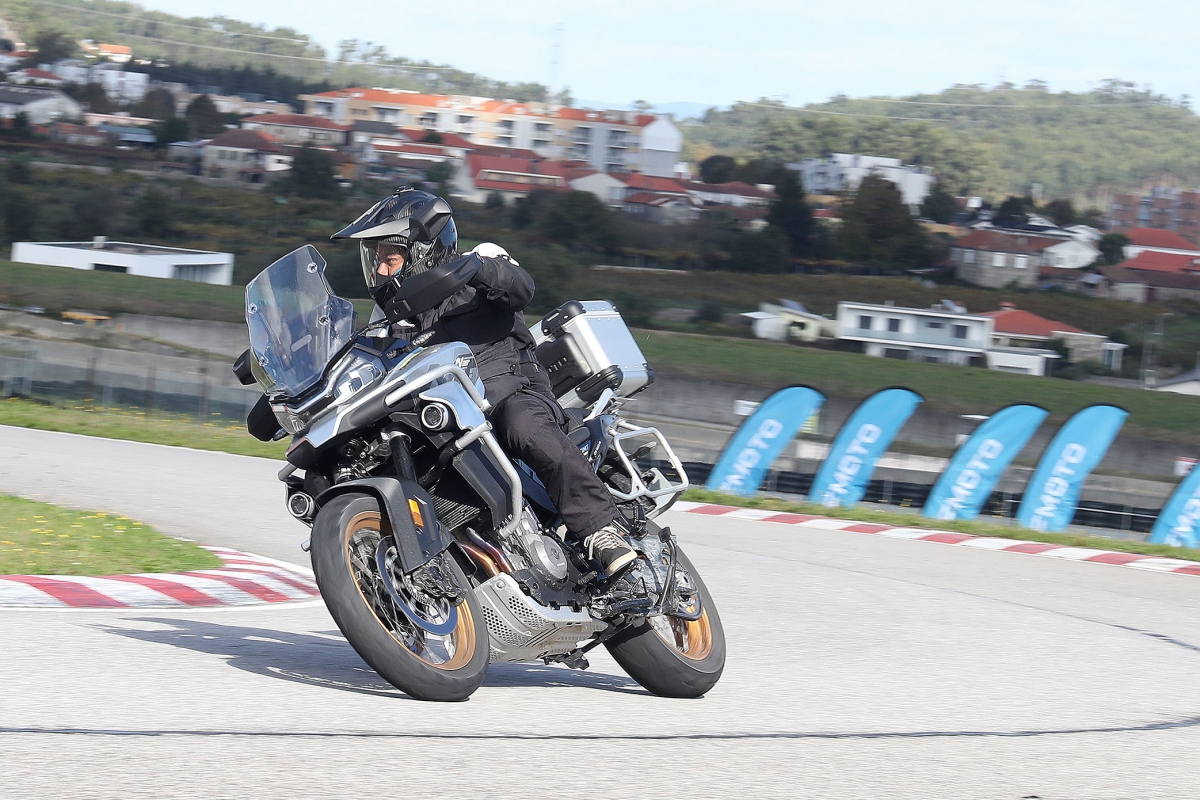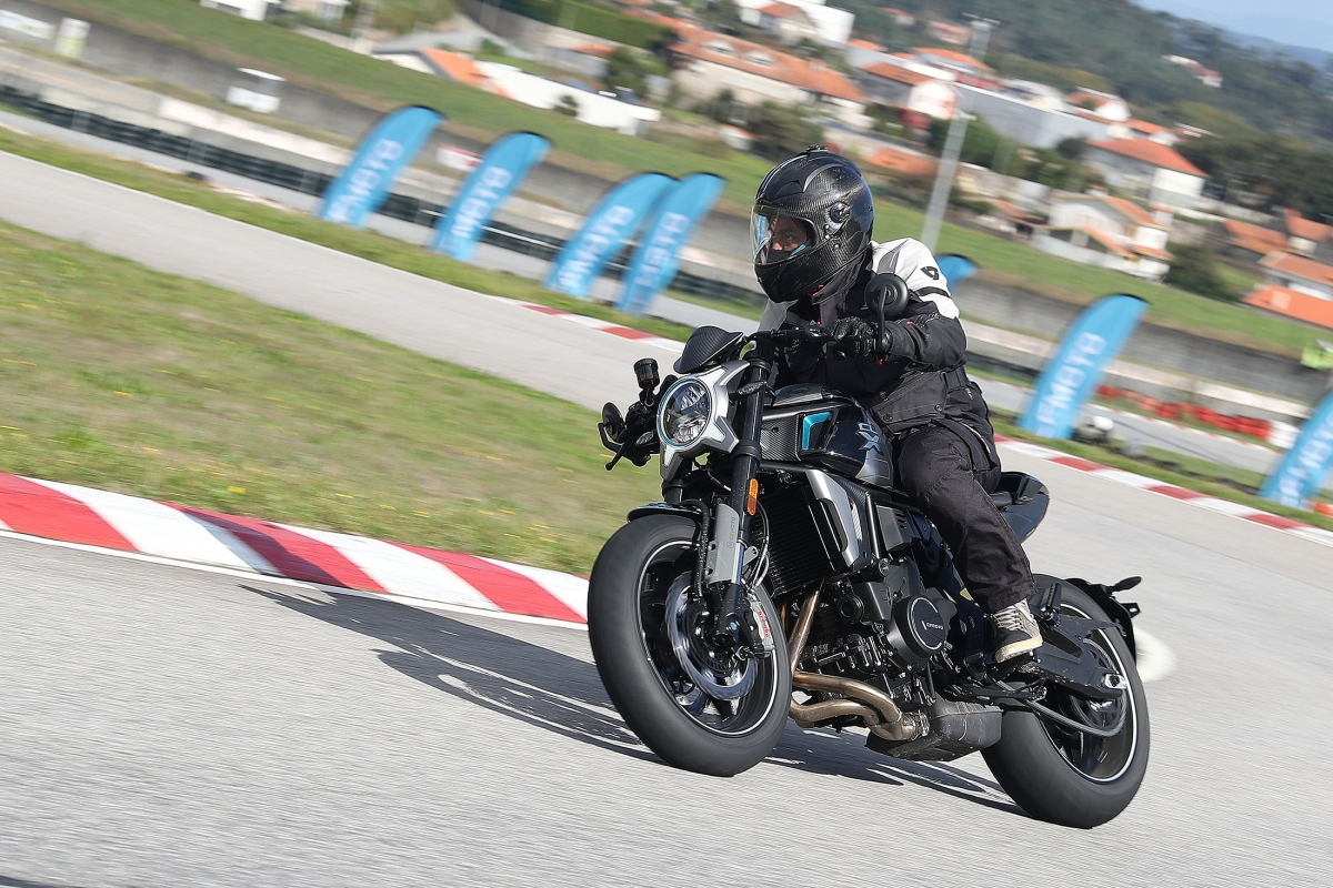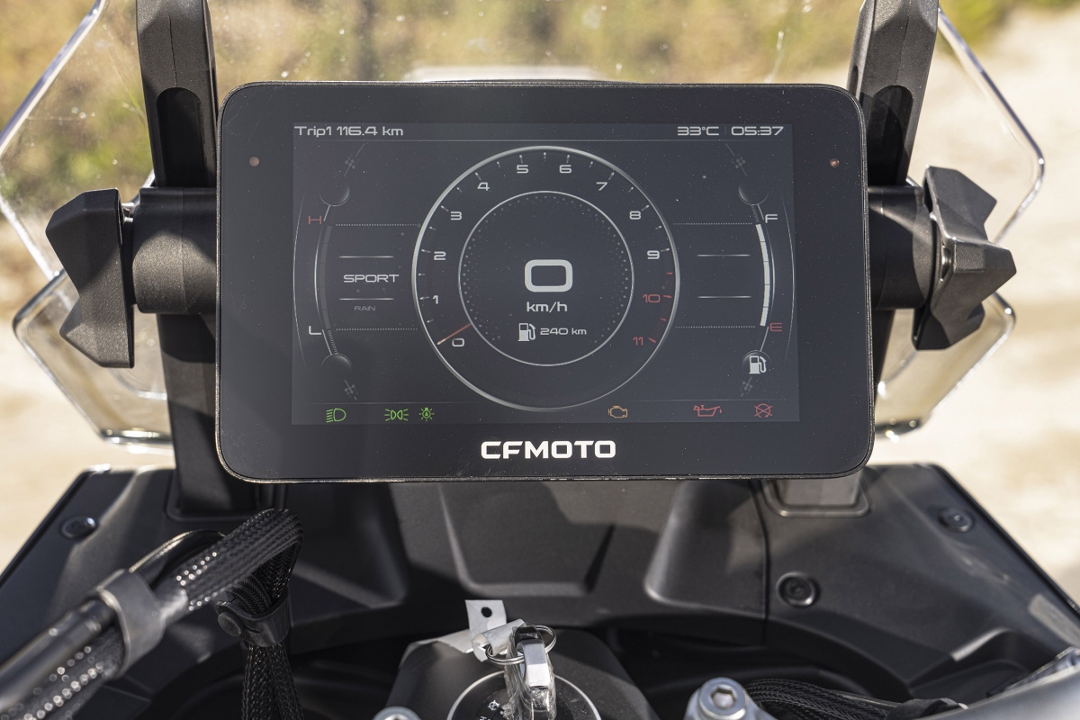 Em Portugal a CFMOTO é representada pela Puretech, uma empresa de Matosinhos, cidade onde foi feita a apresentação das motos da marca. A novidade mais aguardada era a 800MT, uma trail do segmento intermédio com o motor LC8, o mesmo bicilindrico paralelo com 95 cv que equipa a KTM 790. Com um design muito apurado, é normal a surpresa por parte de quem a vê ao esperar ver nela o logótipo de uma marca mais familiar, porventura europeia ou japonesa. Da extensa lista de funcionalidades e equipamento destacamos: ride-by-wire, modos de condução, quick-shifter, cruise-control, punhos e assento aquecidos, smart-key, luzes automáticas com DRL, luzes de nevoeiro, alarme antirroubo, sistema de navegação integrado e painel TFT de 7 polegadas. A suspensão e amortecedor são KYB (Kayaba), os travões com pinças radiais J.Juan (marca espanhola comprada pela Brembo), temos embraiagem assistida e deslizante e ainda vem montado um amortecedor de direção. Vai estar disponível em duas versões: com rodas em liga leve ou de raios e pneus de estrada ou perfil misto, mas com o mesmo diâmetro 19 e 17 polegadas. Por fim o depósito com 19 litros de capacidade garante uma excelente autonomia.