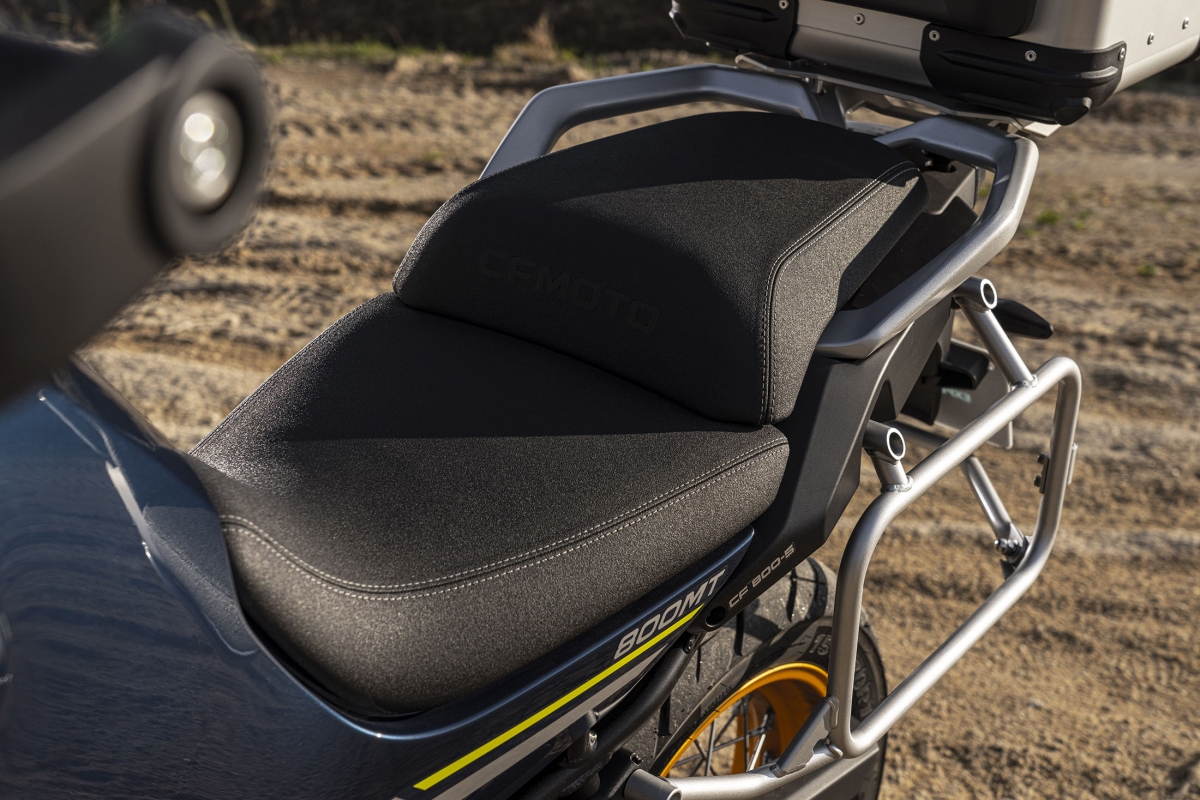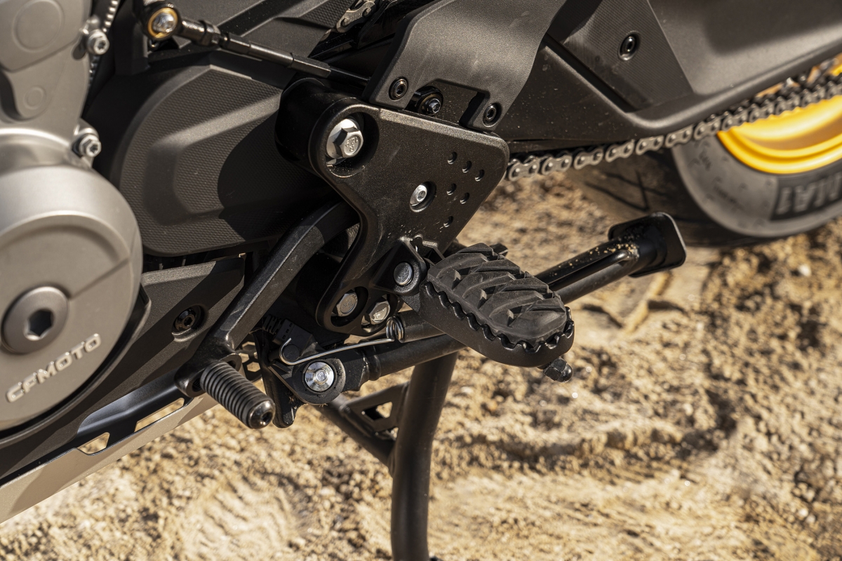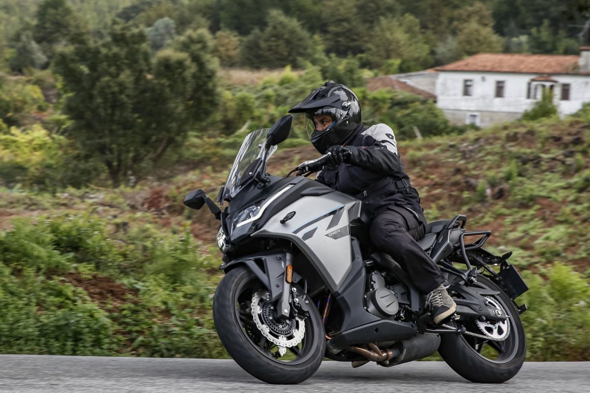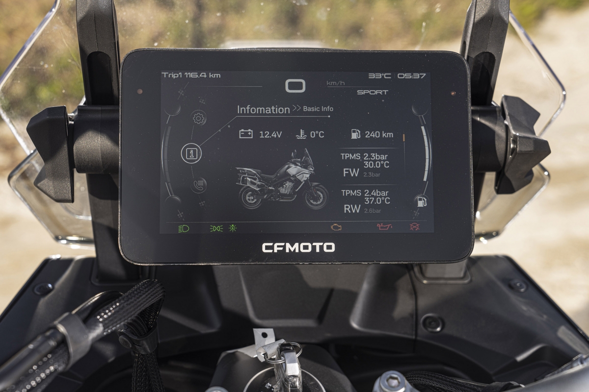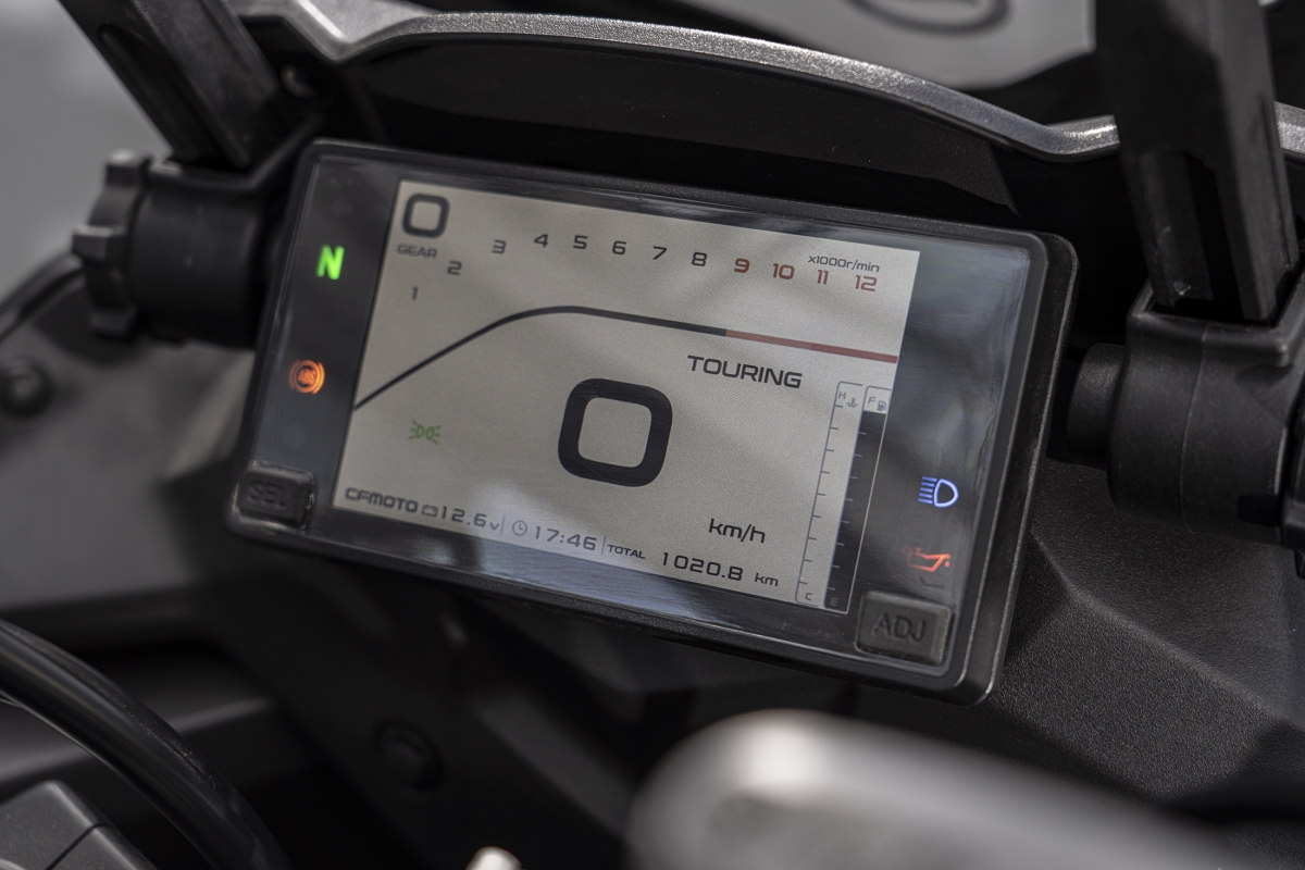 Em Portugal a CFMOTO é representada pela Puretech, uma empresa de Matosinhos, cidade onde foi feita a apresentação das motos da marca. A novidade mais aguardada era a 800MT, uma trail do segmento intermédio com o motor LC8, o mesmo bicilindrico paralelo com 95 cv que equipa a KTM 790. Com um design muito apurado, é normal a surpresa por parte de quem a vê ao esperar ver nela o logótipo de uma marca mais familiar, porventura europeia ou japonesa. Da extensa lista de funcionalidades e equipamento destacamos: ride-by-wire, modos de condução, quick-shifter, cruise-control, punhos e assento aquecidos, smart-key, luzes automáticas com DRL, luzes de nevoeiro, alarme antirroubo, sistema de navegação integrado e painel TFT de 7 polegadas. A suspensão e amortecedor são KYB (Kayaba), os travões com pinças radiais J.Juan (marca espanhola comprada pela Brembo), temos embraiagem assistida e deslizante e ainda vem montado um amortecedor de direção. Vai estar disponível em duas versões: com rodas em liga leve ou de raios e pneus de estrada ou perfil misto, mas com o mesmo diâmetro 19 e 17 polegadas. Por fim o depósito com 19 litros de capacidade garante uma excelente autonomia.