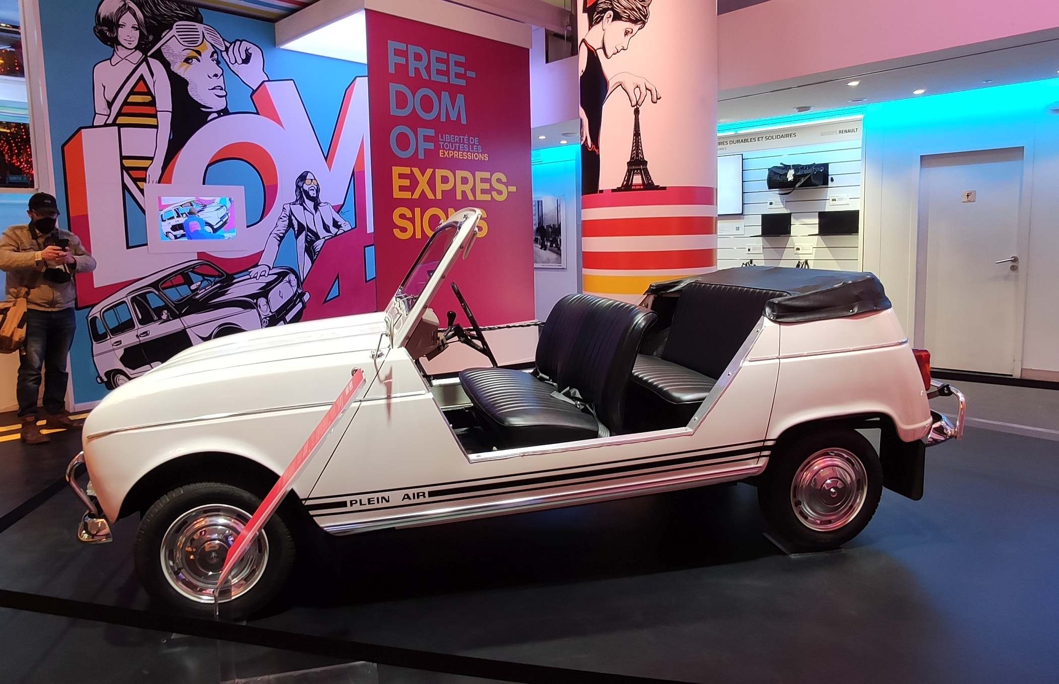 Com maior distância ao solo, tração integral e configuração descapotável, este modelo tinha por base a variante comercial F4, dispondo de duas alavancas a bordo para controlo de tração a um ou dois eixos. A unidade exposta, embora decorada com vinil verde e grafismos que evocam a participação na série de televisão ‘Les Chévaliers do Ciel’, tem cor branca, pertencendo a um dos responsáveis da Renault Classic.