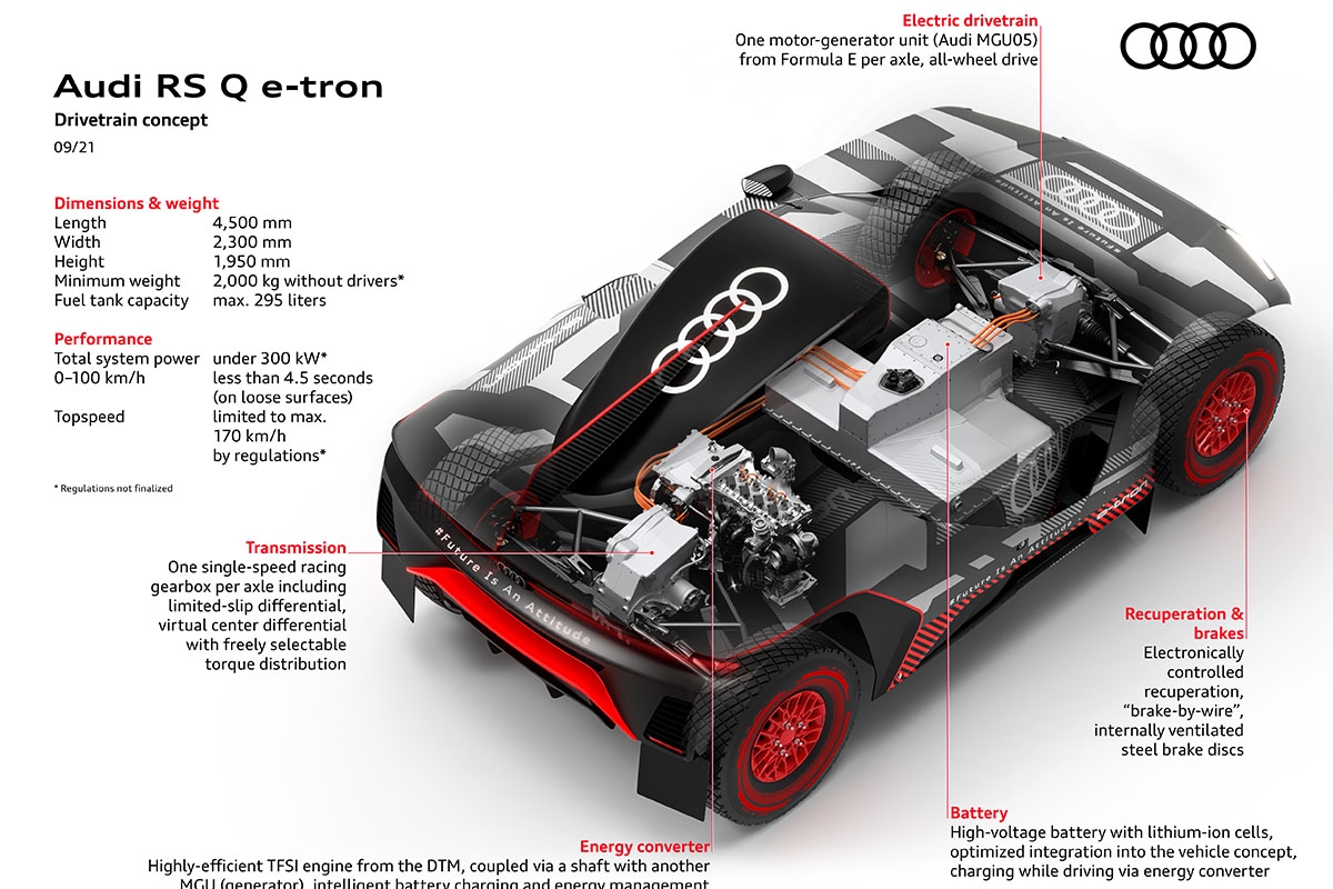 Por ser uma prova extremamente complexa e longa, sem paragens intermediárias durante cada troço cronometrado (algumas etapas chegam a ter mais de 800 km num só dia), foi necessário integrar um motor de combustão interna TFSI para fornecer energia para bateria. É um motor turbo a gasolina de quatro cilindros e 2 litros derivado do R5 campeão no DTM em 2020. A rotação varia de 4500 rpm a 6000 rpm, onde se consegue a gama mais eficiente de binário e potência. Parte da energia para recarregar as baterias é recuperada durante a travagem de forma a aumentar ainda mais a autonomia.