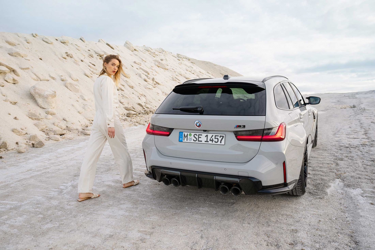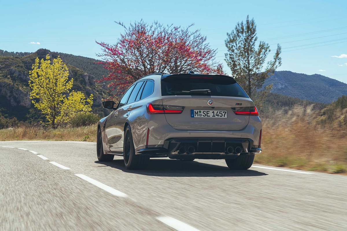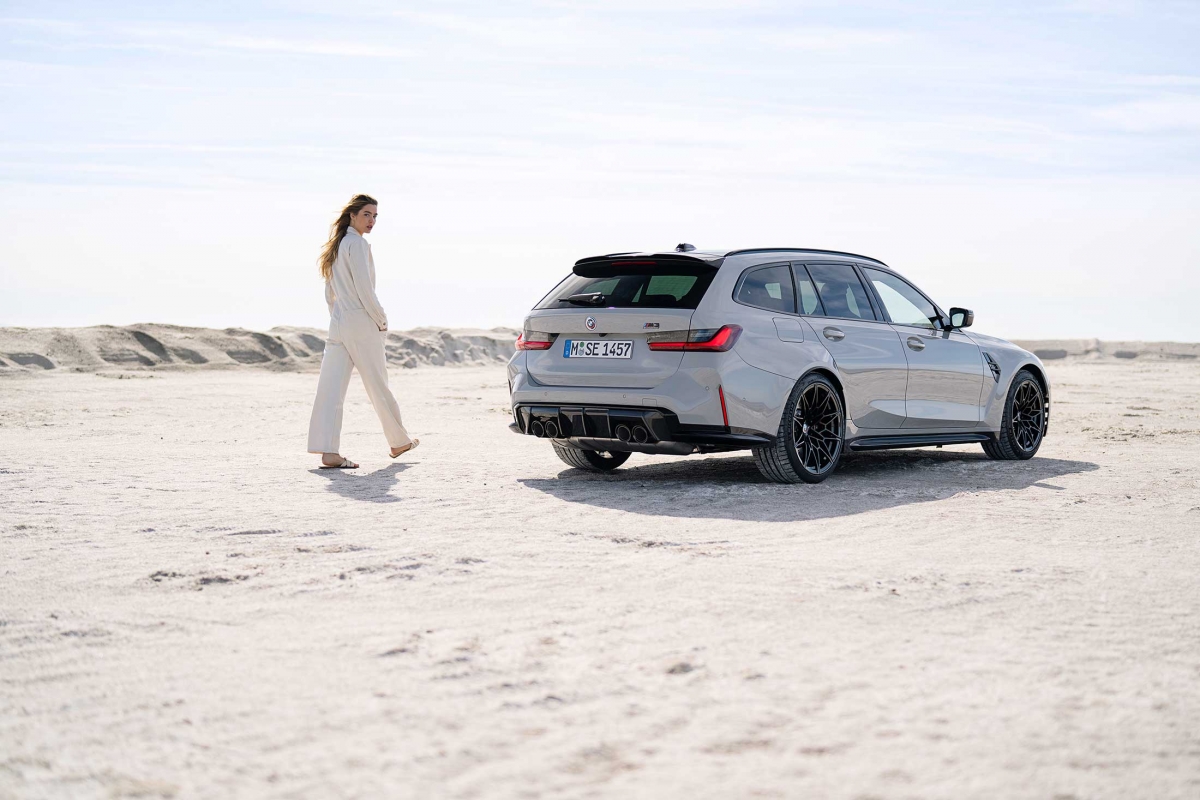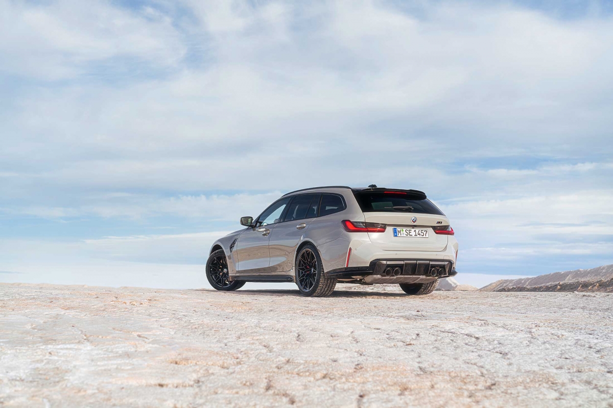 Em termos estéticos, se excluirmos a linha do tejadilho estendida e a traseira vertical, o novo M3 Touring é, de certa forma, semelhante à berlina em que se baseia, adicionando uns pozinhos aqui e ali. Principalmente, as cavas das rodas são mais largas, os para-choques e embaladeiras são feitos à medida e o sistema de escape de quatro ponteiras promete oferecer todo o barulho que se procura. Ainda para mais, o novo Touring vem equipado com jantes M Sport de 19 polegadas à frente, e de 20 polegadas no eixo traseiro.