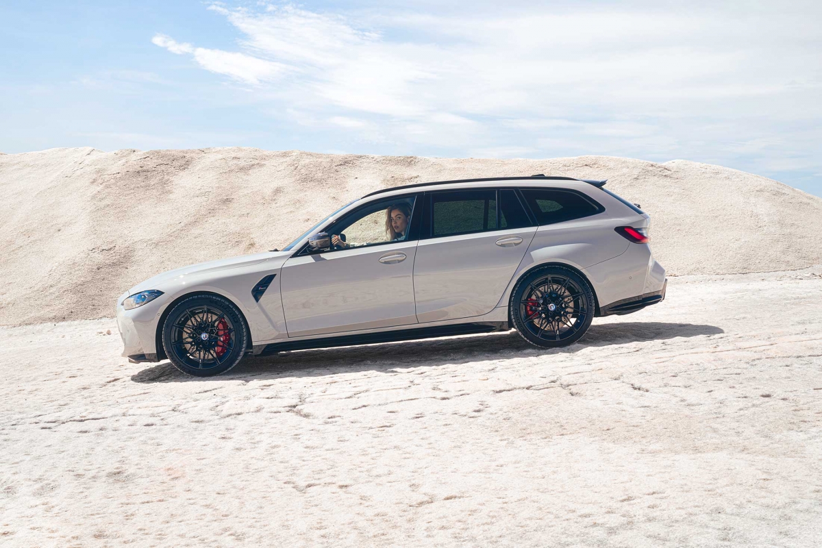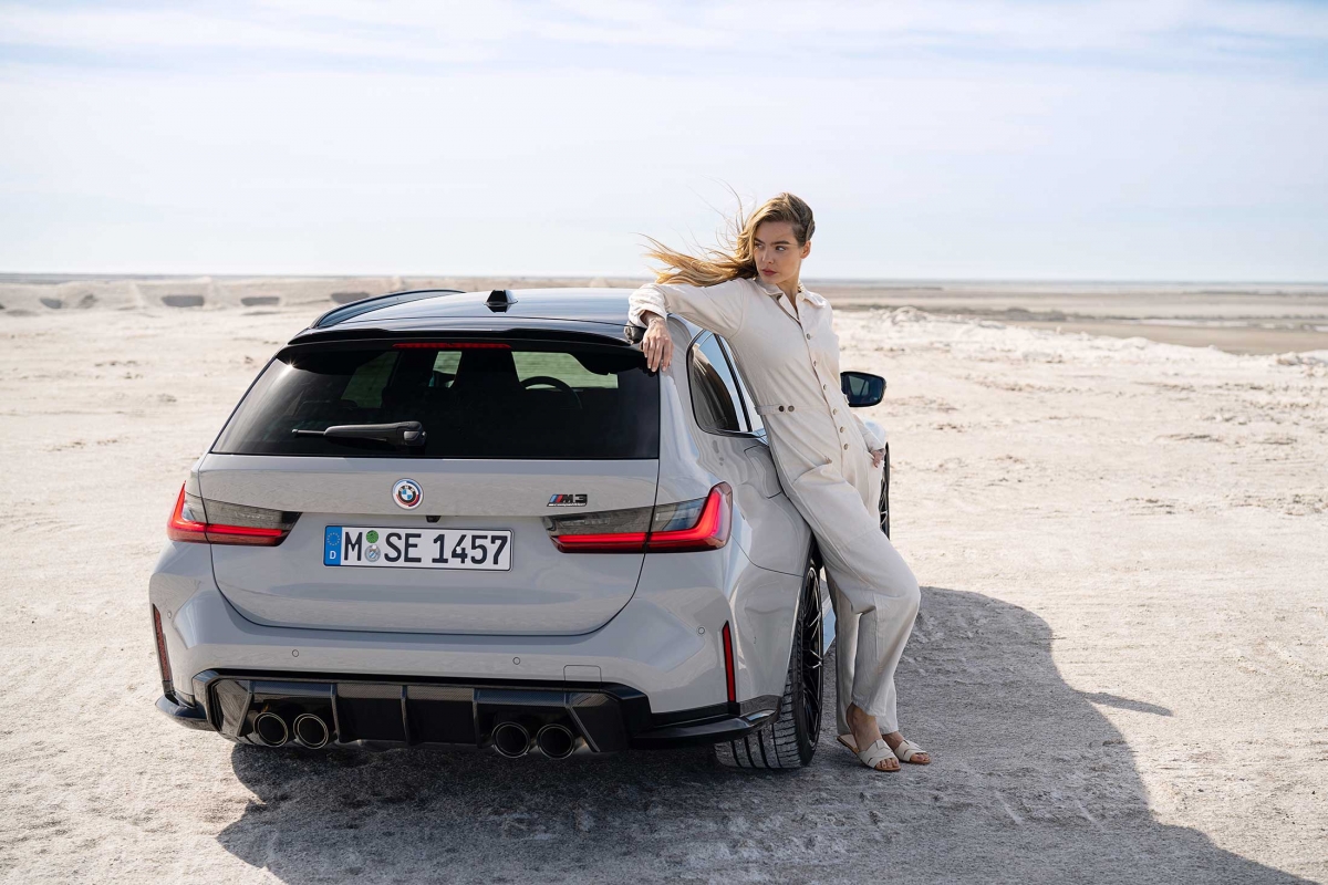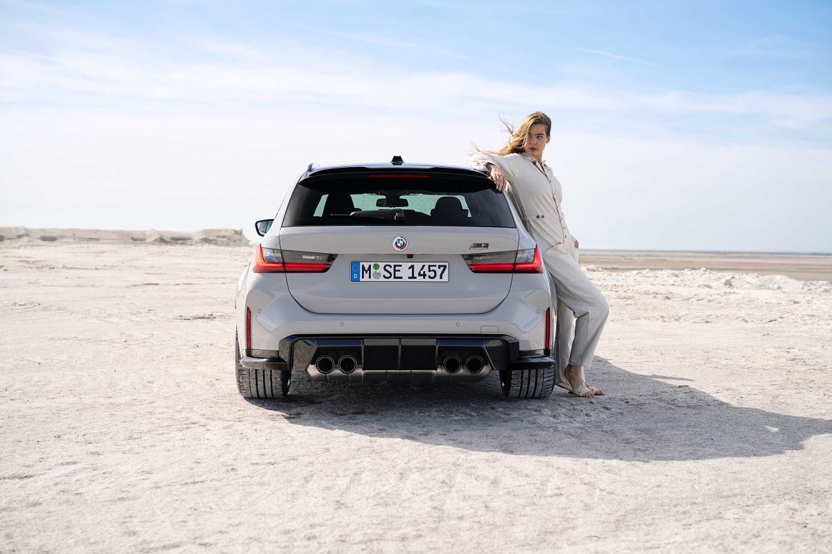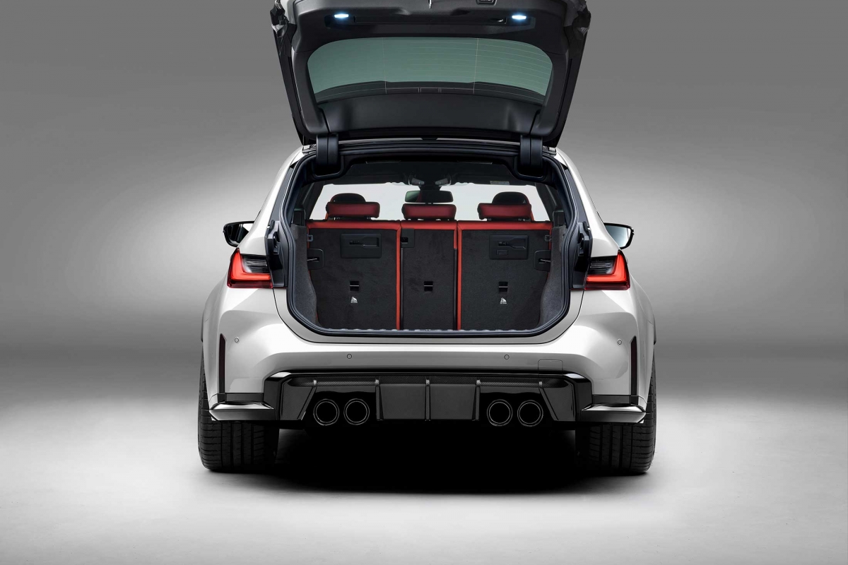 Em termos estéticos, se excluirmos a linha do tejadilho estendida e a traseira vertical, o novo M3 Touring é, de certa forma, semelhante à berlina em que se baseia, adicionando uns pozinhos aqui e ali. Principalmente, as cavas das rodas são mais largas, os para-choques e embaladeiras são feitos à medida e o sistema de escape de quatro ponteiras promete oferecer todo o barulho que se procura. Ainda para mais, o novo Touring vem equipado com jantes M Sport de 19 polegadas à frente, e de 20 polegadas no eixo traseiro.