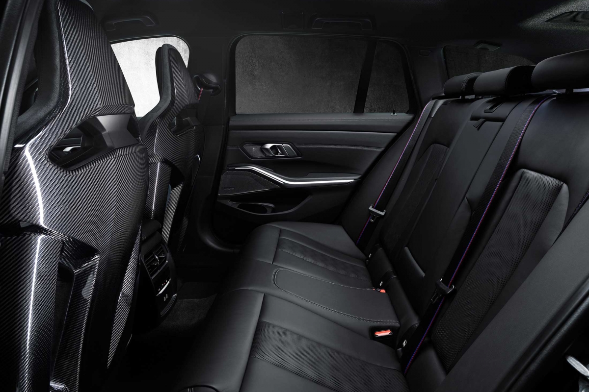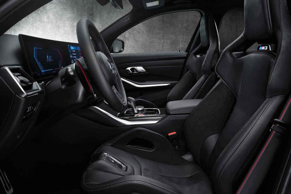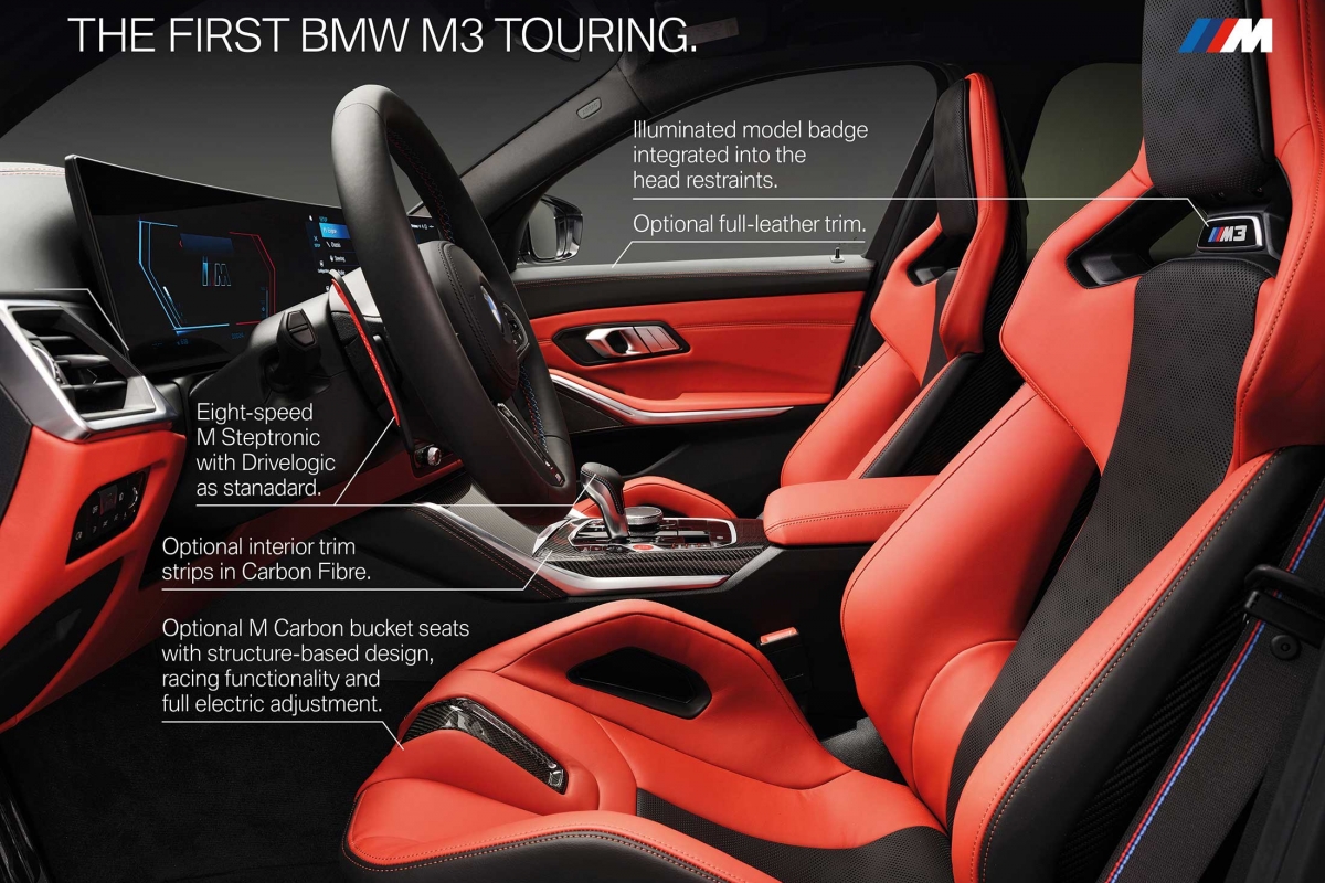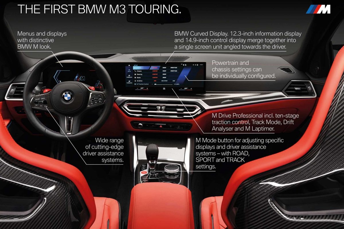 O interior assemelha-se ainda mais ao modelo base, com uma configuração familiar dominada por um novo ecrã de infoentretenimento de 14,9 polegadas com o mais recente sistema operacional iDrive de oitava geração e um cluster de 12,3 polegadas onde se encontram os mostradores. Tal como no M3 Saloon, o Touring oferece uma sensação de condução desportiva através de pormenores em vermelho espalhados pelo volante e nos assentos que, opcionalmente, podem ser fabricados inteiramente em fibra de carbono.