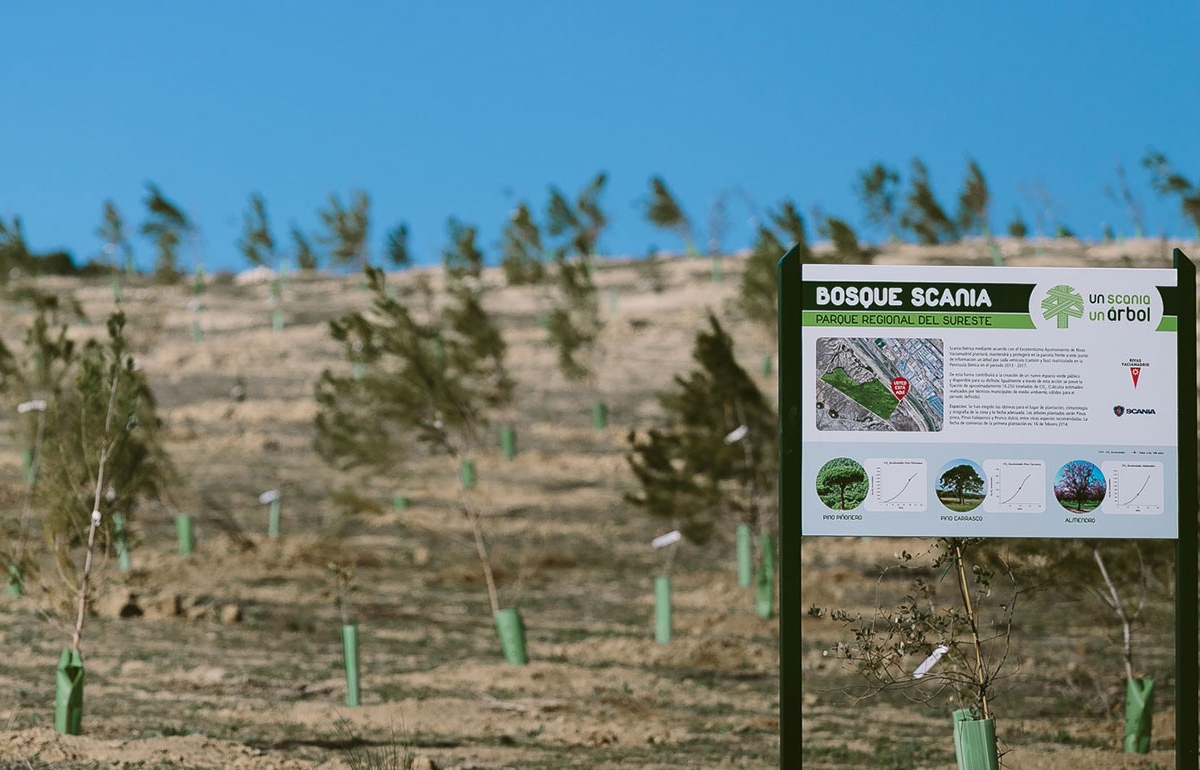 Em 2013 nasceu o projeto “Um Scania, Uma Árvore”, através do qual a marca se comprometeu a plantar e cuidar durante no mínimo 100 anos, uma árvore por cada veículo registado em Espanha e Portugal. Essas árvores são plantadas no Parque Regional del Sureste, no município de Rivas-Vaciamadrid, em Madrid, numa zona conhecida como Bosque Scania. Os clientes da Scania Ibérica estão a receber os seus certificados personalizados em março para as árvores plantadas em seu nome com base nas suas unidades registadas no exercício financeiro de 2021.