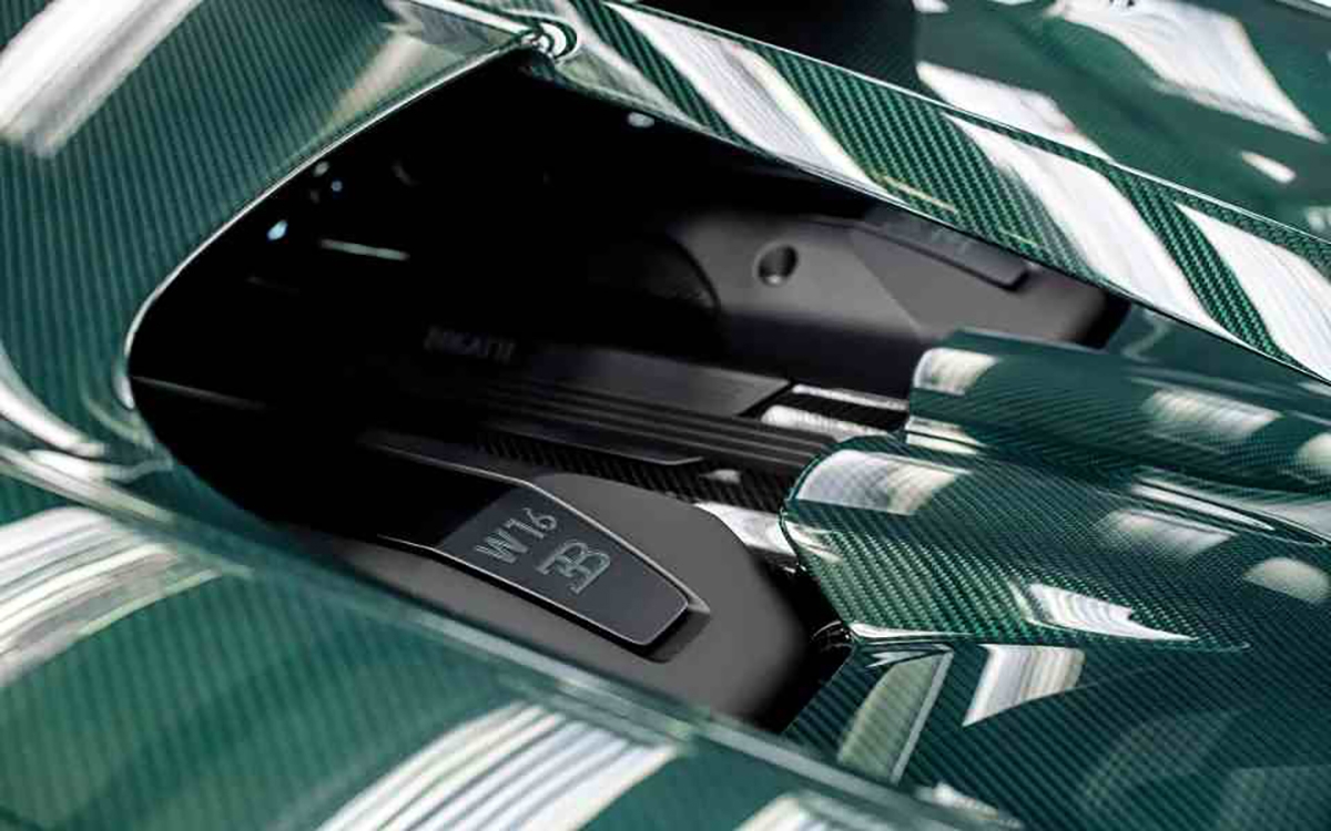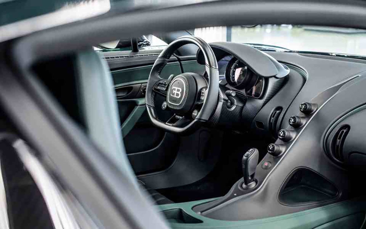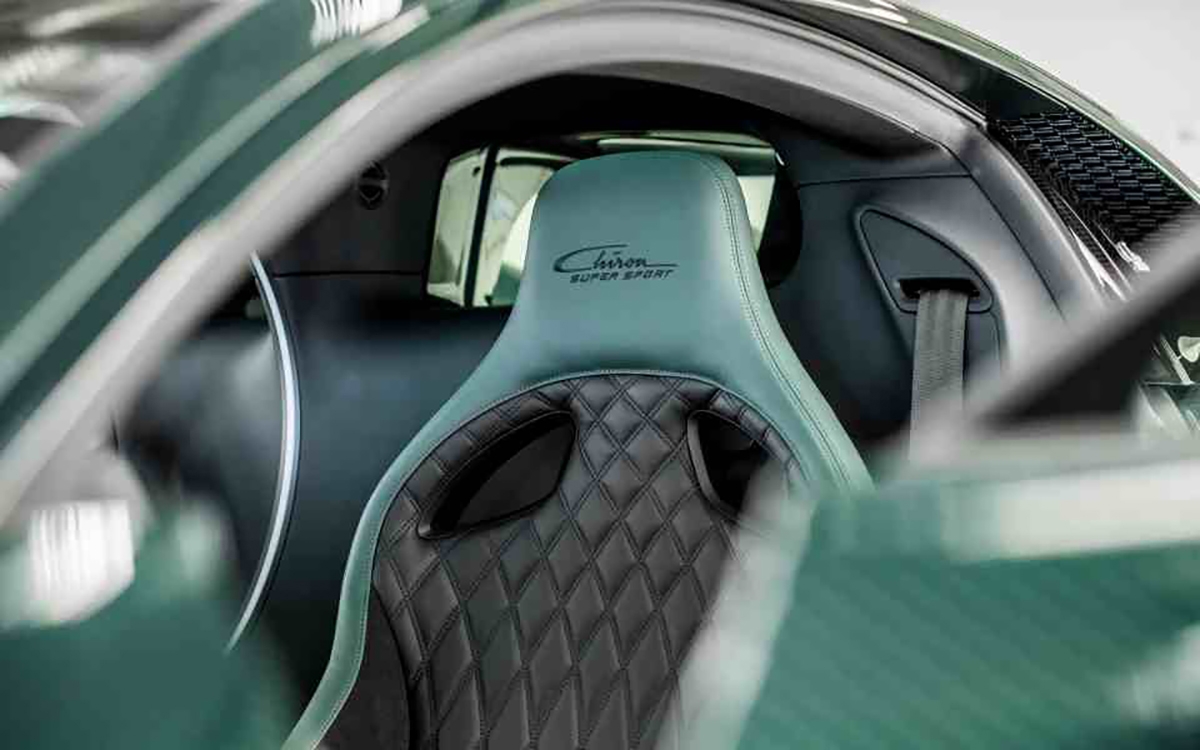 Como não há dois Chiron iguais, a 400ª unidade não é exceção. O superdesportivo tem uma carroçaria em fibra de carbono com pintura em cor verde escolhida pelo cliente.