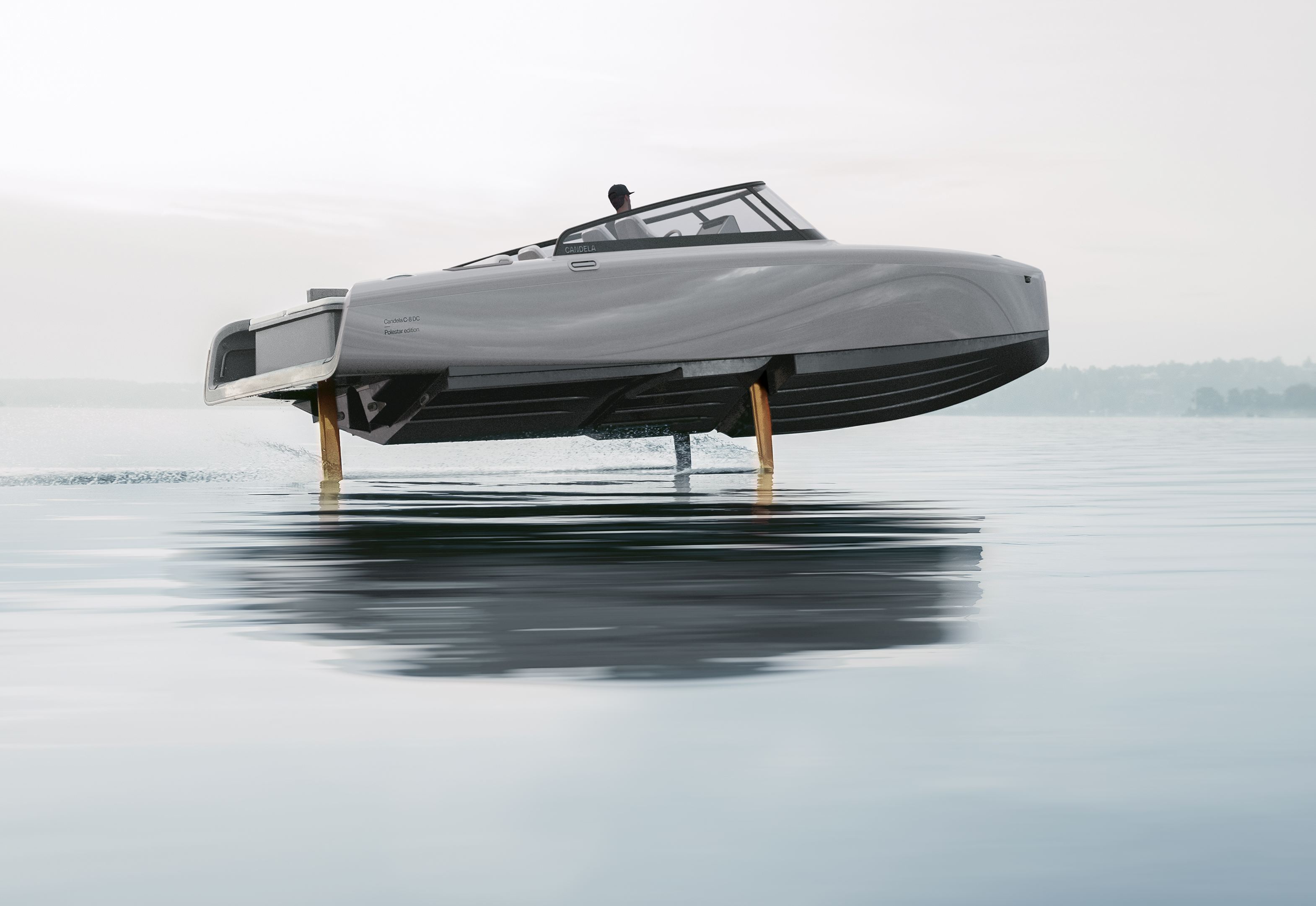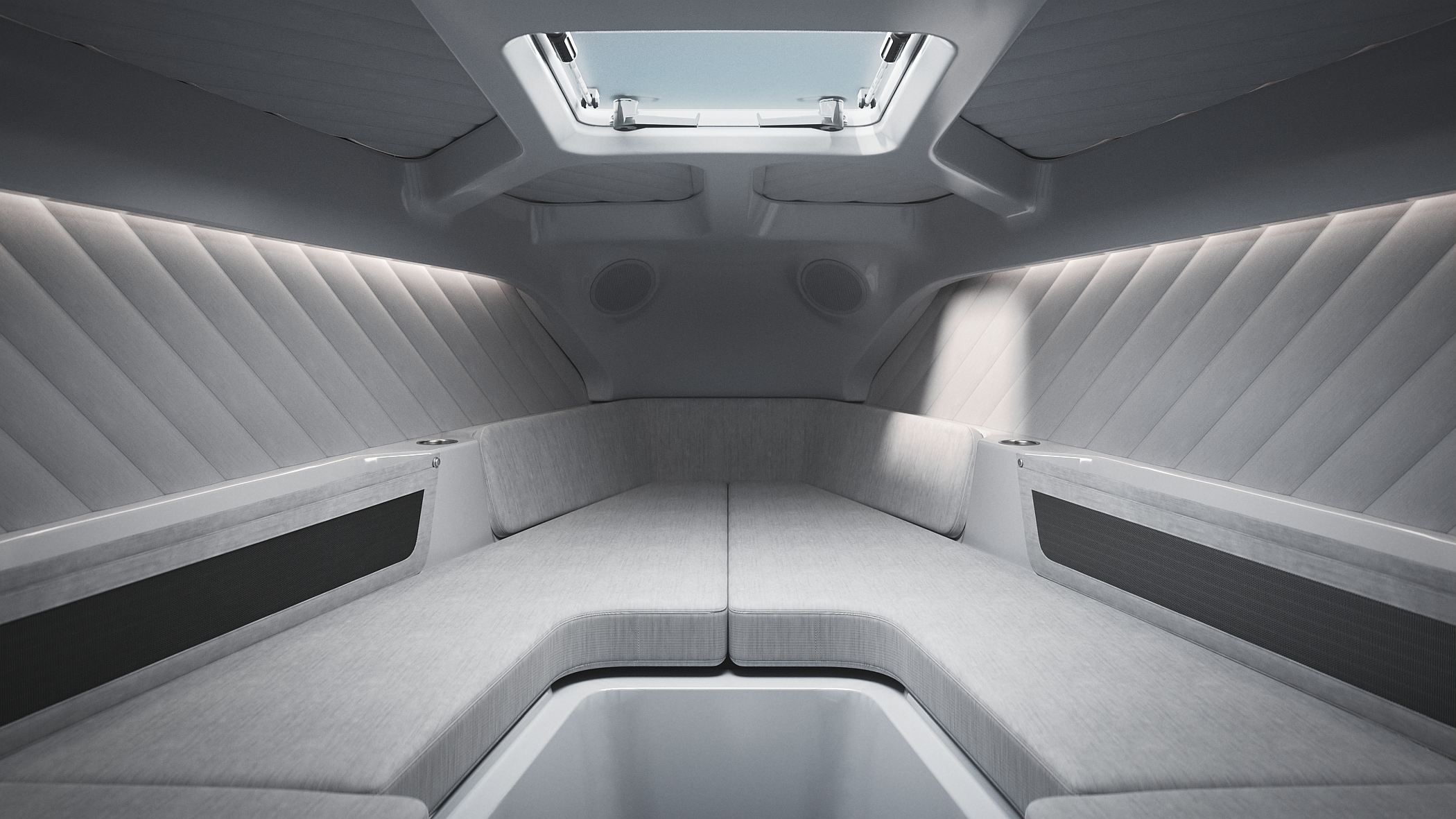 No caso da imagem, as sugestões de design personalizado incluem uma nova cor cinzenta-clara sólida, estofos dos bancos especialmente concebidos e hidrofólios pintados no icónico “swedish gold”. Uma nova cor exterior cinzenta sólida complementada por um tom cinzento mais claro nas áreas interiores dá ao barco um aspeto elegante e uniforme que é reforçado pela utilização do mesmo tecido certificado em todo o lado, desde os assentos às almofadas e espreguiçadeiras passando pelos painéis das paredes e pelo tejadilho.