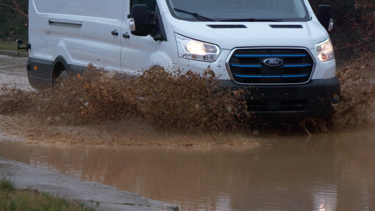A durabilidade do conjunto de baterias do E-Transit, do motor elétrico e da suspensão traseira específica foram testados conduzindo repetidamente o novo modelo através de zonas cheias de lama e sal.