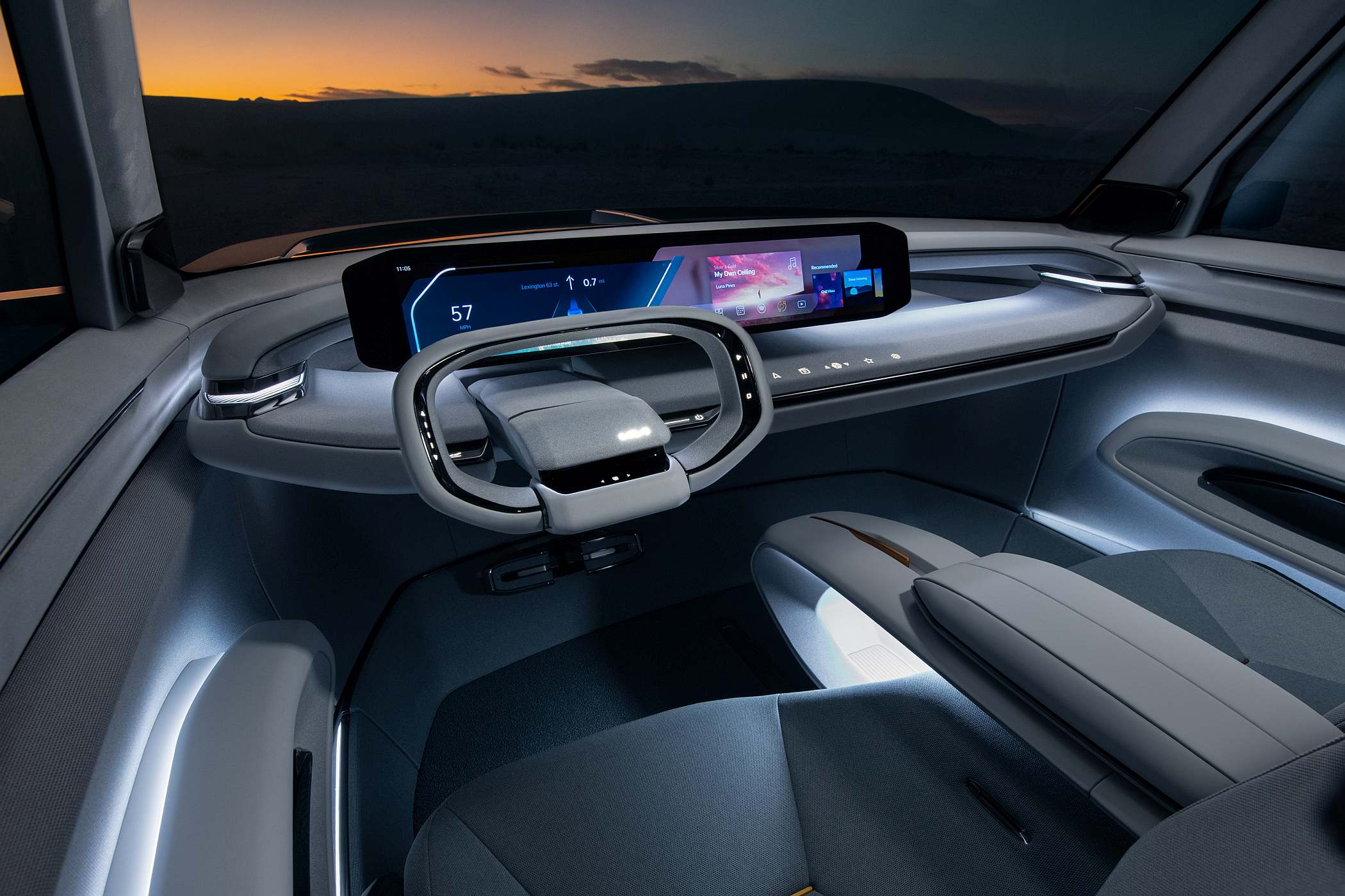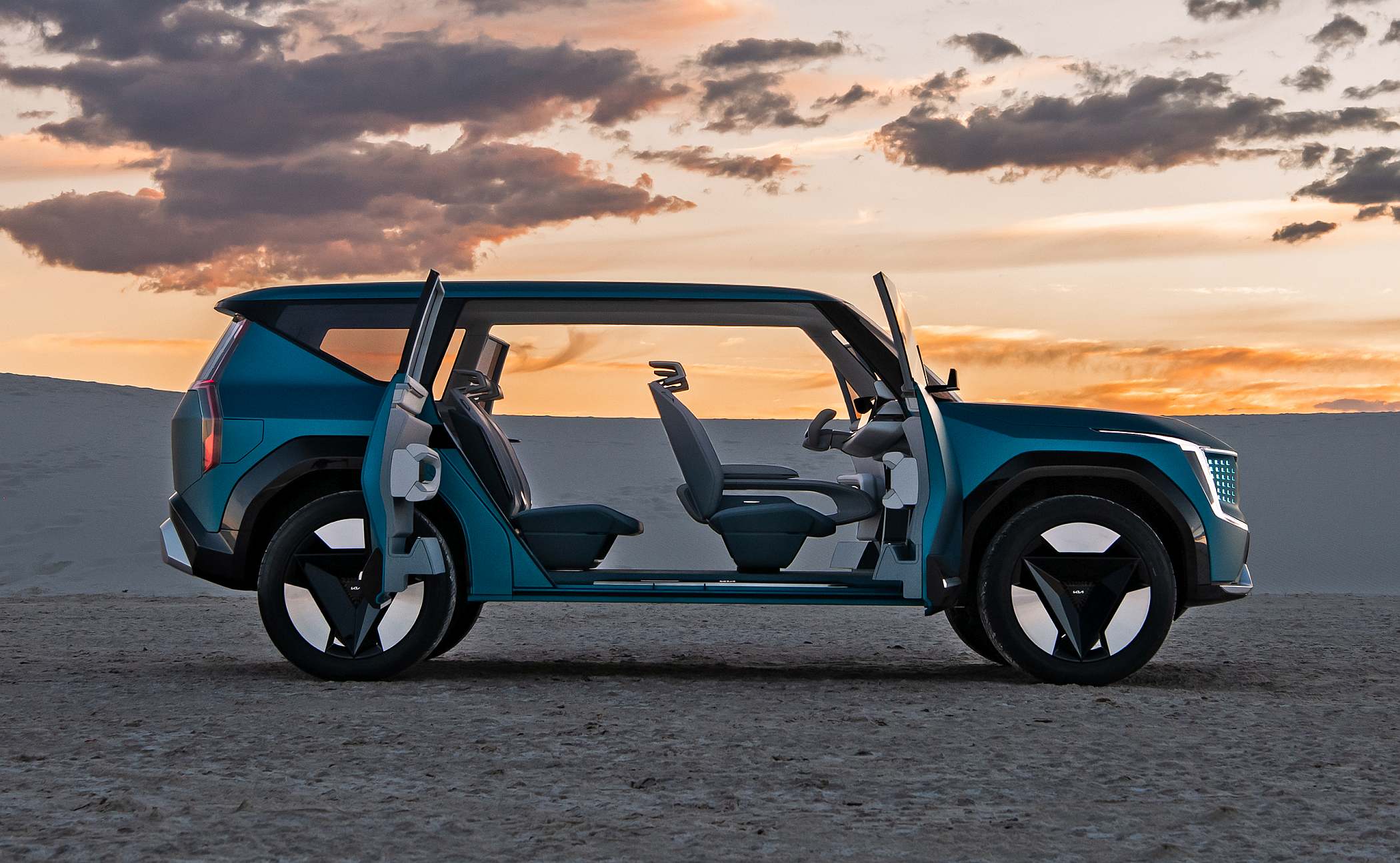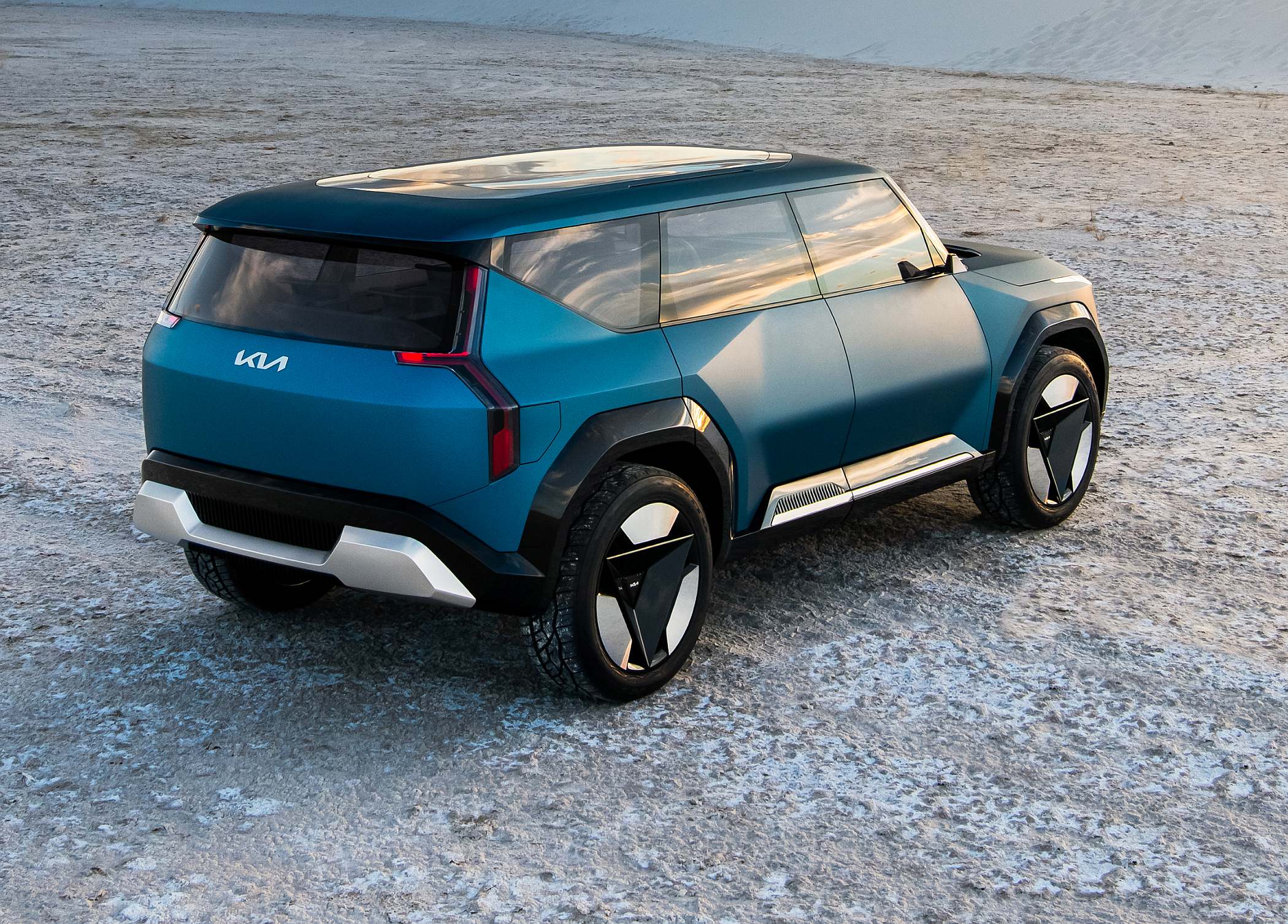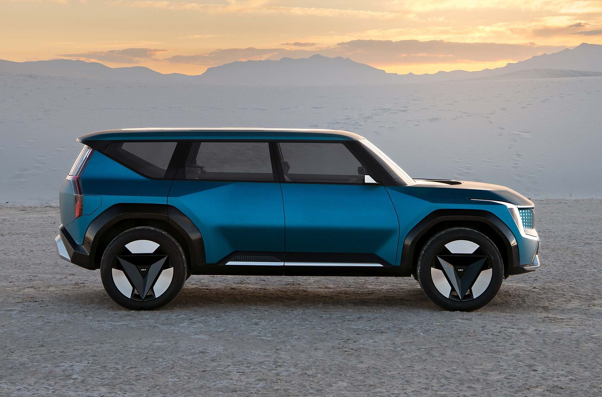 A baixa altura da parte lateral da carroçaria gera um impacto máximo e instantâneo com os volumes dos guarda-lamas retilíneos e cristalinos, que estão colocados num plano muito mais elevado. Esta baixa altura lateral faz com que a zona dos guarda-lamas do Concept EV9 sobressaia, o que resulta numa sólida postura de SUV.