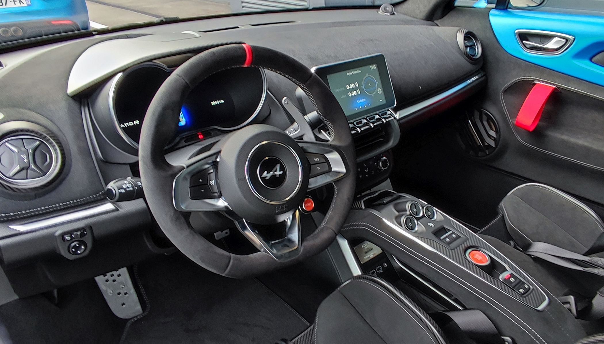 Sentados no A110 R, há que encontrar uma boa posição de condução, ajustando apenas o posicionamento do volante e a distância do banco que, integralmente em carbono, não tem ajuste de costas. Felizmente, é fácil encontrar a melhor posição para se atacar o circuito. Depois, é apertar o cinto de seis pontos e estamos prontos para a pista bem apertados na bacquet da Sabelt.