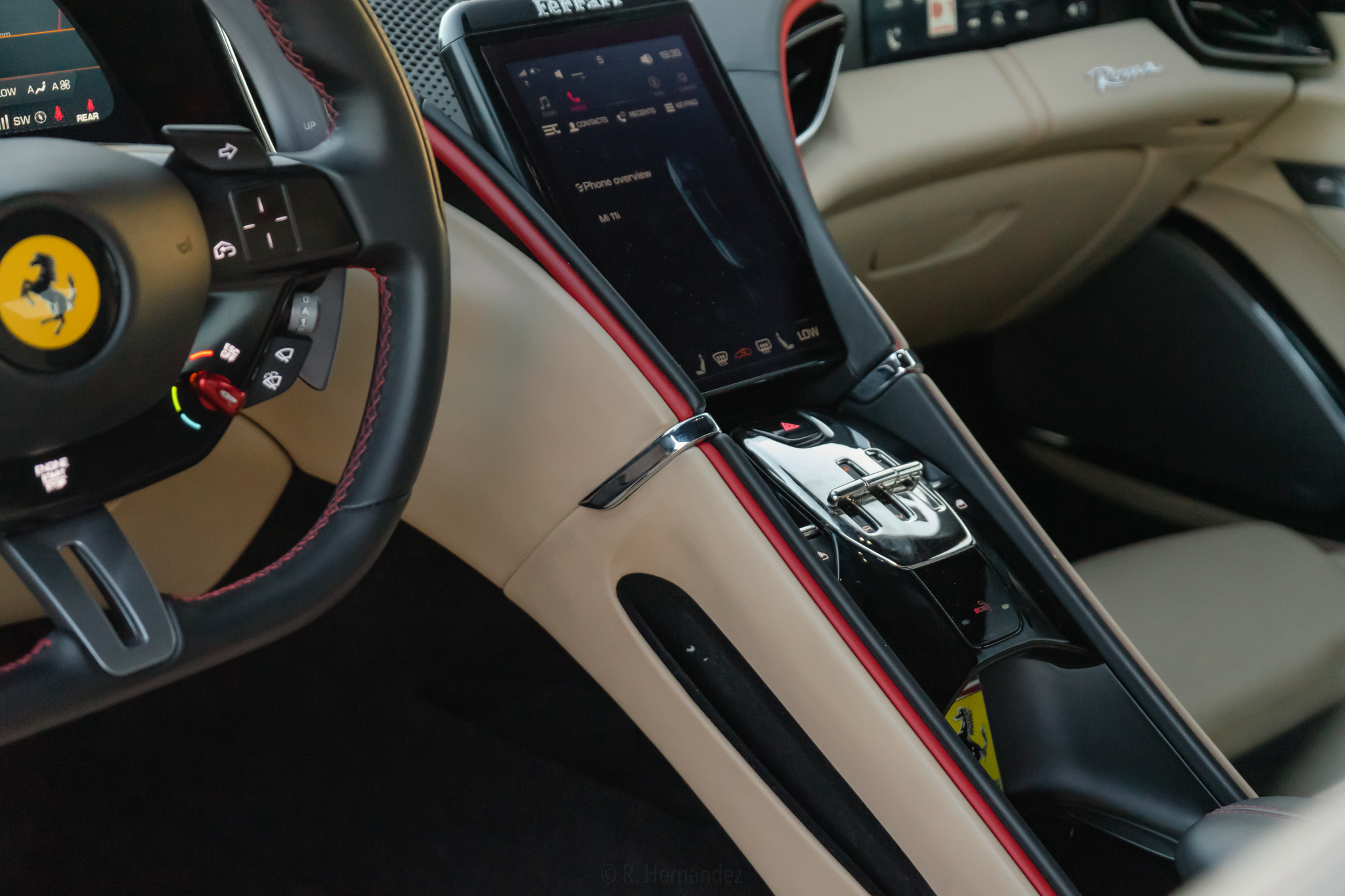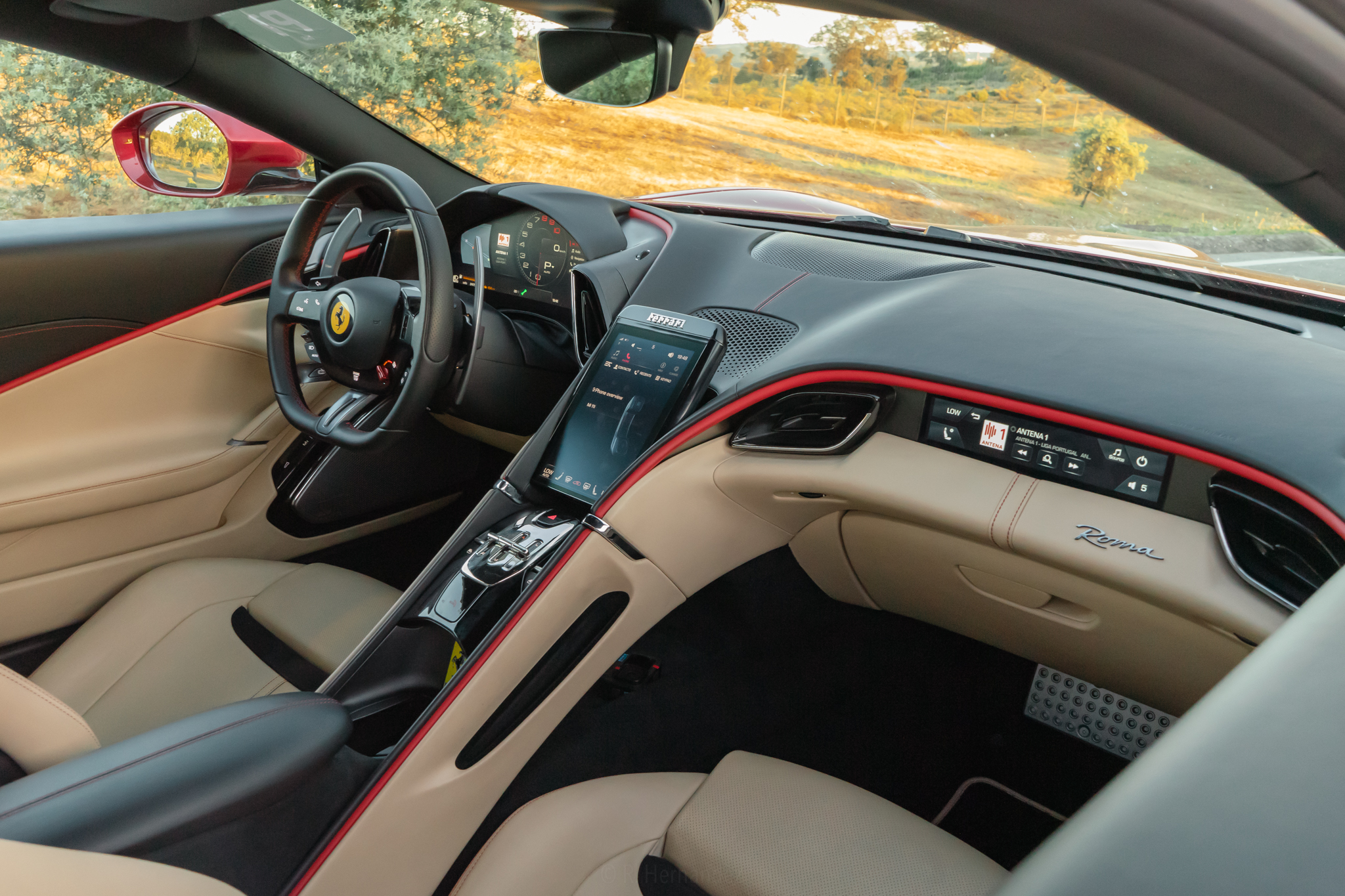 Quando nos sentamos no Roma, somos apresentados pessoalmente a um cockpit cada vez mais digital e que tem dois lugares muito bem vincados à frente, ‘separados’ por uma consola central elevada, onde estão alguns dos principais comandos – dos vidros elétricos ou da caixa de velocidades (‘Auto’ ou ‘Manual’), bem como o de ativação do modo de ‘Launch Control‘.