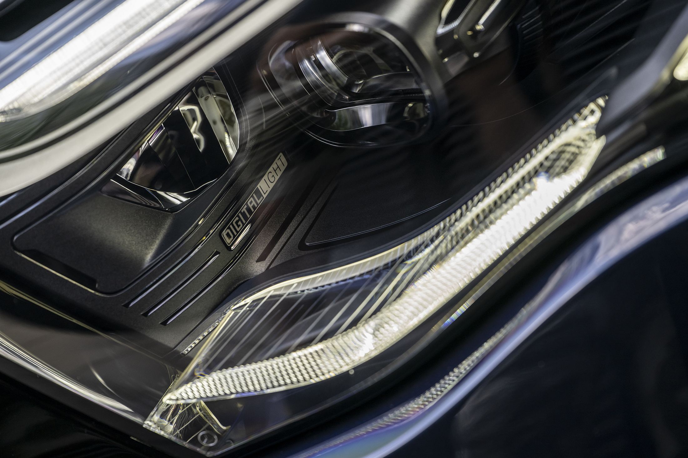 O novo Classe E está equipado de série com faróis LED de alta performance, podendo receber tecnologia Digital Light em opção, com ou sem função de projeção, para maiores funcionalidades à noite. Como característica comum, as luzes diurnas revelam a forma de uma sobrancelha.