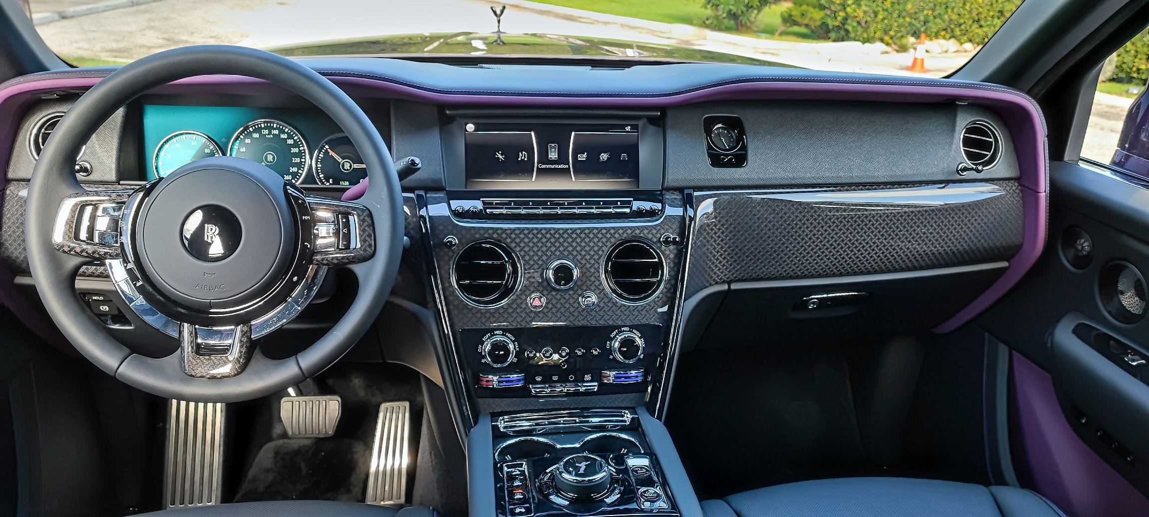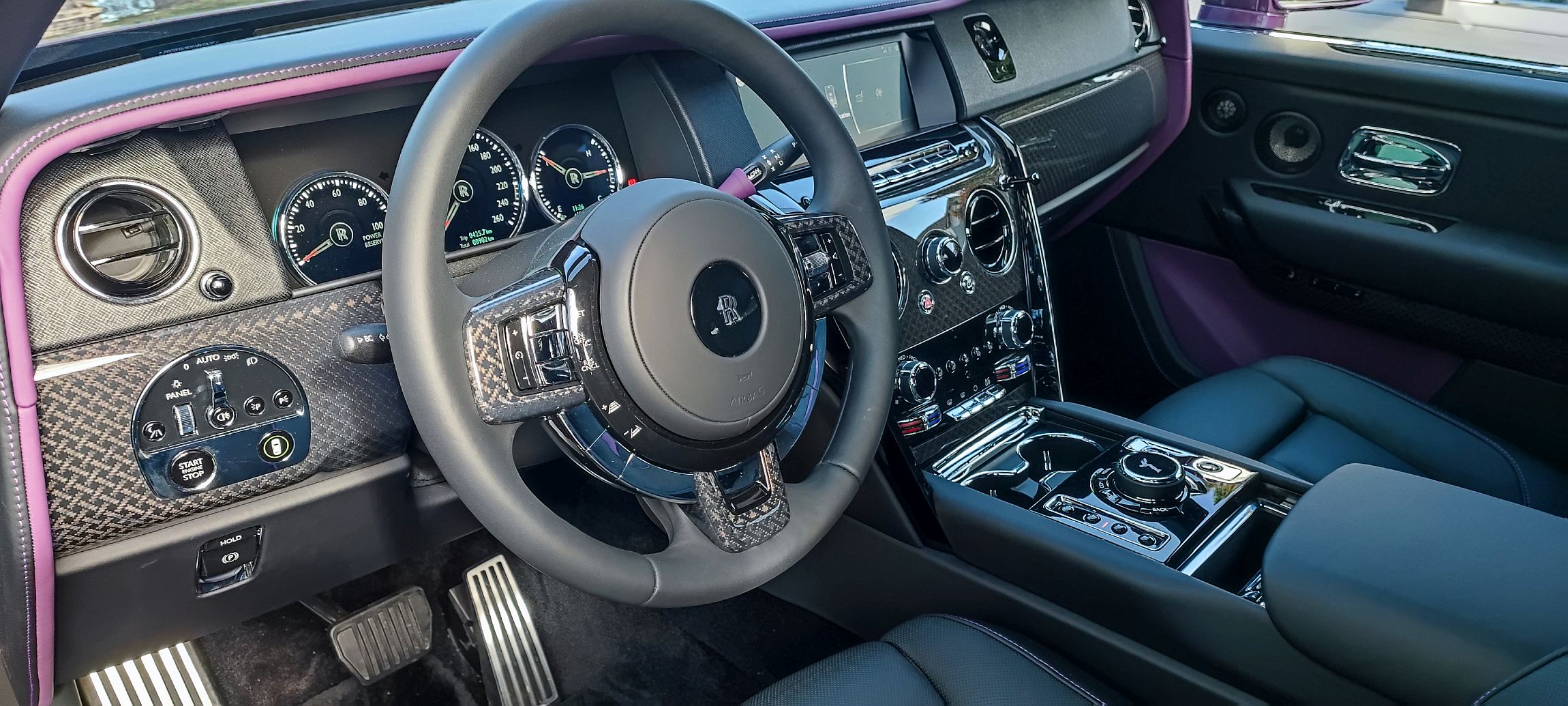 A versão que pudemos conduzir era a Cullinan Black Badge, que elevava a potência máxima para os 600 CV e o binário para os 900 Nm, disponíveis logo às 1600 rpm (assim se percebem as respostas fulgurantes), além de dispor igualmente de alguns detalhes identificativos em cor escura, como a estatueta no longo, longo capot, as jantes especiais e os apontamentos também em preto atrás, além de aplicações em carbono no habitáculo. Na alavanca seletora de mudanças há ainda um modo ‘Low’ que, no Black Badge, melhora as passagens da caixa automática de oito velocidades em 50%, além de uma maior presença sonora do motor V12.