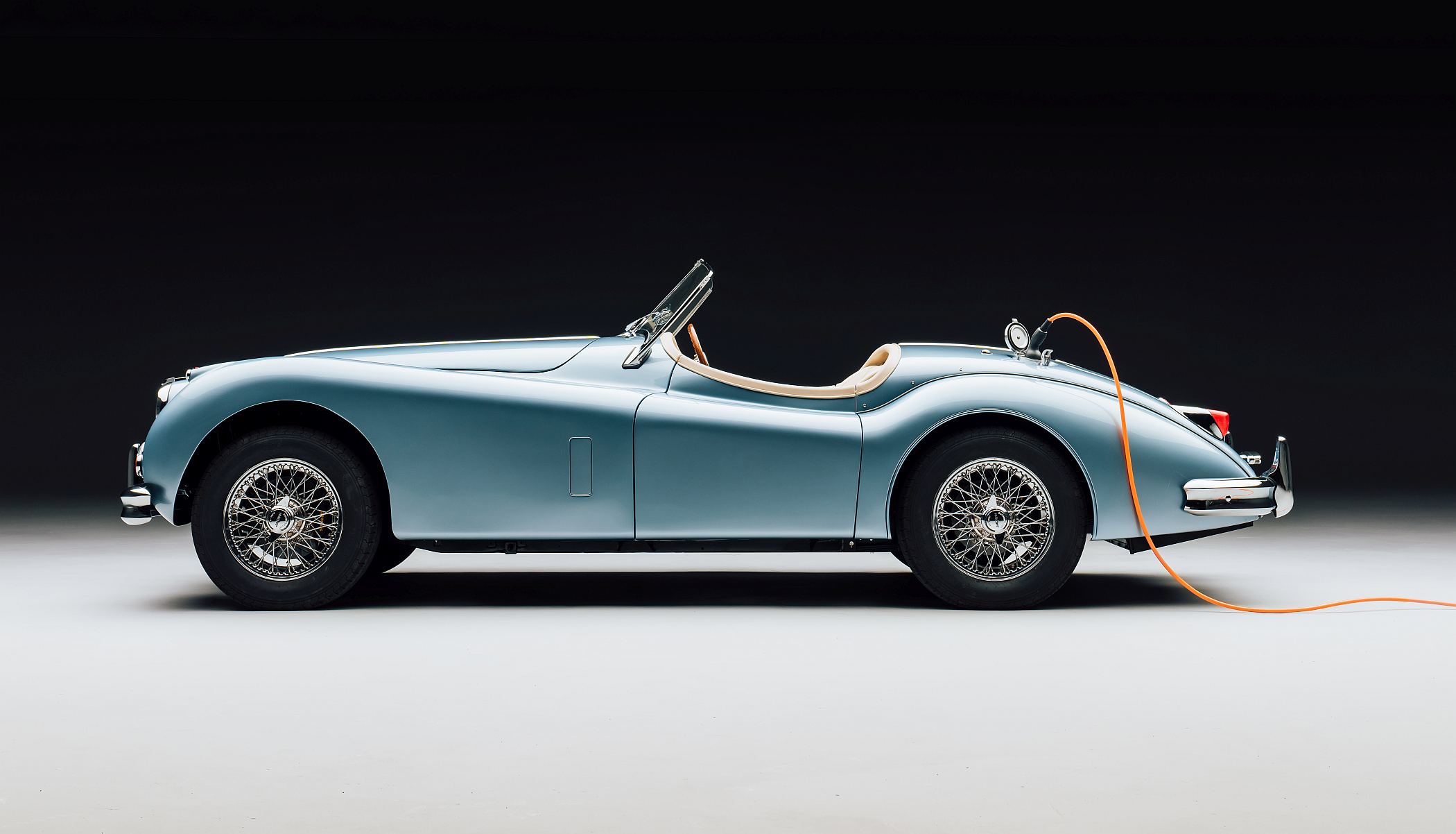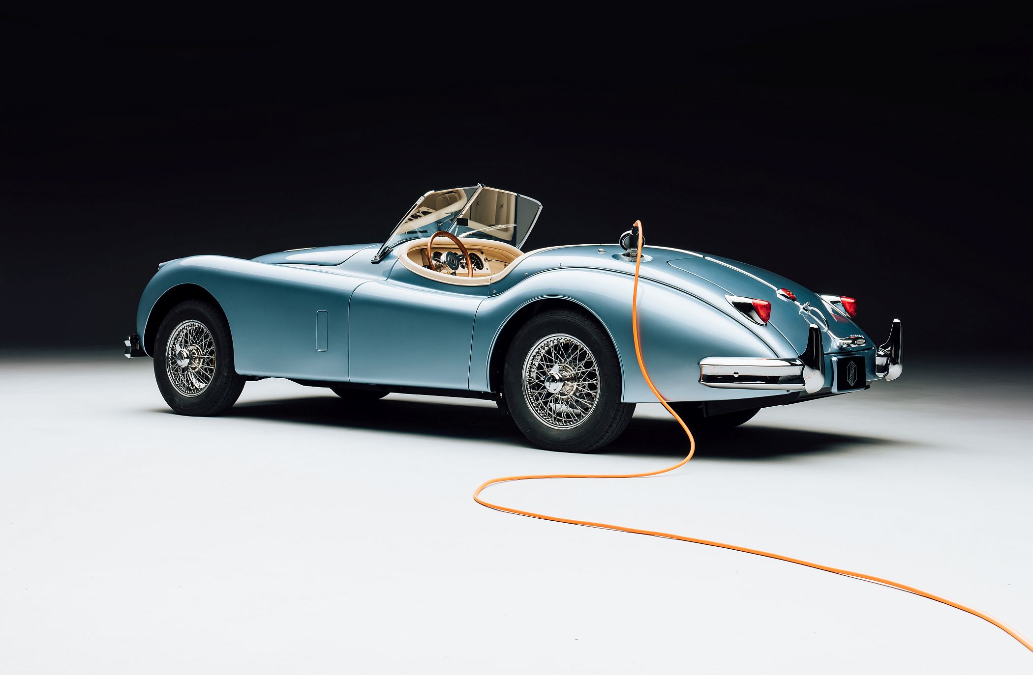 Pintado numa tonalidade clara de azul, este XK140 de 1954 foi totalmente restaurado e melhorado em diversos aspetos, mantendo o aspeto clássico exterior, escondendo os progressos no seu interior, nomeadamente com manómetros convertidos para apresentar as informações do estado da bateria e outras funções contemporâneas.