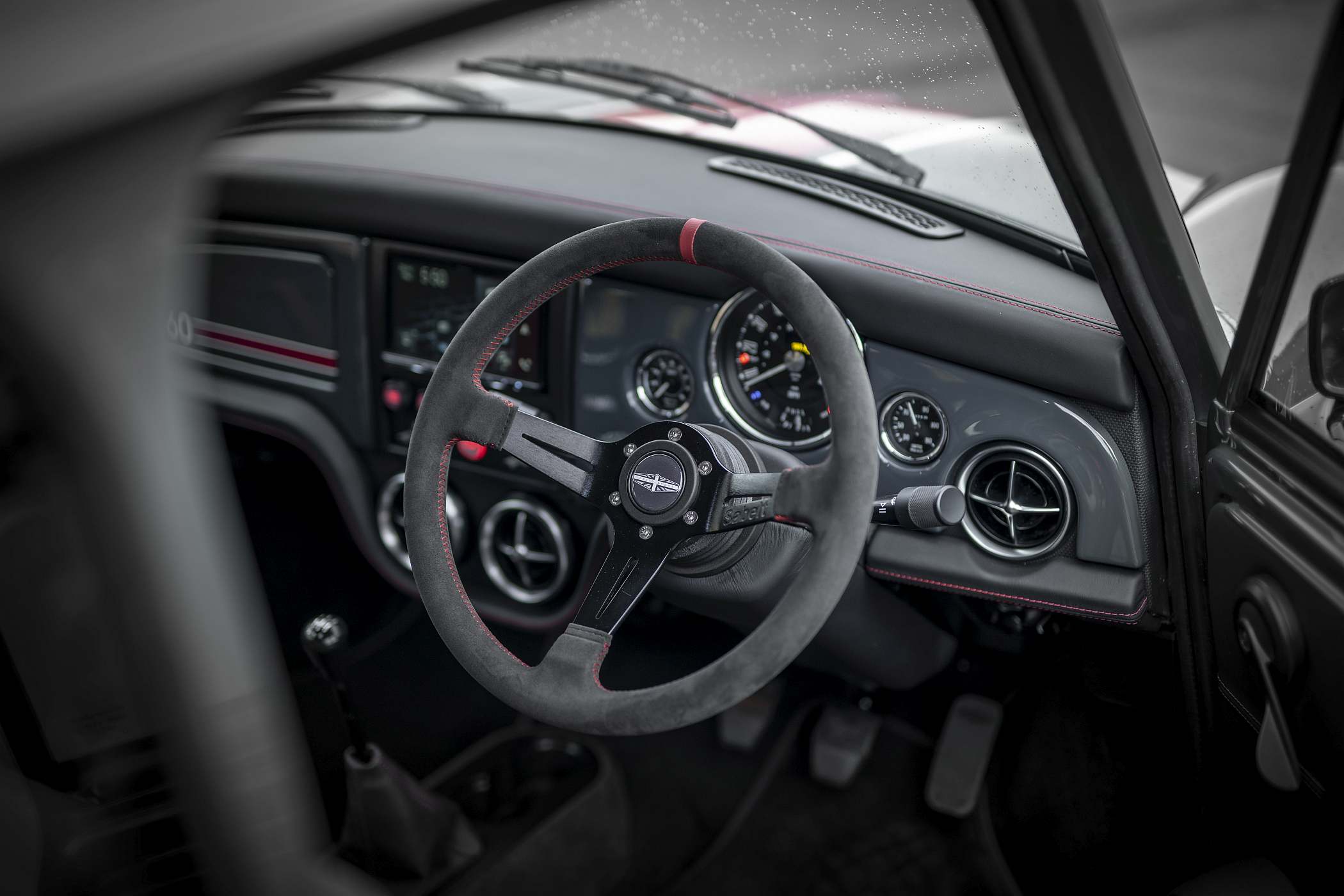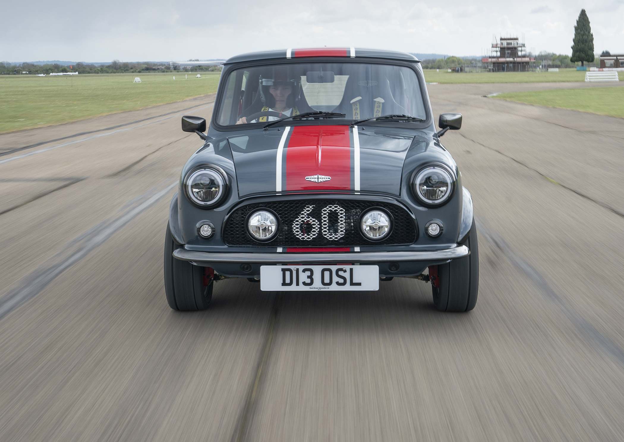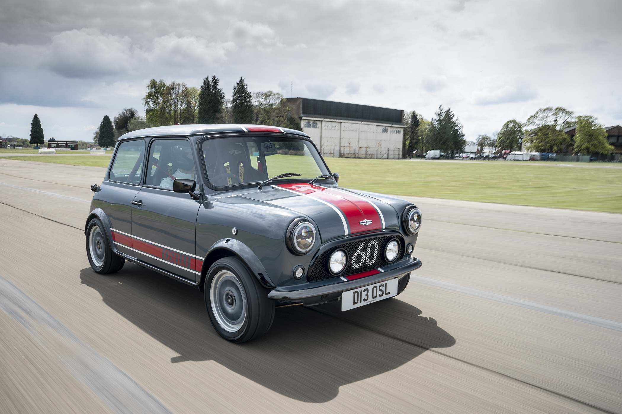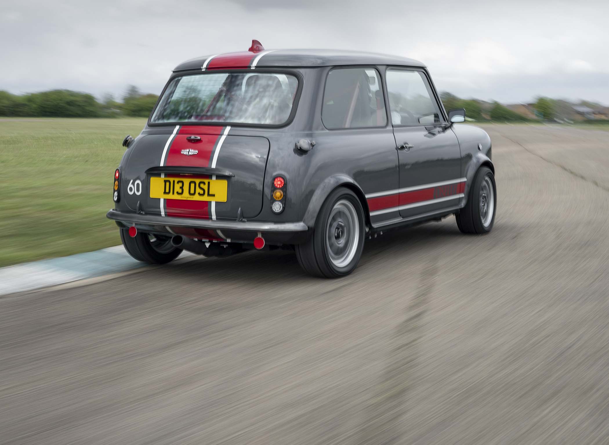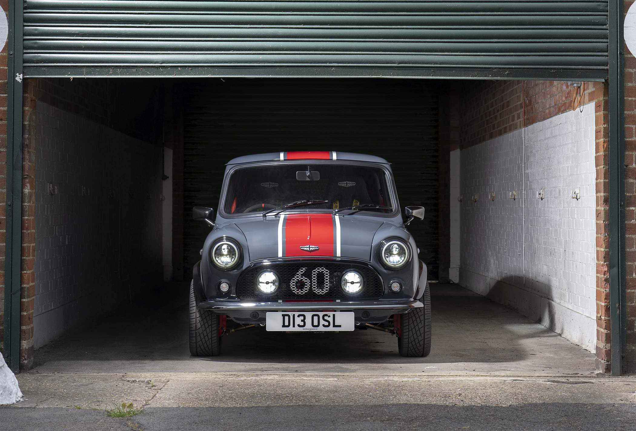 O Mini conta ainda com jantes mais largas de 13 polegadas com pneus mistos para utilização em estrada e circuito. Visualmente, não foge muito ao estilo clássico, embora conte com decoração única e pinturas criadas de raiz pela DBA, como as ‘Carbon Grey’ e ‘Old English White’. Todos os gráficos exteriores são pintados à mão para um acabamento de alta qualidade. Na grelha dianteira surge o número ‘60’, não só como uma referência ao número que o modelo enverga nas pistas, mas também uma indicação dos 60 anos do Mini original. Na dianteira, há ainda luzes LED.