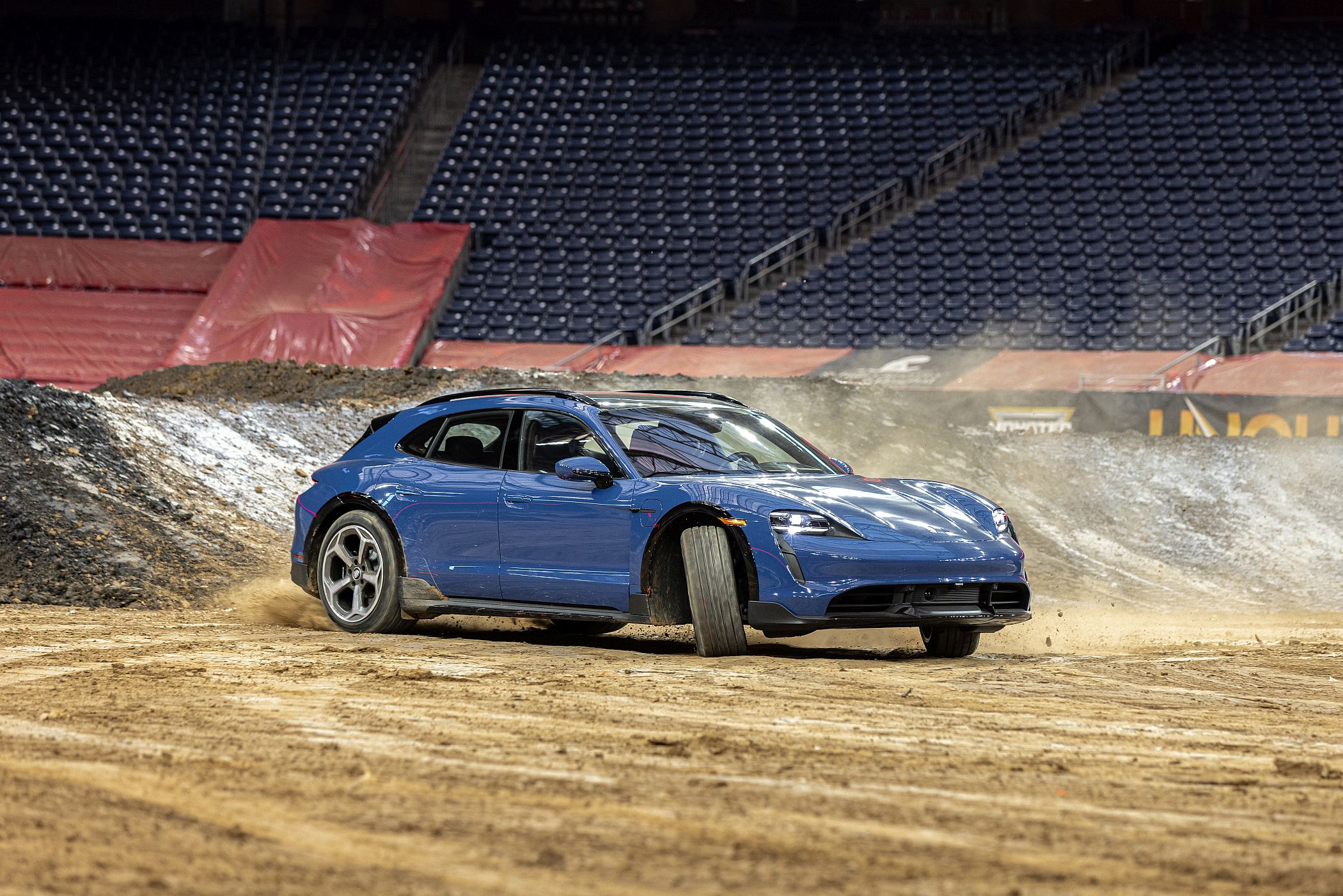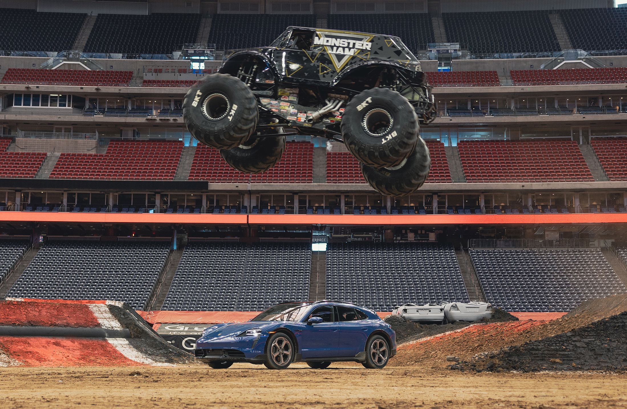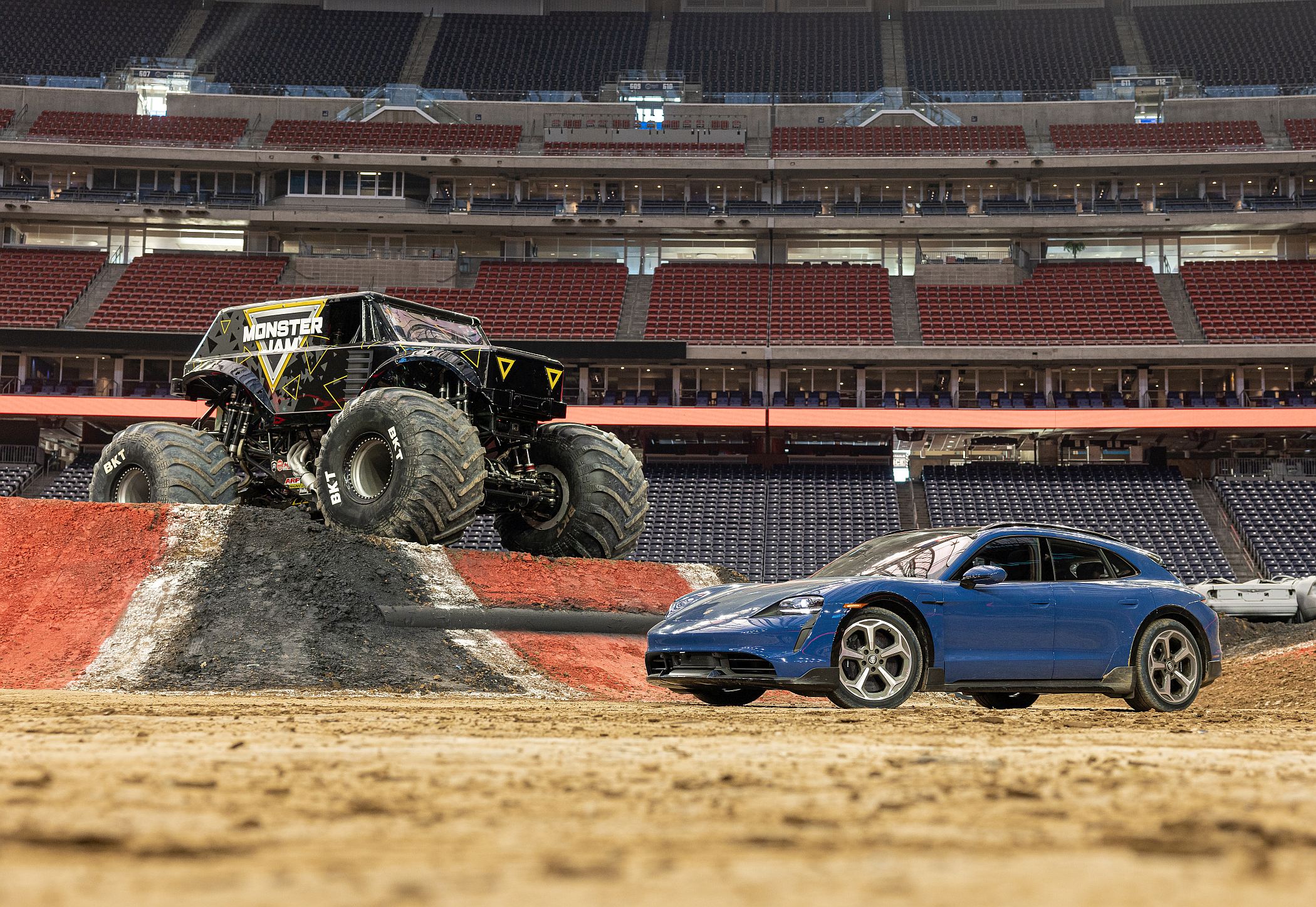 No Estádio NRG do Texas, o piloto Lindsey Read pilotou o ‘Monster Jam’ para mostrar como é que as suas capacidades se equiparam às do Porsche Taycan mais versátil e potente da gama Taycan, embora as semelhanças sejam francamente poucas.