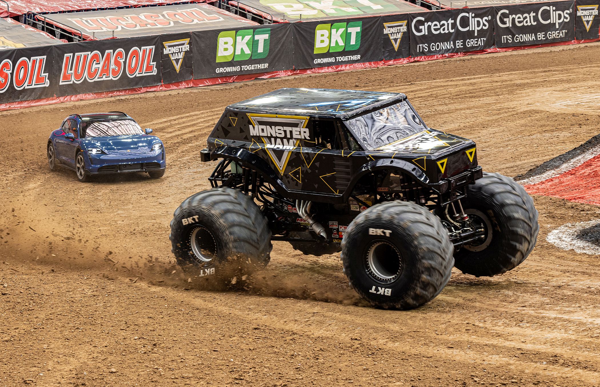 O Taycan foi conduzido por Leh Keen, que se confessou abismado pelas dimensões do ‘monster truck’. “O tamanho do Monster Jam é impressionante – parece que nem se estava a esforçar, mas olhei de relance para baixo e aproximámo-nos de velocidades em redor dos três dígitos, dentro de um estádio na terra”, referiu Keen.