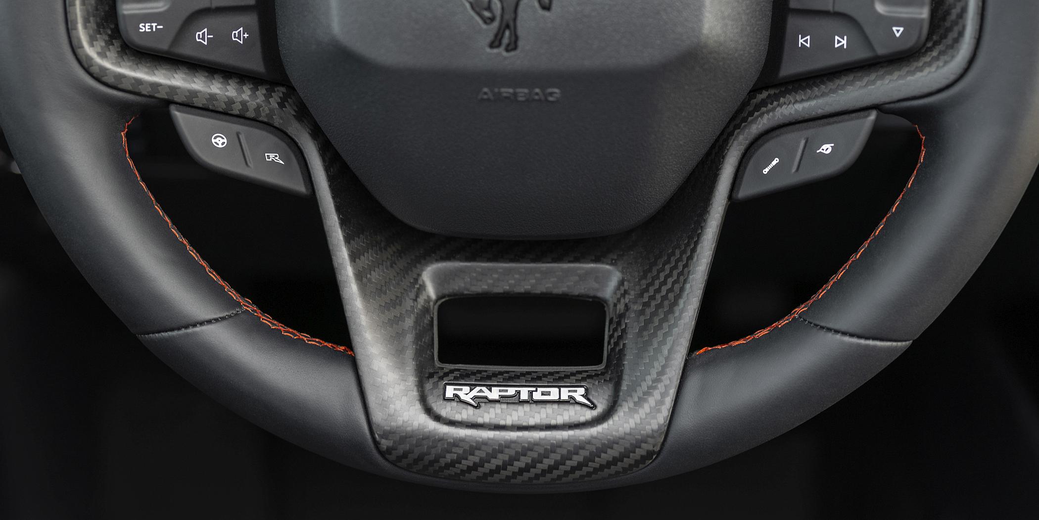 No interior, destaque para o novo painel de instrumentos Performance View, volante específico com patilhas e comandos específicos Raptor. Adiciona igualmente bancos desportivos com apoio lombar adicional e apontamentos em cor de laranja, tonalidade também aplicada no comando rotativo, saídas de ventilação, rede no forro das portas e pespontos no volante (que contempla um logo Raptor).