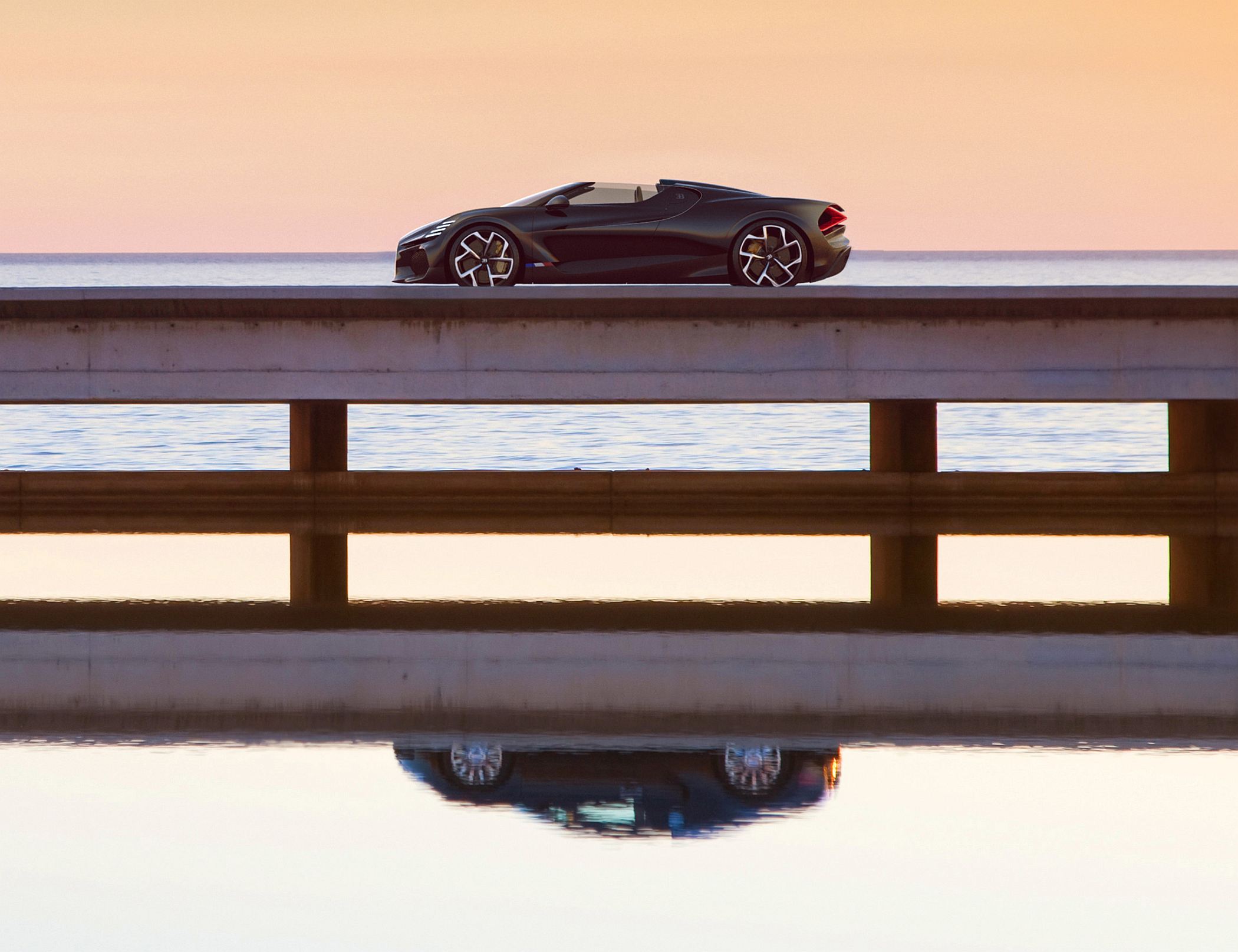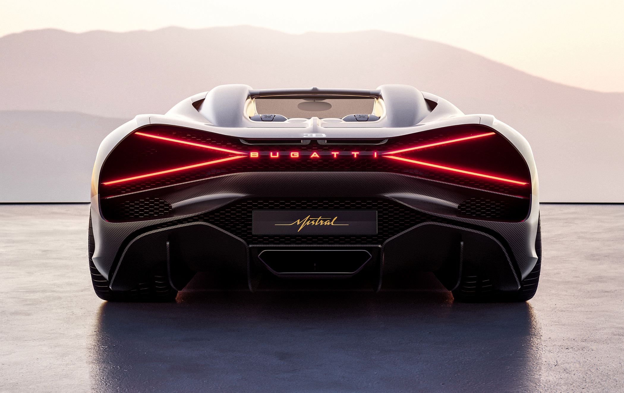 O Mistral apresenta alguns elementos de design do Divo, do Bolide e até do superexclusivo La Voiture Noire, mas, segundo a Bugatti, a inspiração veio de um passado mais remoto, do Type 57 Roadster Grand Raid, de 1934. Na traseira, o principal elemento de estilo: a assinatura LED em forma de ‘X’, à imagem do referido Bolide. No interior, o Mistral aproxima-se mais do Chiron.