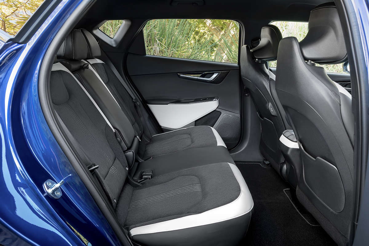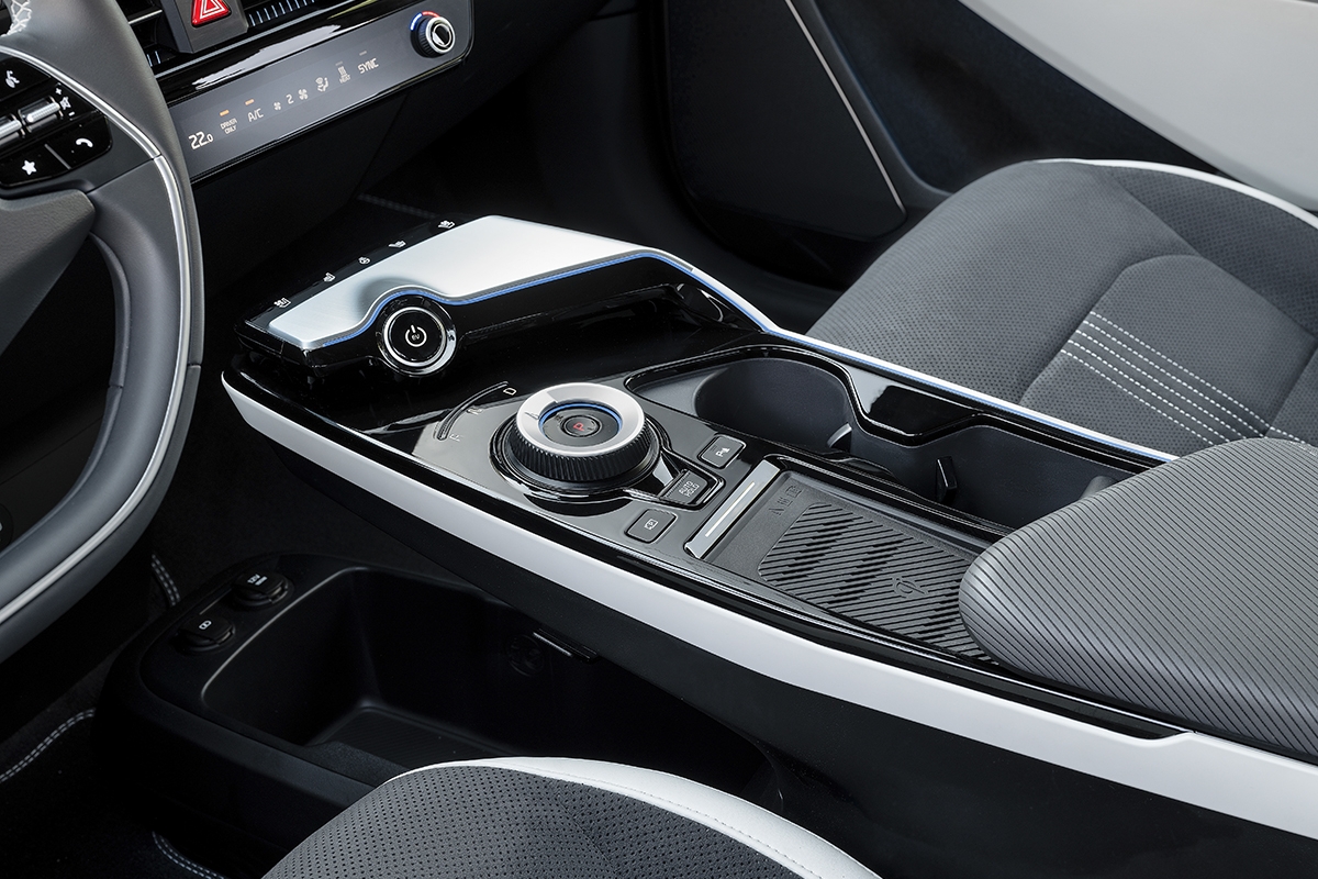 Aos comandos a posição de condução está na altura certa para um crossover coupê e o banco é confortável fornecendo o apoio necessário. Destacamos a consola central flutuante onde se encontra o seletor de marcha, o carregador de smartphone sem fios e tem apoio para o braço e espaço à frente para pequenas bolsas ou outros objetos. O volante multifunções tem um design diferenciador e apenas dois braços, a pega é boa e conta ainda com patilhas para controlar a regeneração que nos níveis mais altos ativam a condução apenas com o pedal do acelerador, também para travar e parar. O painel de instrumentos conta com um ecrã de 12,3 polegadas onde a informação é apresentada de forma semelhante à que já tínhamos visto no Hyundai Ioniq 5, unindo-se ao ecrã de infoentretenimento, também com 12,3”. O sistema funciona de modo expedito e comtempla as já habituais conexões Apple Car e Android Auto sem fios. Ainda na zona central do tabliê existe uma faixa tátil cujos botões mudam consoante se escolhe a função de climatização ou o rádio e podem ser controlados com dois botões rotativos. Uma solução que junta o melhor que o interface digital e botões físicos têm para oferecer.