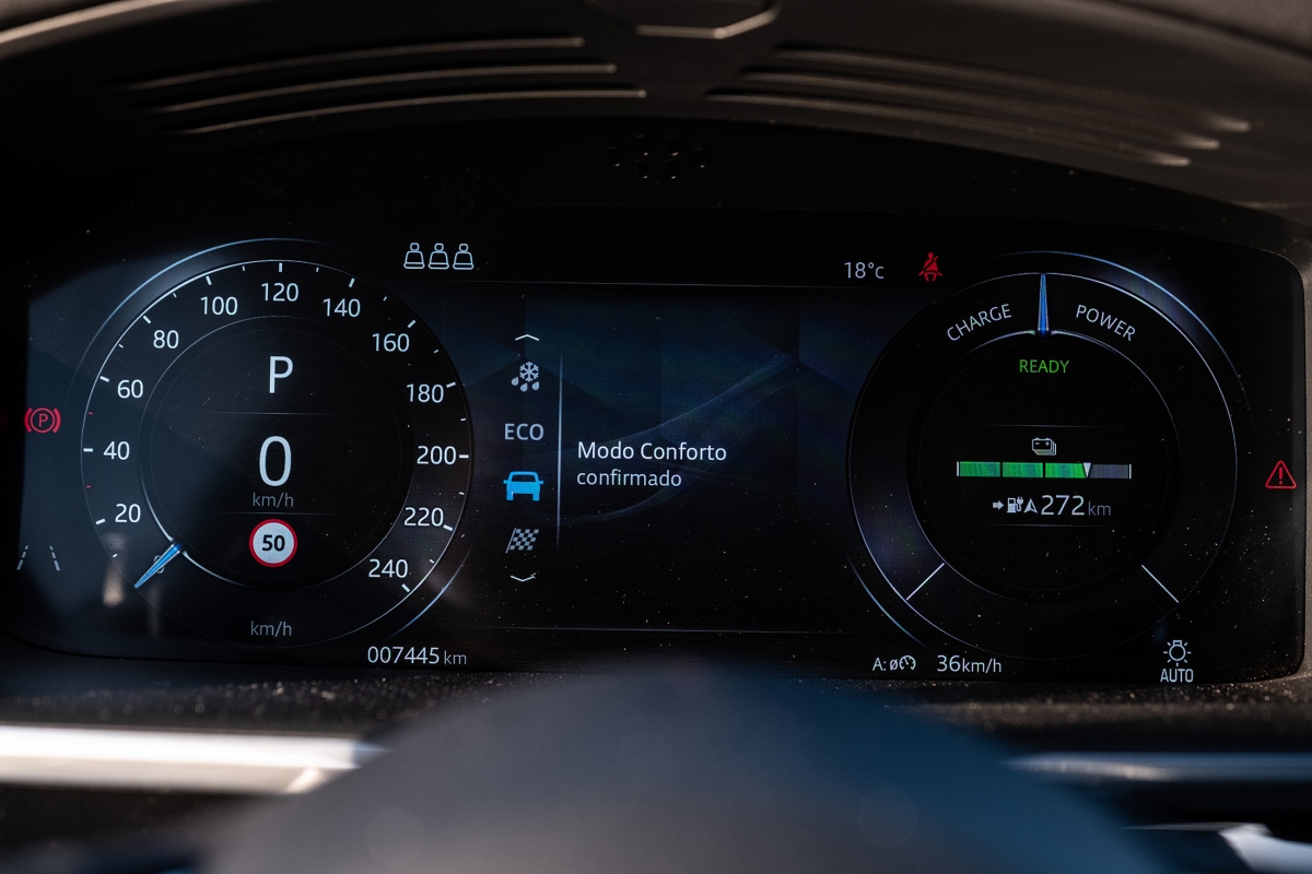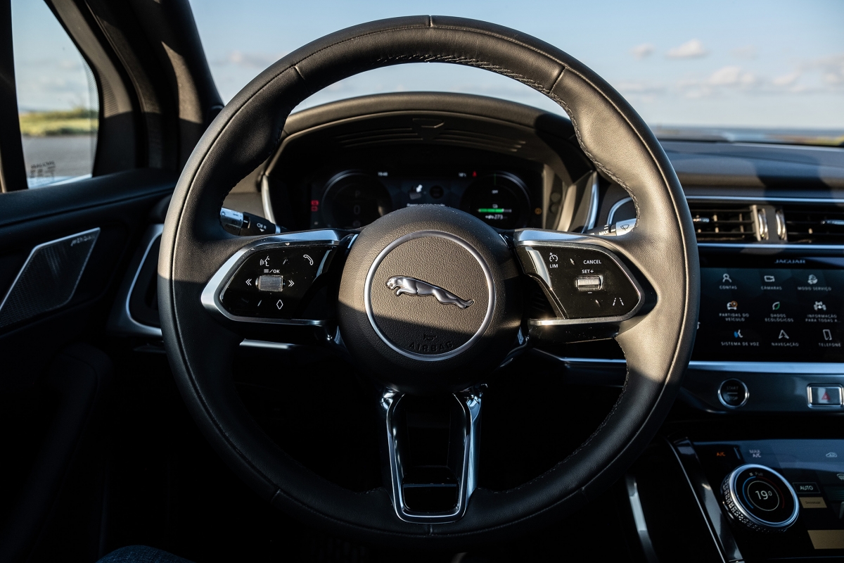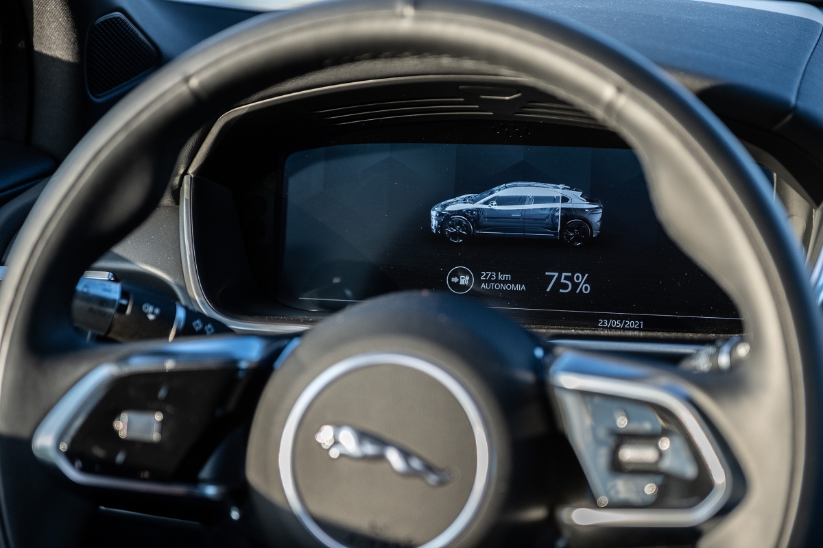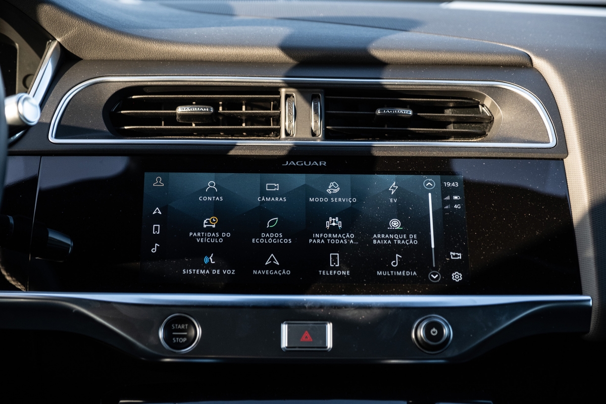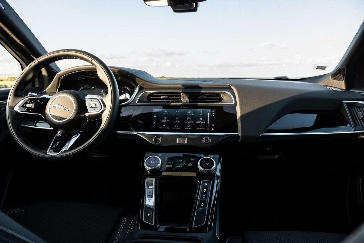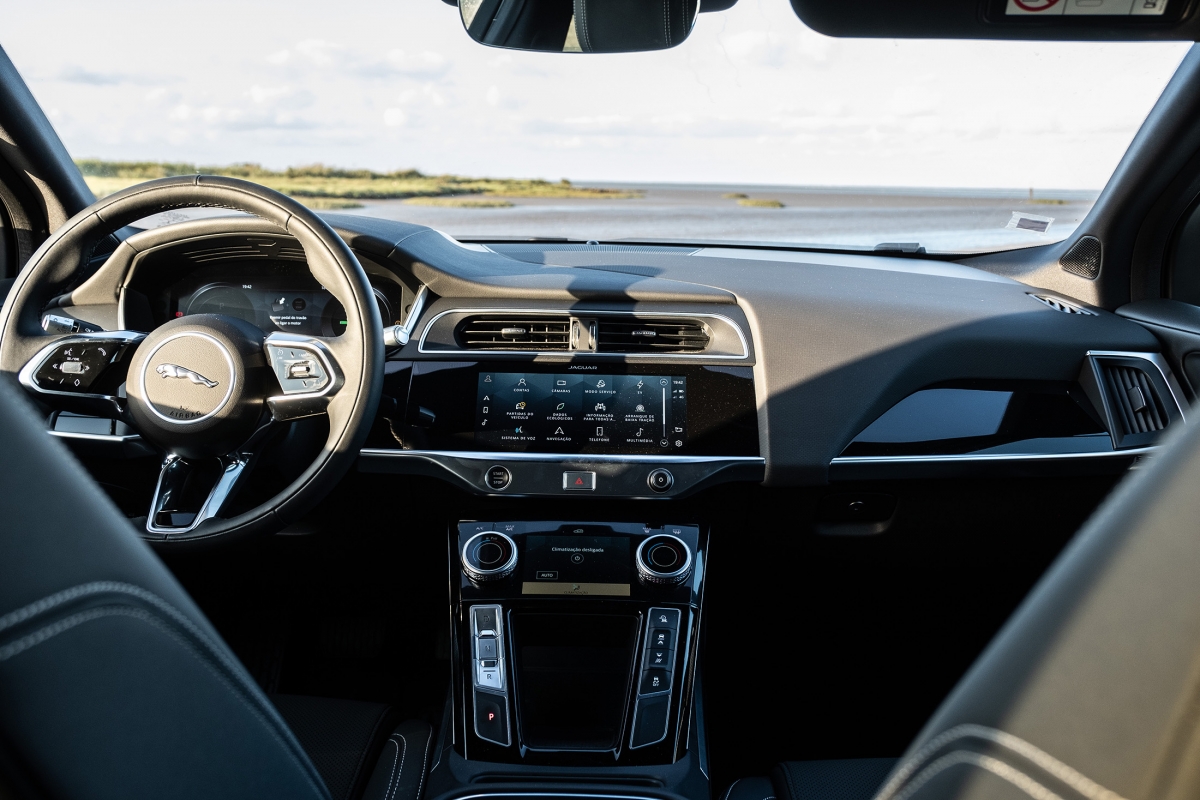Prontos para arrancar, podemos escolher entre os modos Eco ou Dynamic, sendo o primeiro aquele com que se conseguirão obter melhores consumos, logo uma maior autonomia. Ao fim de algum tempo de habituação à condução do i-Pace damos por nós a utilizar apenas o pedal do acelerador até mesmo para quase parar, utilizando o método que a marca chama de “condução com apenas um pedal”: utiliza a travagem regenerativa sempre que desaceleramos para carregar as baterias, a qual pode ser configurada de forma a deixar deslizar mais ou menos o carro, conforme a preferência do condutor.