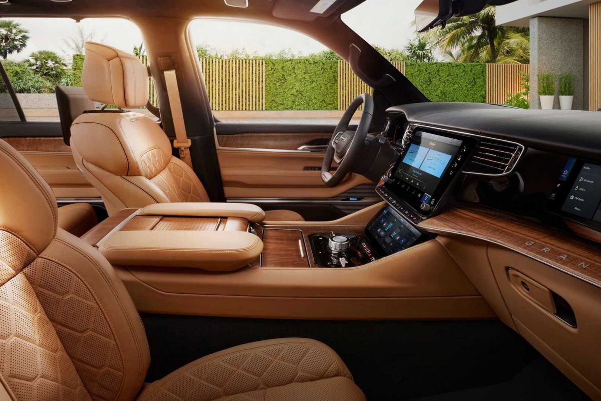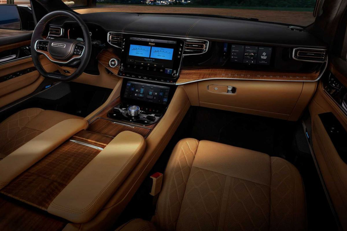 O interior é sumptuoso nos dois casos, todavia o Grand Wagoneer traz mais equipamento, outros pormenores e ecrãs maiores. O Grand Wagoneer tem a opção de um terceiro ecrã que pode ser encaixado diretamente em frente ao passageiro da primeira fila e acabamentos mais vistosos. Ao estilo dos seus antepassados, os novos Wagoneer possuem um volante de dois raios.