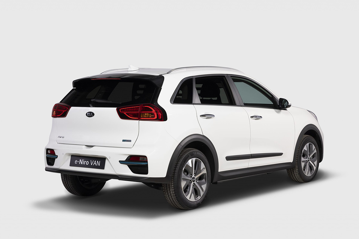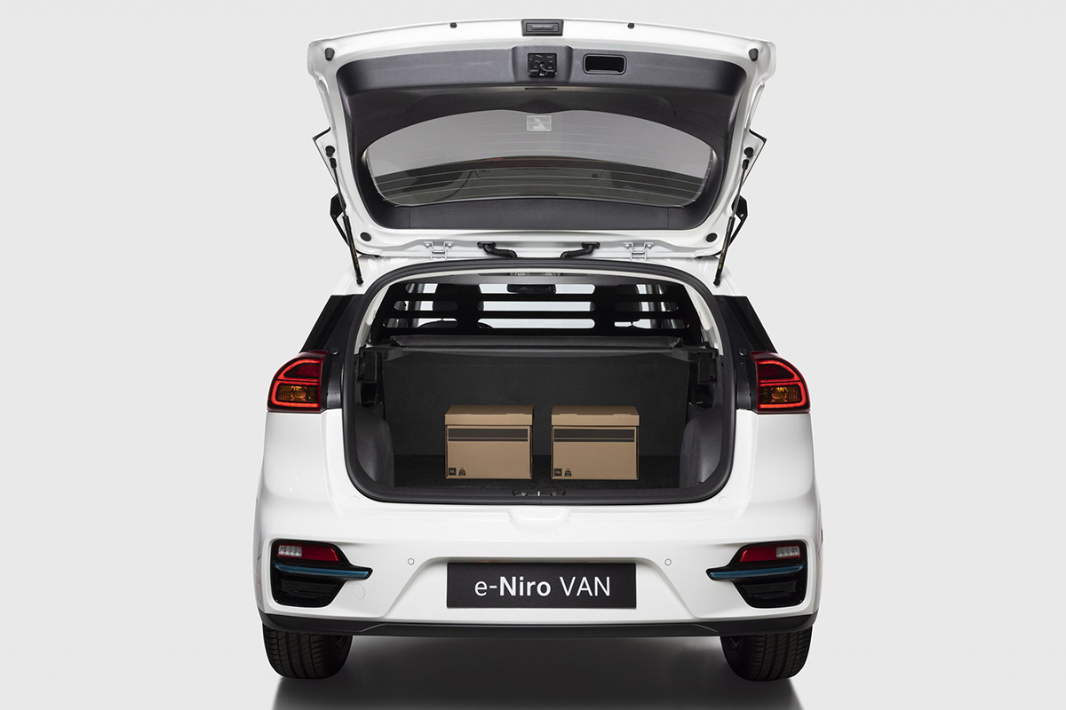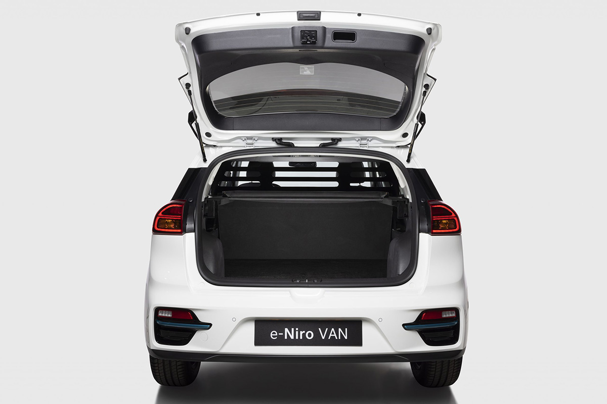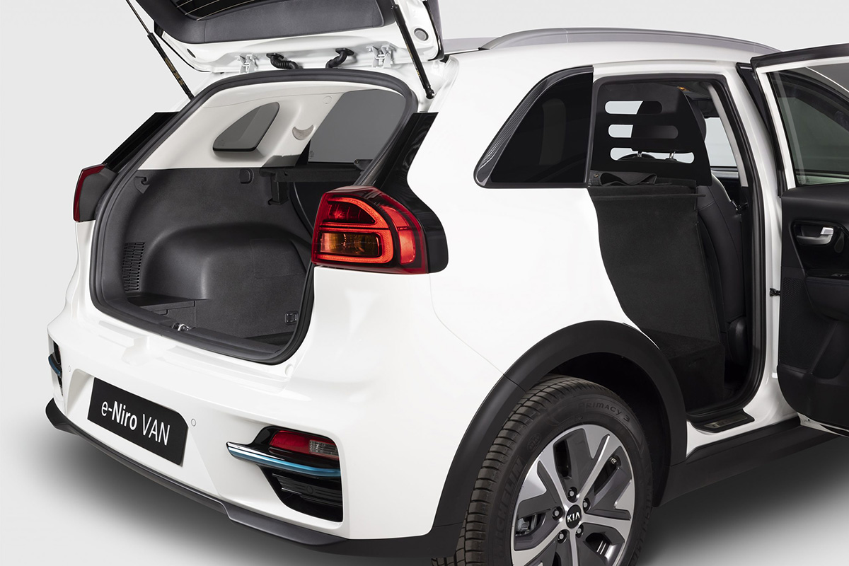 O Kia e-Niro Van distingue-se pela ausência da fila de bancos posteriores e introdução de antepara metálica, transformação que dá acesso à homologação como veículo comercial.