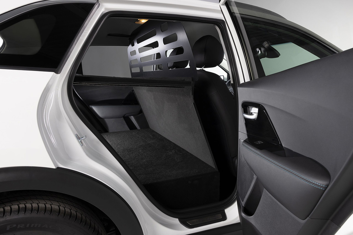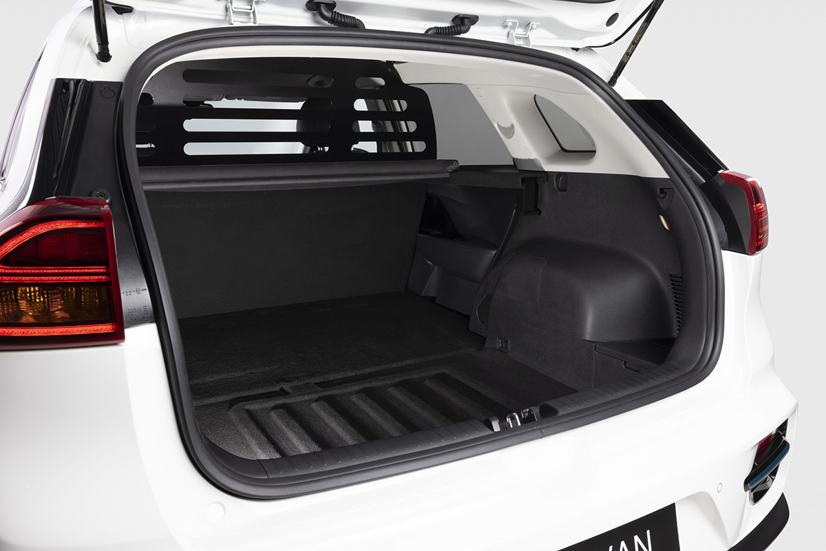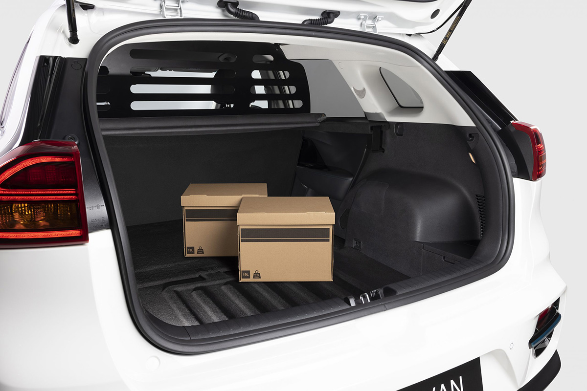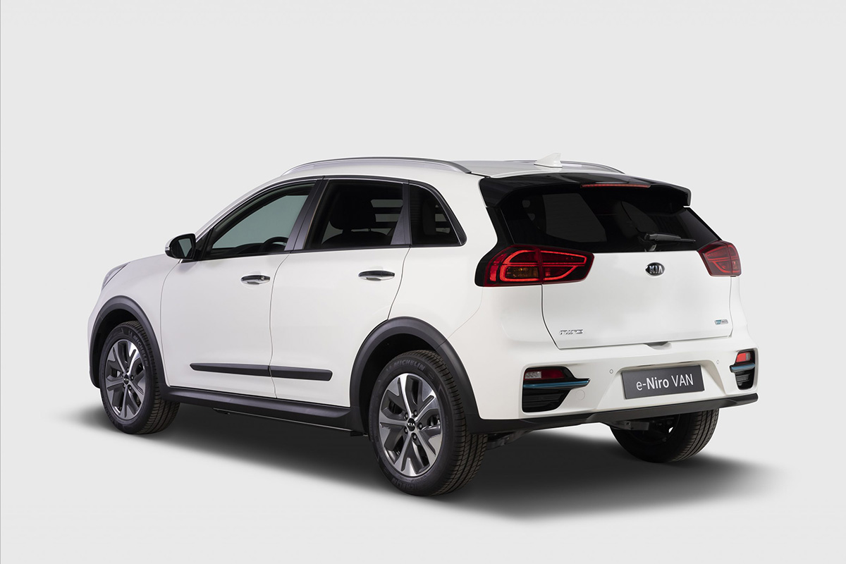 O Kia e-Niro Van distingue-se pela ausência da fila de bancos posteriores e introdução de antepara metálica, transformação que dá acesso à homologação como veículo comercial.
