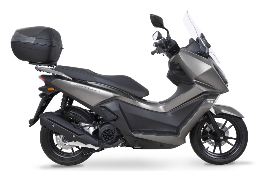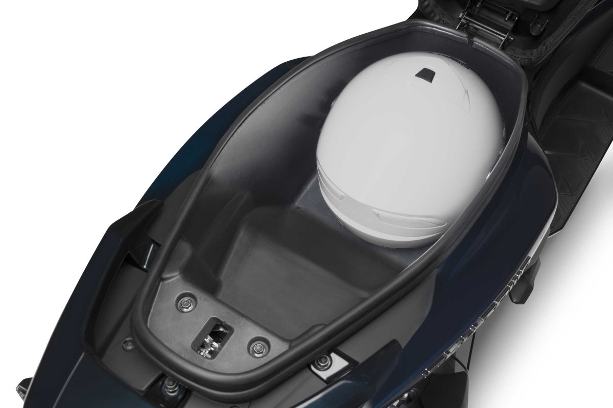 Apesar de minimalista, esta scooter dispõe de muito espaço de arrumação, por baixo do assento ou na top case de 33lt (com painel à cor da scooter), incluída nas primeiras unidades como Oferta de Lançamento.