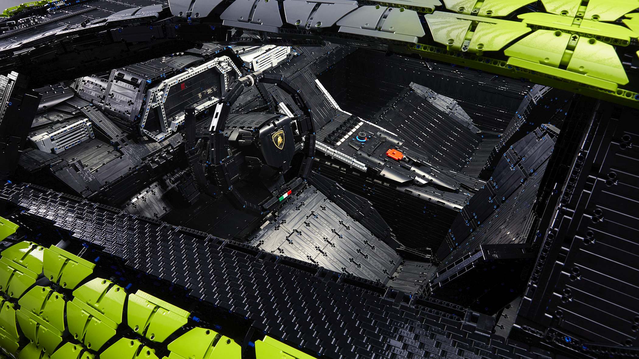 No habitáculo, destacam-se detalhes como o volante construído em LEGO, no qual figura o emblema da Lamborghini, a bandeira italiana, painel e bancos de corrida, tudo em LEGO. A pintura, igual à do modelo 1:8 (nas fotos de baixo), foi aplicada na oficina da marca para garantir um acabamento digno do supercarro desportivo.