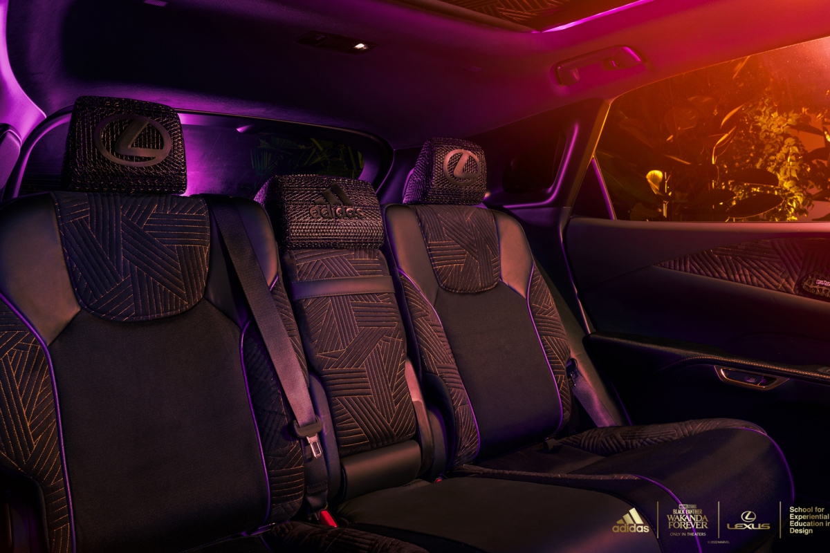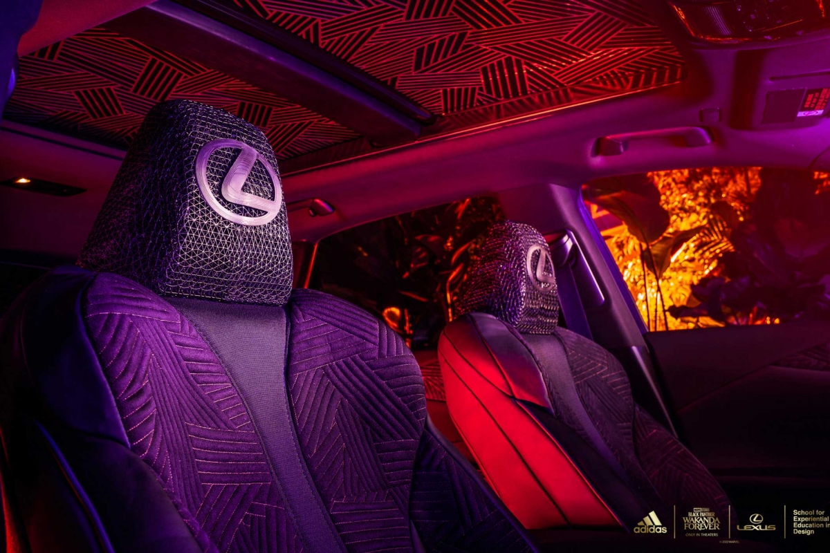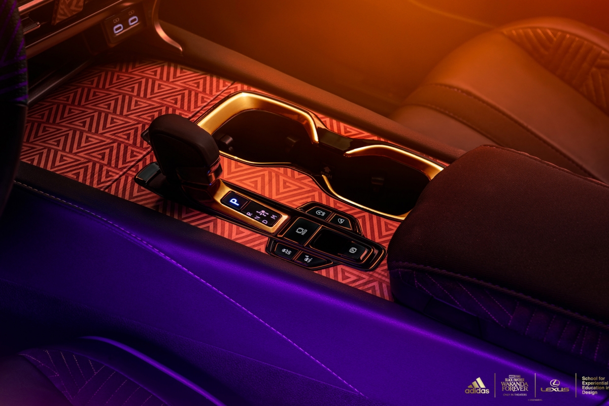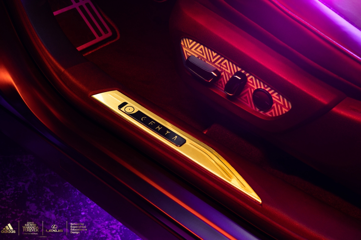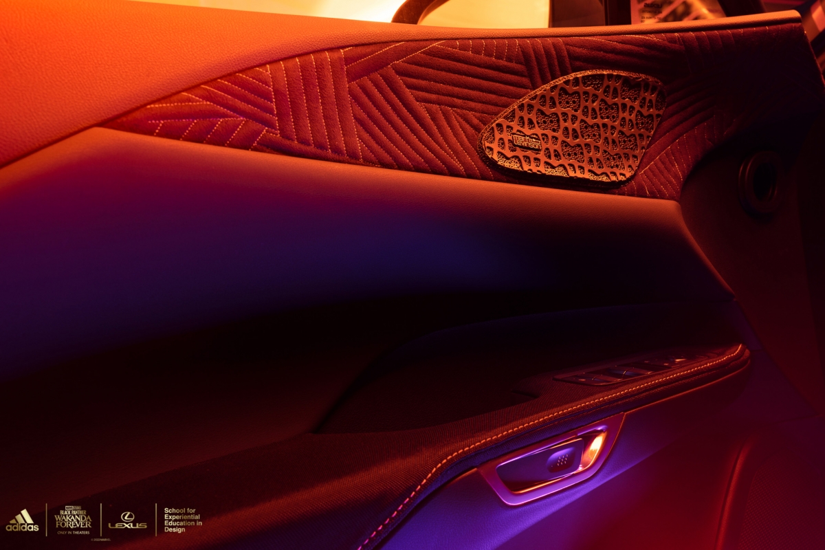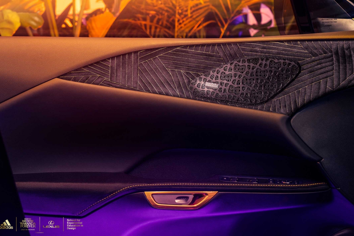 As principais áreas táteis, como a almofada do volante e os encostos de cabeça dianteiros e traseiros, foram forrados com material com retorno de energia usado na sola intermédia do modelo desportivo de sapatilha adidas 4D-FWD, impresso em Carbon 3D. Os encostos de cabeça dianteiros trazem o emblema Lexus e o encosto central traseiro vem com o icónico logotipo da adidas. Os acabamentos em madeira cortada a laser em volta da manete das mudanças e os pormenores dourados ajudam a criar um ambiente distintamente Wakandiano.