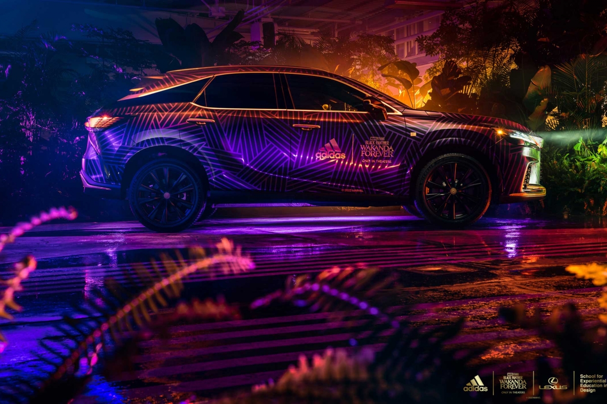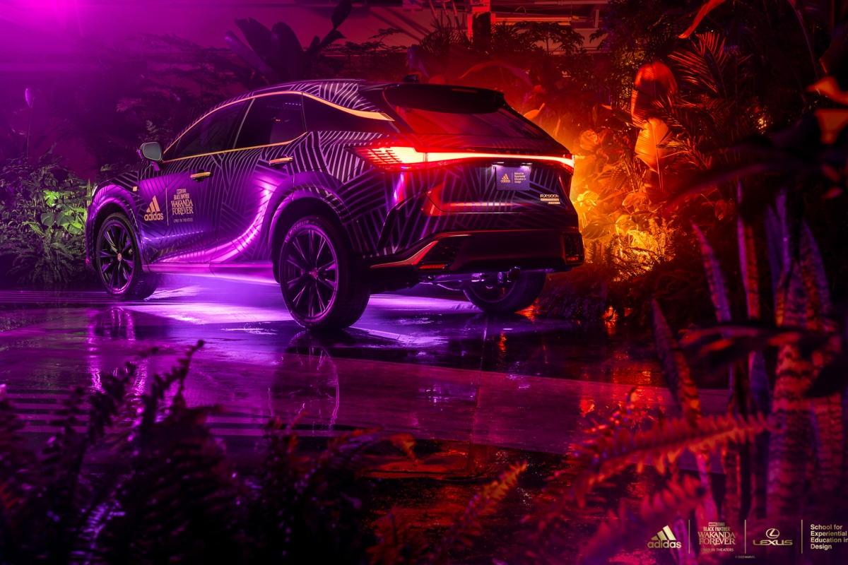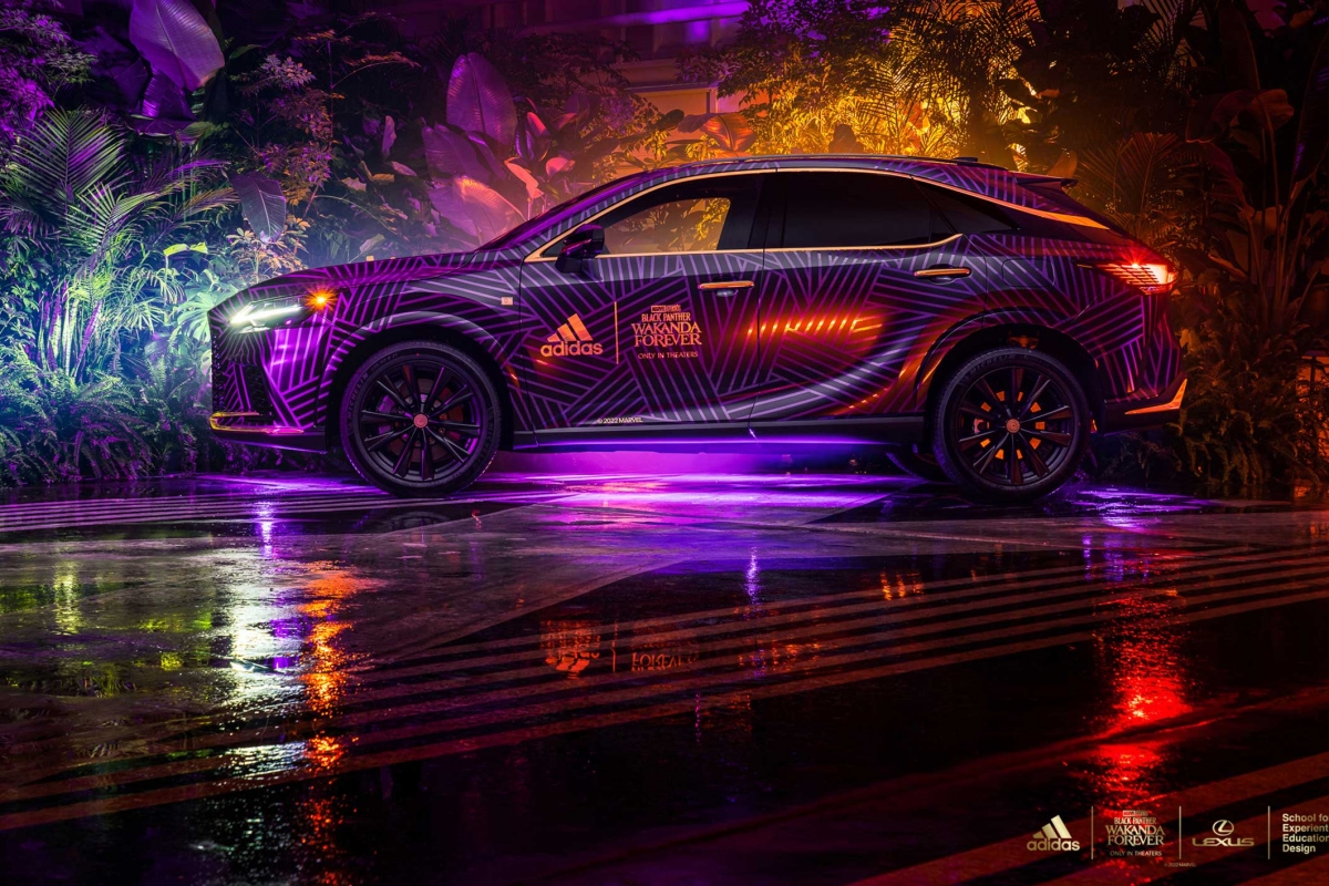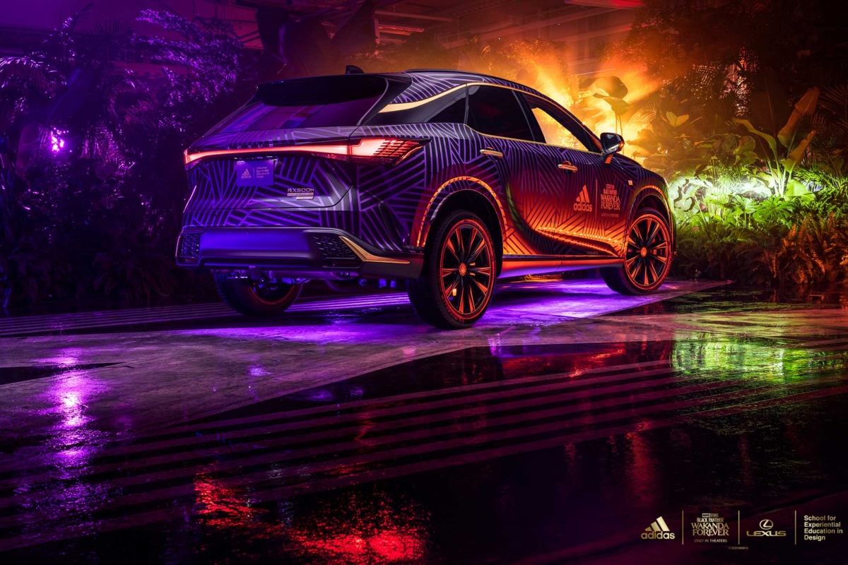 O exterior do RX foi totalmente personalizado com base na identidade que a adidas criou para a nação fictícia. Apresenta uma impressão tribal no exclusivo roxo Wakandiano, o mesmo usado em toda a coleção de roupa desportiva da adidas. No capot, foi incrustado um padrão de diamante inspirado no superpoderoso colar de garras da Pantera Negra. Foram usados caracteres do alfabeto wakandiano nos emblemas F SPORT e Lexus, incluindo a palavra “Vibe-Branium”, revelando o nome exclusivo do modelo: o Lexus RX 500h Vibe-Branium ( ) com tração às 4 rodas DIRECT4.