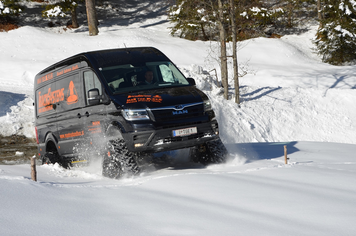 A MAN Truck & Bus revelou na Áustria, uma carrinha para operações anteriormente impensáveis. A carrinha TGE 3.180 4×4 está equipada com uma tracção especial com lagartas.