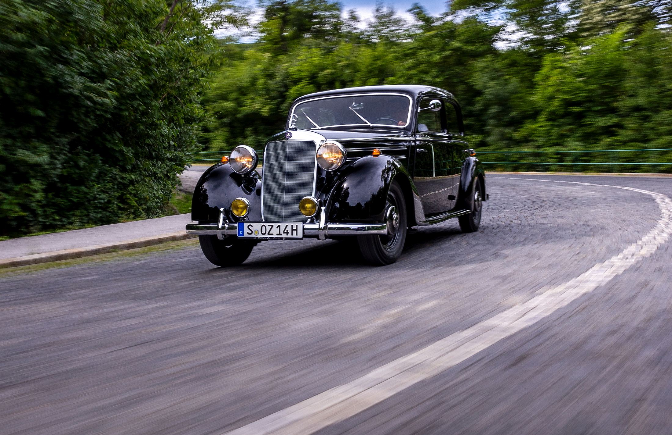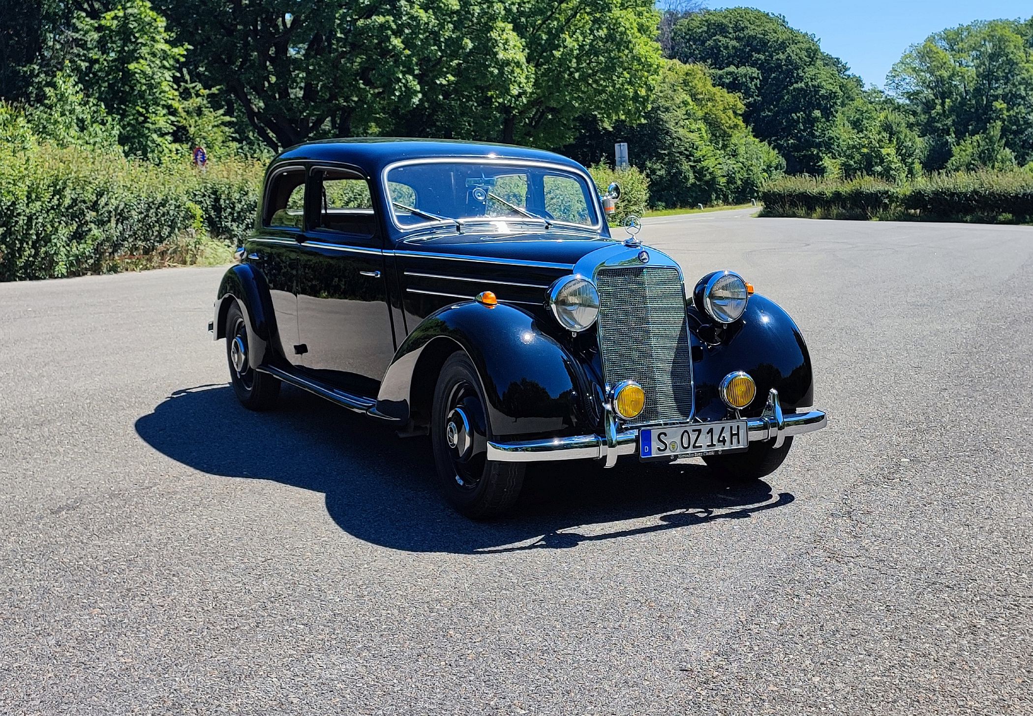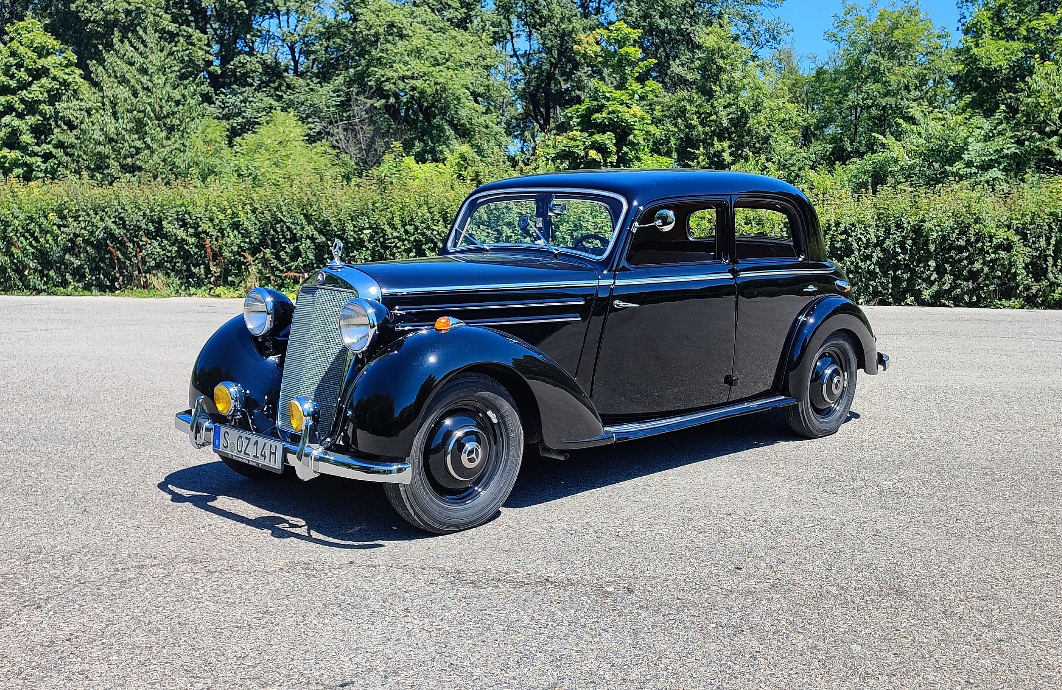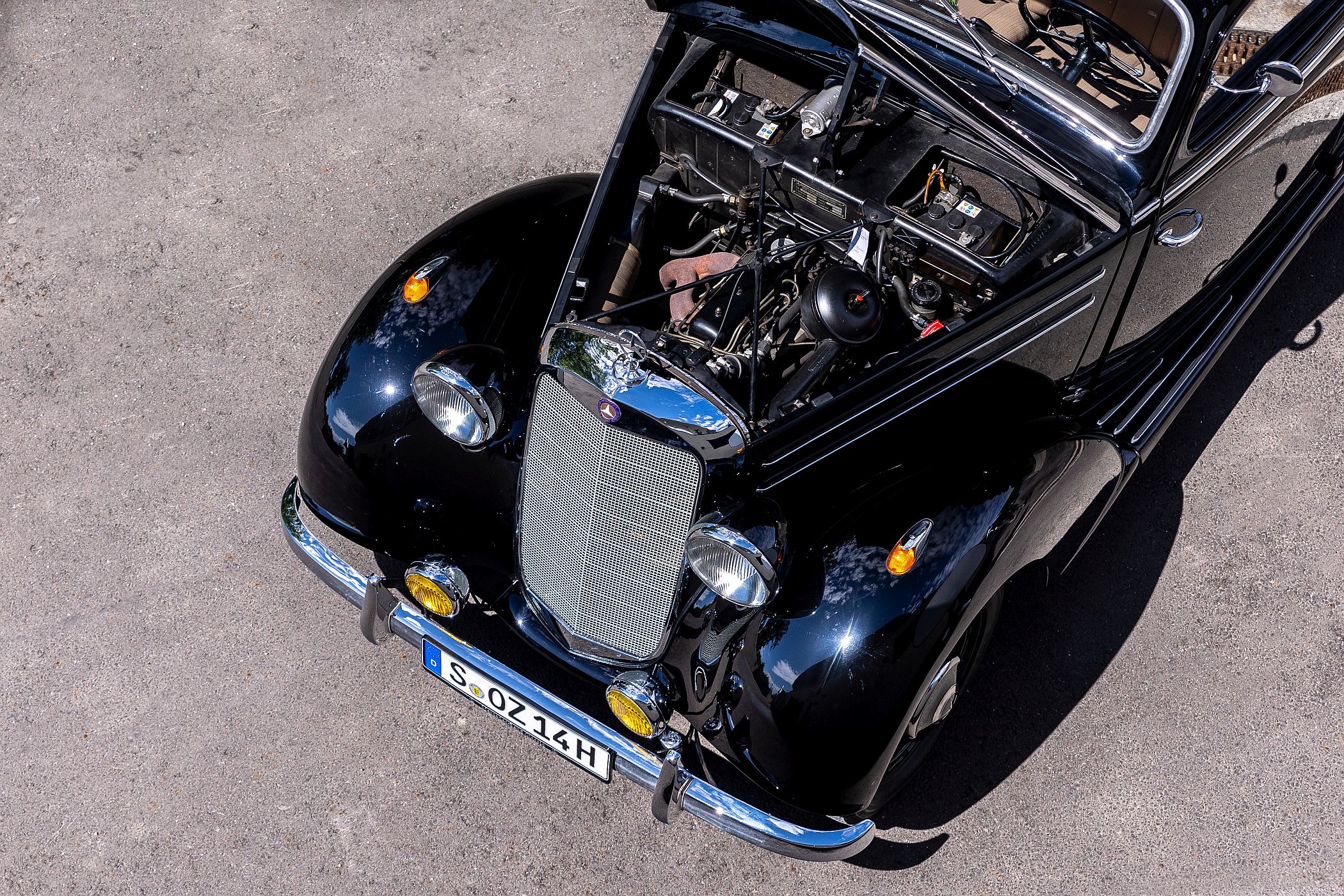 Lá à frente, longínqua no capot, está a estrela da Mercedes-Benz, impondo-se sempre no horizonte. Há uma aura mística com estes carros, sobretudo neste caso, que foi até o primeiro modelo da Mercedes-Benz a ser produzido (retomado, melhor dizendo) após a Segunda Guerra Mundial. A poderosa indústria automóvel alemã tinha sido anestesiada durante o grande conflito, mas mantinha os seus predicados intactos em termos de prestígio, conforto e refinamento.