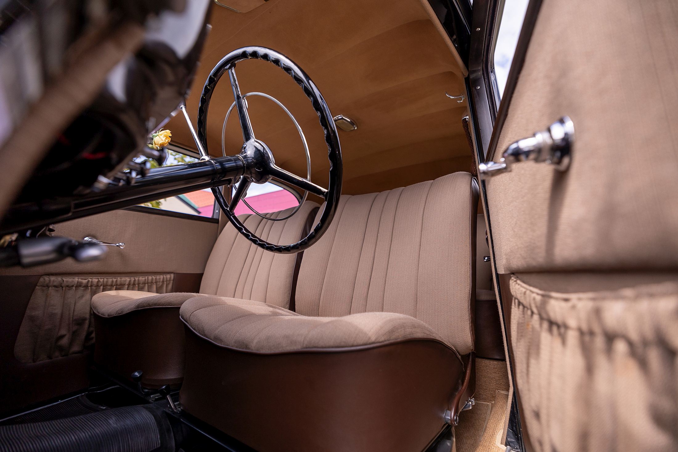 Antes de nos deixar seguir o nosso é caminho, Peter Becker senta-se no lugar do condutor e explica alguns detalhes deste clássico: como ligar o carro (a chave que teima em rodar lentamente), o interruptor que é preciso depois acionar, o travão de mão de estilo bengala que tem de ser recolhido sob a coluna de direção (“certifica-te de que está mesmo destravado, houve um colega teu que foi com as rodas traseiras ligeiramente travadas o caminho todo”), o pisca no volante em forma de aro interno ou a alavanca de velocidades extremamente temperamental. Engrenar a primeira é um trabalho de precisão em que a ‘manete’ tem de ser puxada no sentido do condutor e depois elevada, baixando depois para engrenar a segunda, novamente para cima e para trás (no sentido do painel de instrumentos) para a terceira e novamente para baixo e para trás para a quarta.