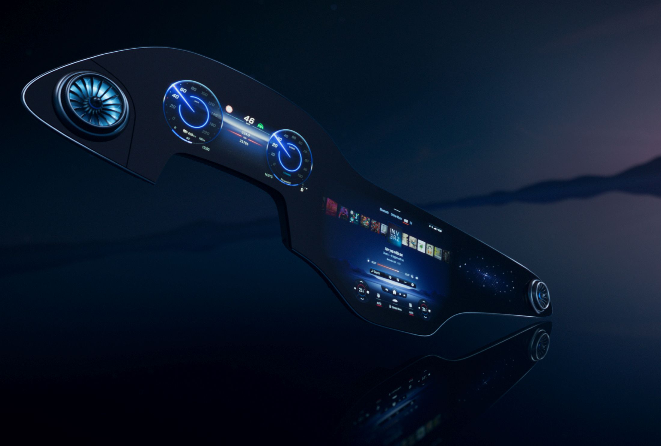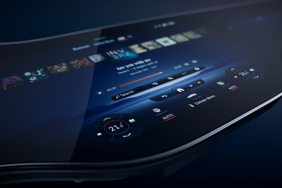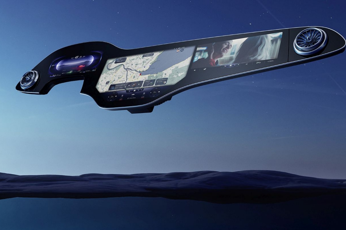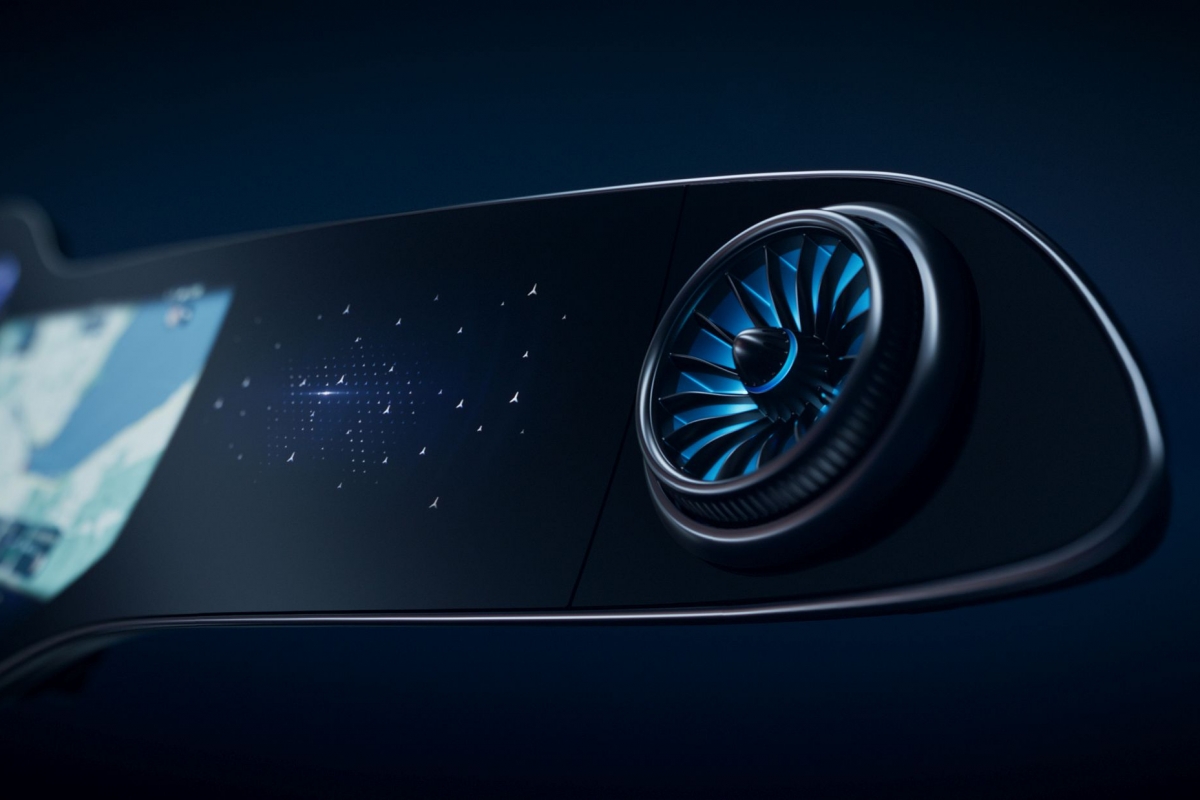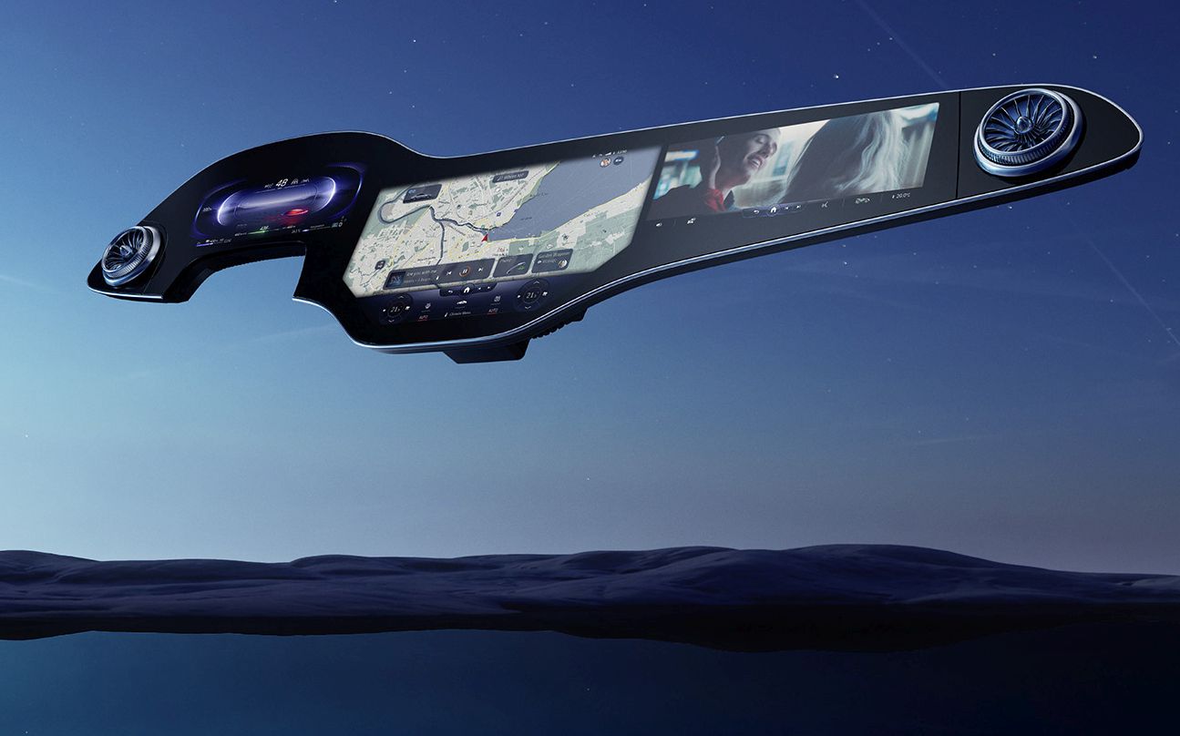 Visualmente, o MBUX Hyperscreen aparenta ser um ecrã único, mas é uma conjugação de elementos de design analógico/digital: vários ecrãs integram-se de forma harmoniosa, resultando numa superfície curva de grandes dimensões. As saídas da climatização do habitáculo estão integradas nesta grande superfície digital, conectando os mundos digital e físico.