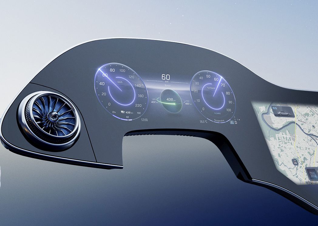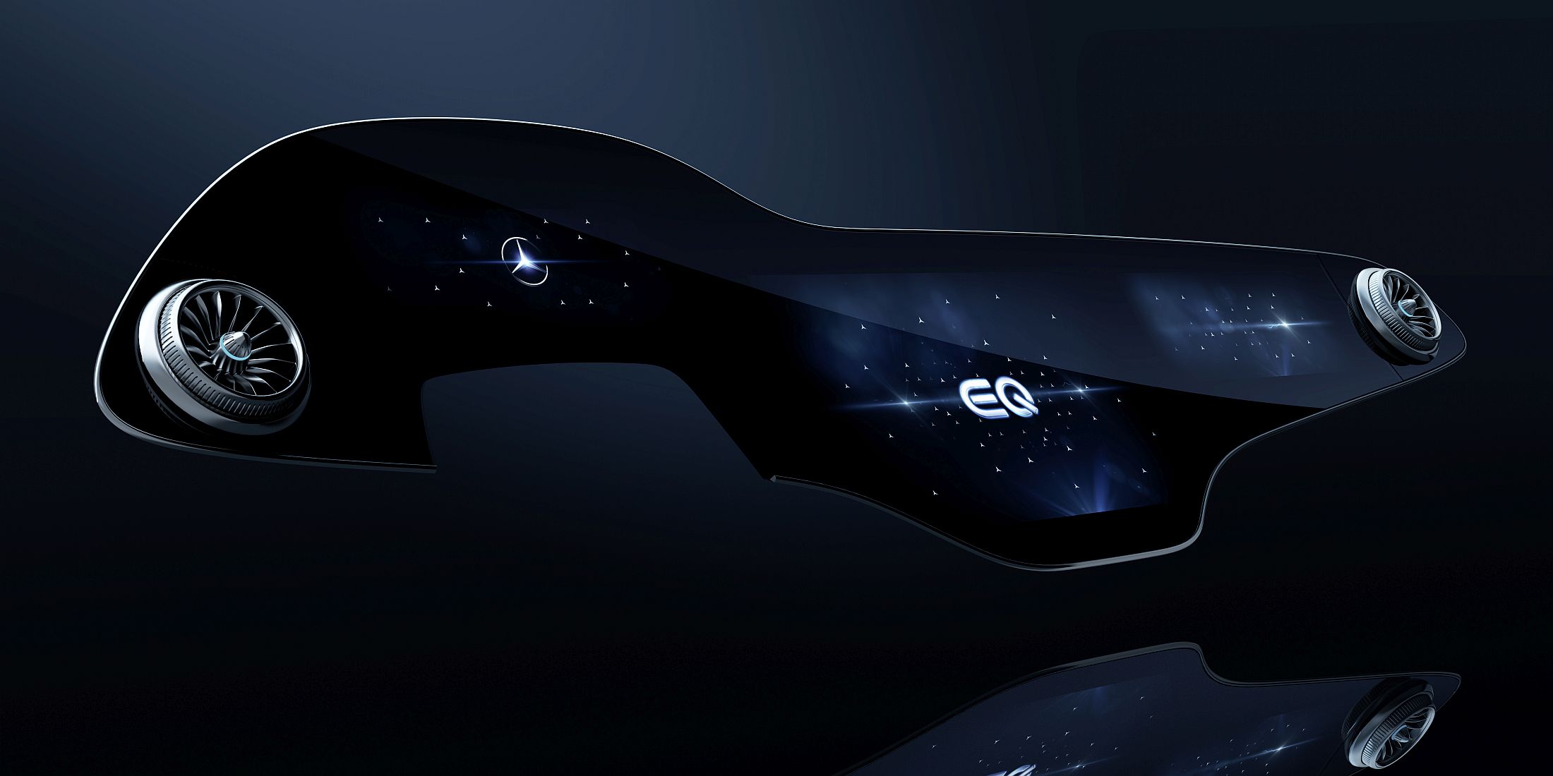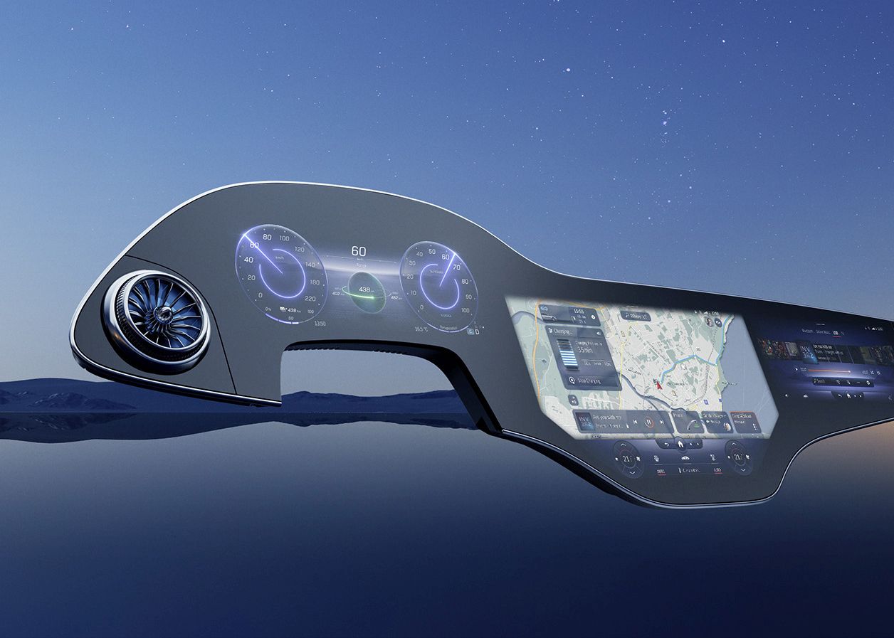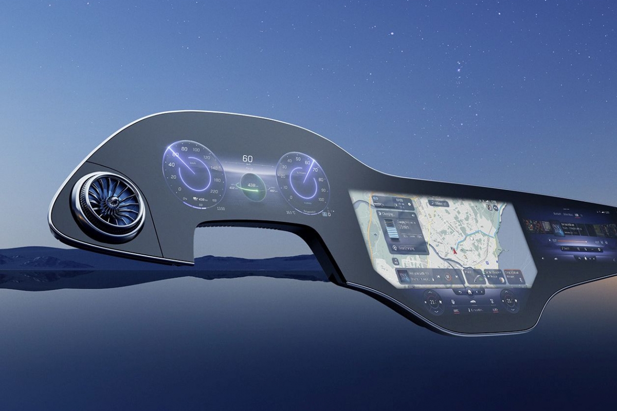 Visualmente, o MBUX Hyperscreen aparenta ser um ecrã único, mas é uma conjugação de elementos de design analógico/digital: vários ecrãs integram-se de forma harmoniosa, resultando numa superfície curva de grandes dimensões. As saídas da climatização do habitáculo estão integradas nesta grande superfície digital, conectando os mundos digital e físico.