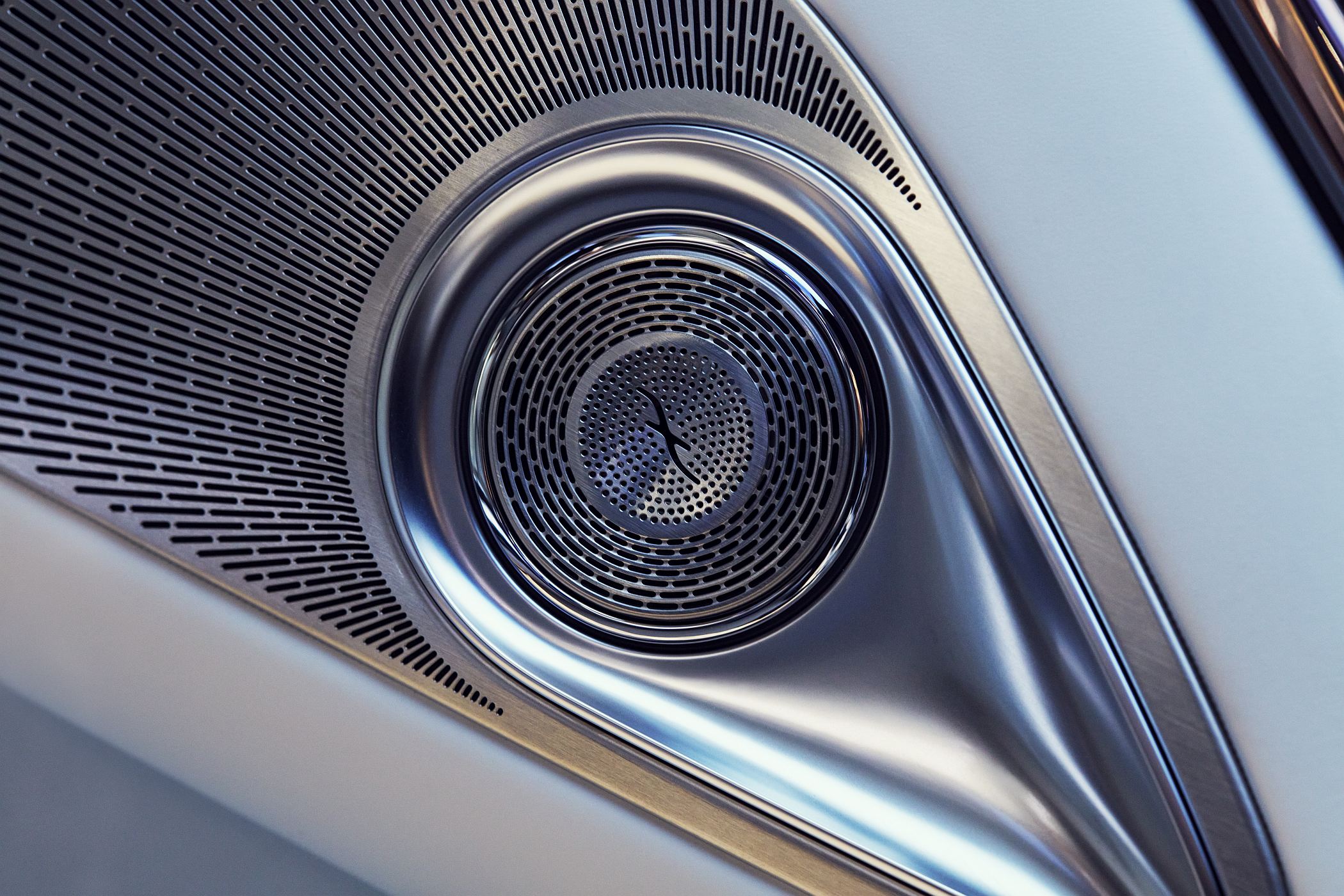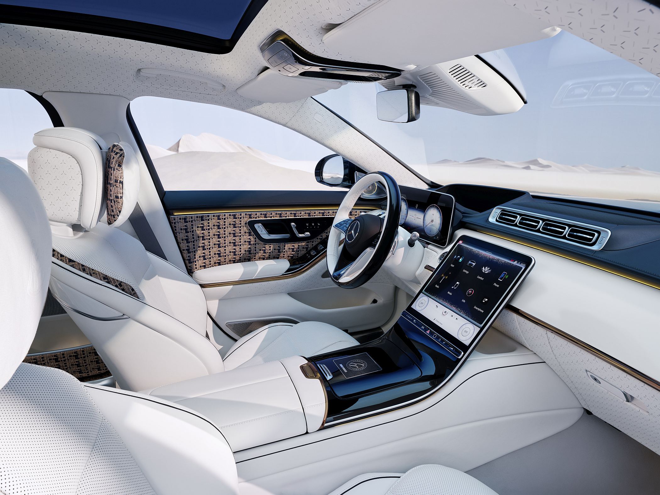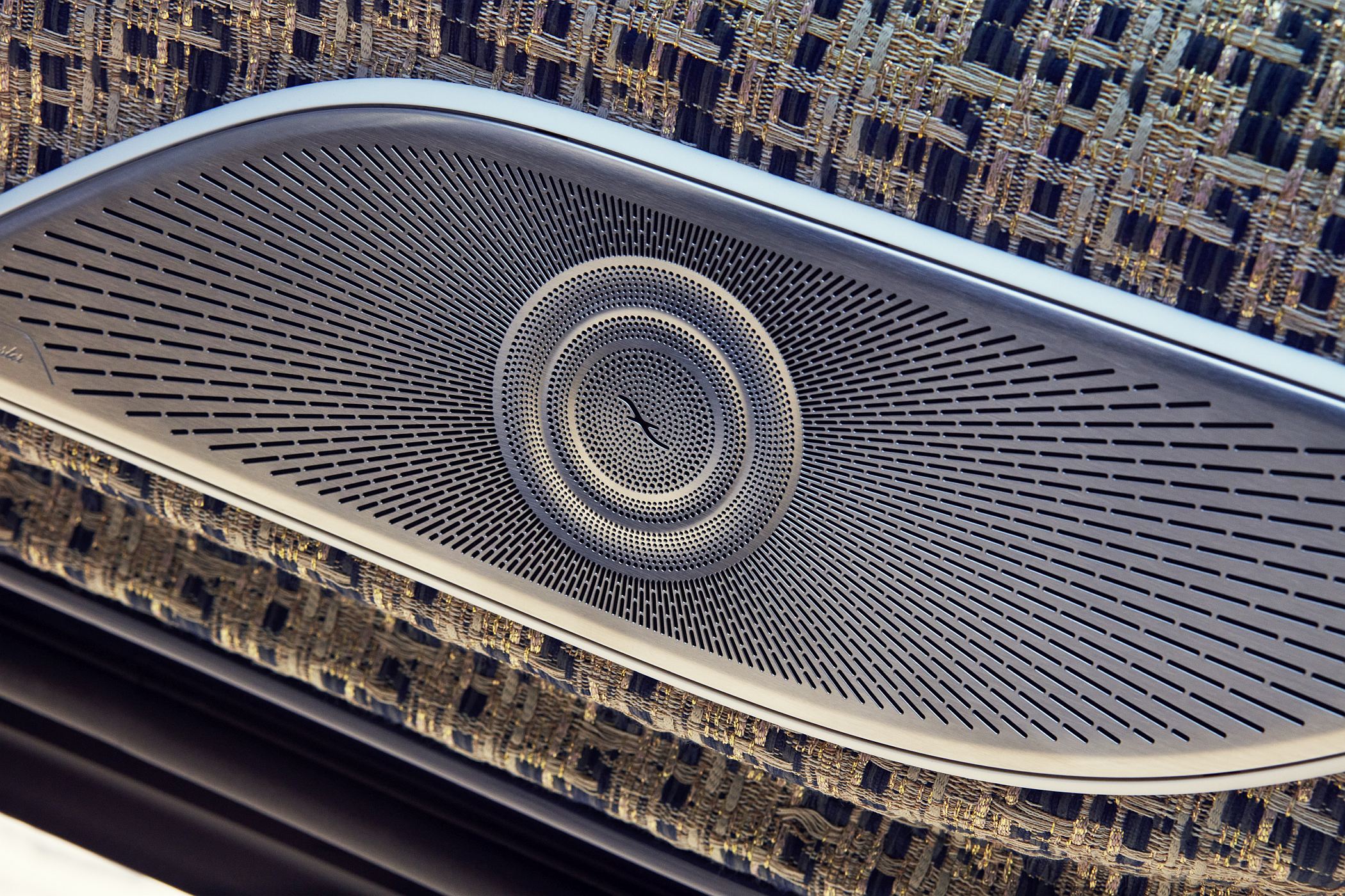 O exterior é transposto facilmente para o interior do veículo através da ampla aplicação de tons de azul náutico escuro e dourado rosa, com elementos adicionais em tons de cristal e branco opal brilhante. O interior revela a máxima atenção aos detalhes requintados, realçando perfeitamente a sua inspiração na alta costura. Um tecido bouclé de alta qualidade inspirado na moda permanece uma constante em todo o modelo, em tons azul, bege, dourado rosa e dourado, com detalhes adicionais complexos nos revestimentos e nas almofadas dos bancos.