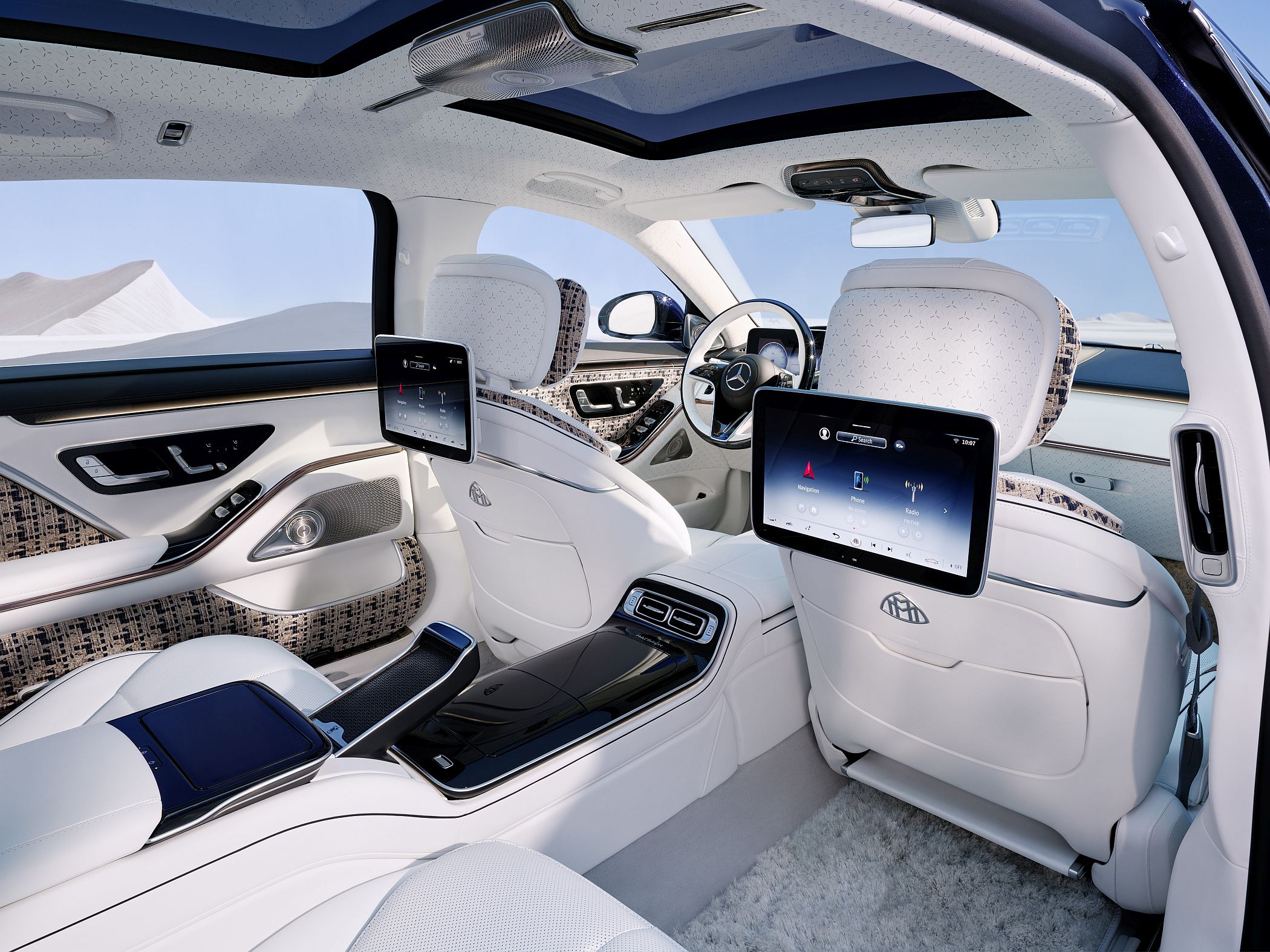 Destaques de pele em branco crystal envolvem os passageiros através das consolas, das portas e das almofadas. Os tapetes do piso são fabricados em linho e lã. Os flutes de champanhe cor rosa dourado integrados na perfeição, no espaçoso compartimento traseiro ao lado de uma insígnia Haute Voiture no painel da porta. Igualmente original para o modelo, é o cordão de pele em tom azul dentro das consolas.