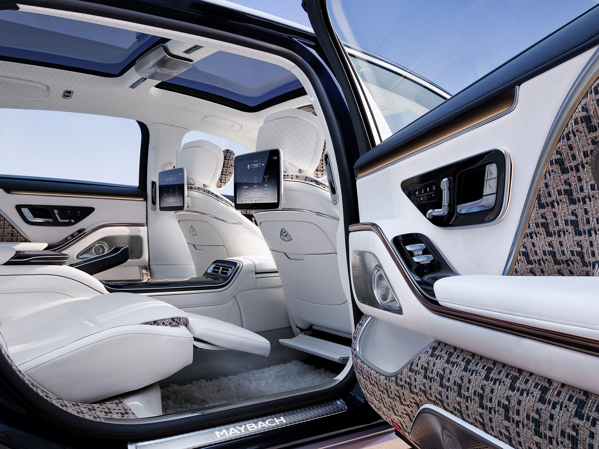 Outro destaque adicional é a iluminação da zona circundante com projeção animada: quando as portas são abertas, a animação dos padrões Mercedes-Benz ou Mercedes-Maybach com tecnologia LCD é ligada e ilumina elegantemente as zonas de entrada dianteiras e traseiras.