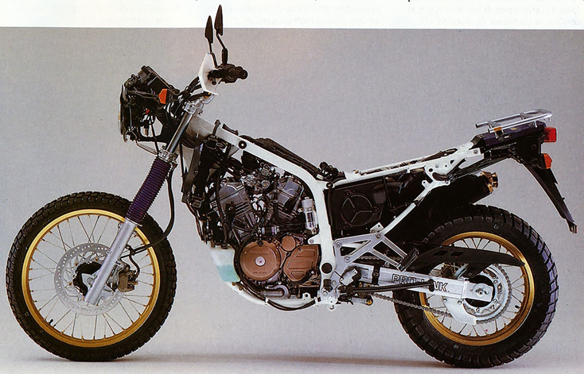 O motor tinha sido “encolhido” para 647 cc, relação curso/diâmetro de 79x76mm e debitava uns saudáveis 57 cv às 8.000 rpm e um binário de 55 nm, logo às 6.000 rpm. Tinha ainda refrigeração líquida, 8 válvulas, caixa de 5 velocidades, travão de disco à frente de 296 mm e atrás de 210 mm. Além disso, já vinha com jante 21 à frente (pneu 90/90-21) e atrás de 17 polegadas (sim, é mesmo verdade) com dimensões de 130/80-17.