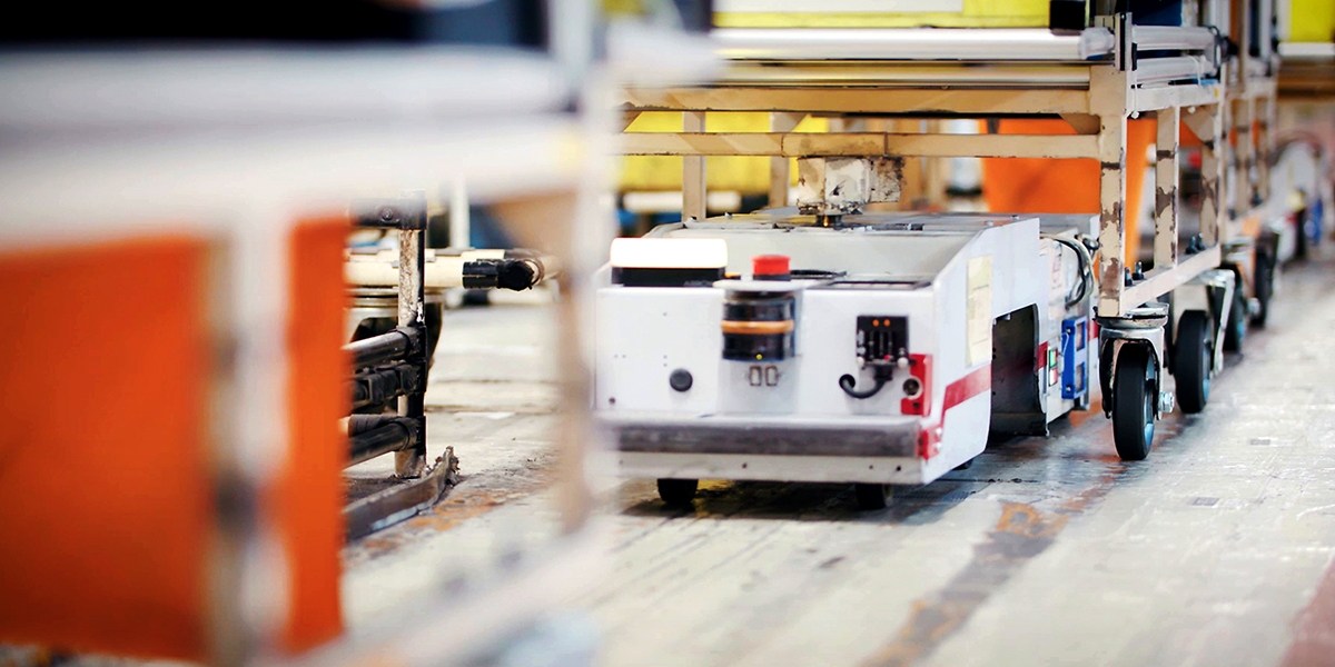 Os AGV são transportadores robóticos que entregam as peças aos trabalhadores numa fábrica de automóveis, no preciso momento em que são necessárias e à medida que os automóveis são construídos. Isto significa que um trabalhador não perde tempo à procura de um componente e pode manter-se focado na sua instalação, poupando tempo e melhorando a eficiência da fábrica.