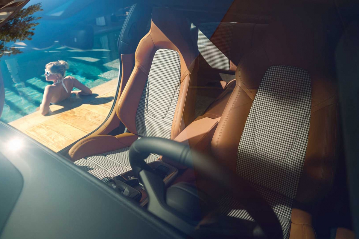 No interior, o icónico padrão “pepita” pode ser encontrado nos painéis das portas e nos centros dos bancos, enquanto o revestimento em Pele bicolor, semianilina, em Preto/Cognac Clássico, proporciona um contraste elegante com a cor exterior.