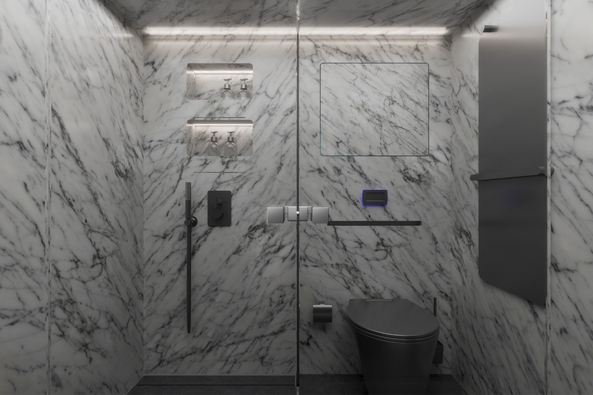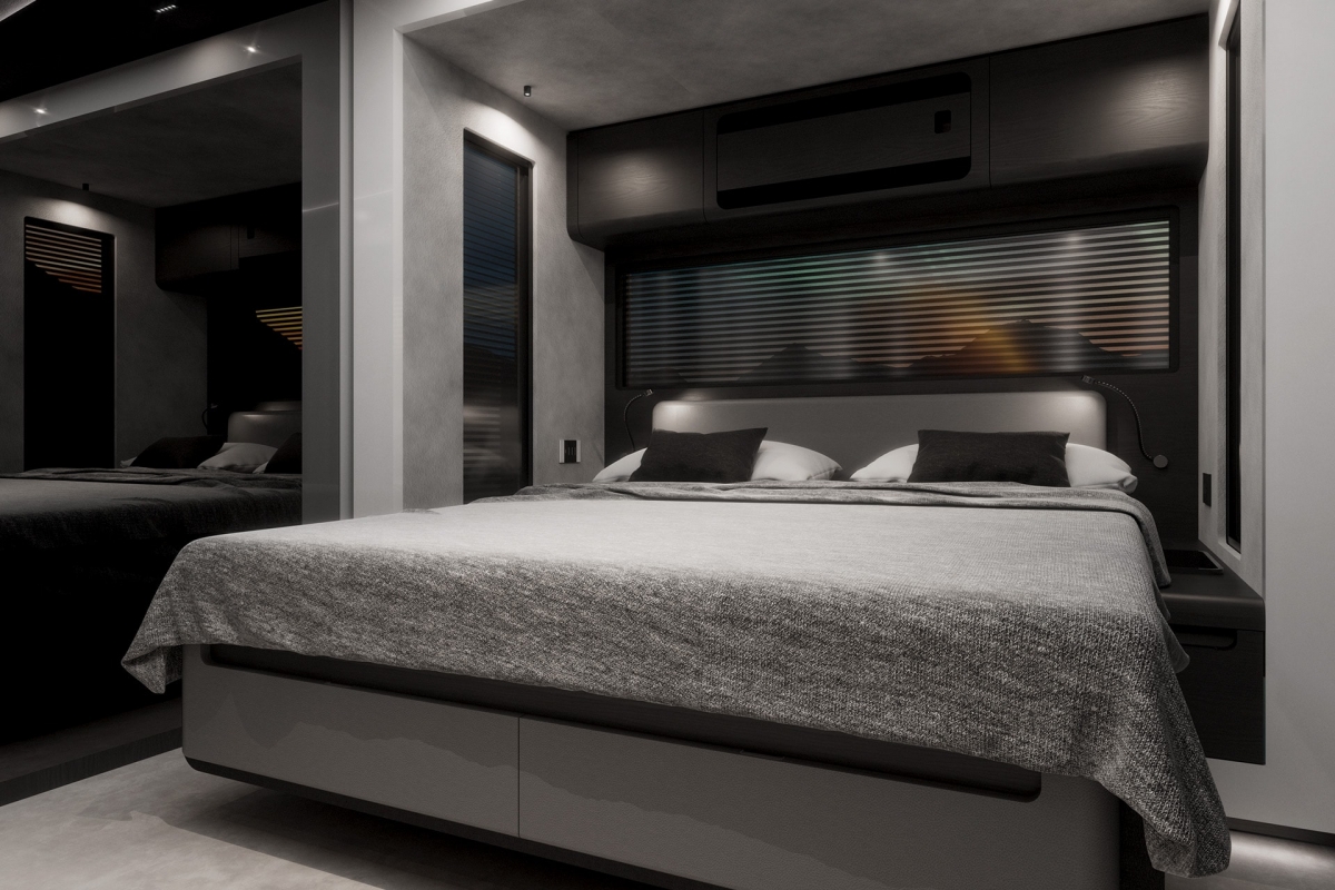 O quarto fica na parte de trás da autocaravana, com uma cama king-size colocada transversalmente com arrumação integrada, roupeiros espelhados, uma secretária expansível e uma segunda smart TV de ecrã grande. Também aqui encontrará muita fibra de carbono exposta (como nos tabuleiros de vidro embutidos nas mesas de cabeceira de linhas finas) misturada com Alcantara e pele Brabus para criar o máximo conforto e uma sensação de elegância sem paralelo.