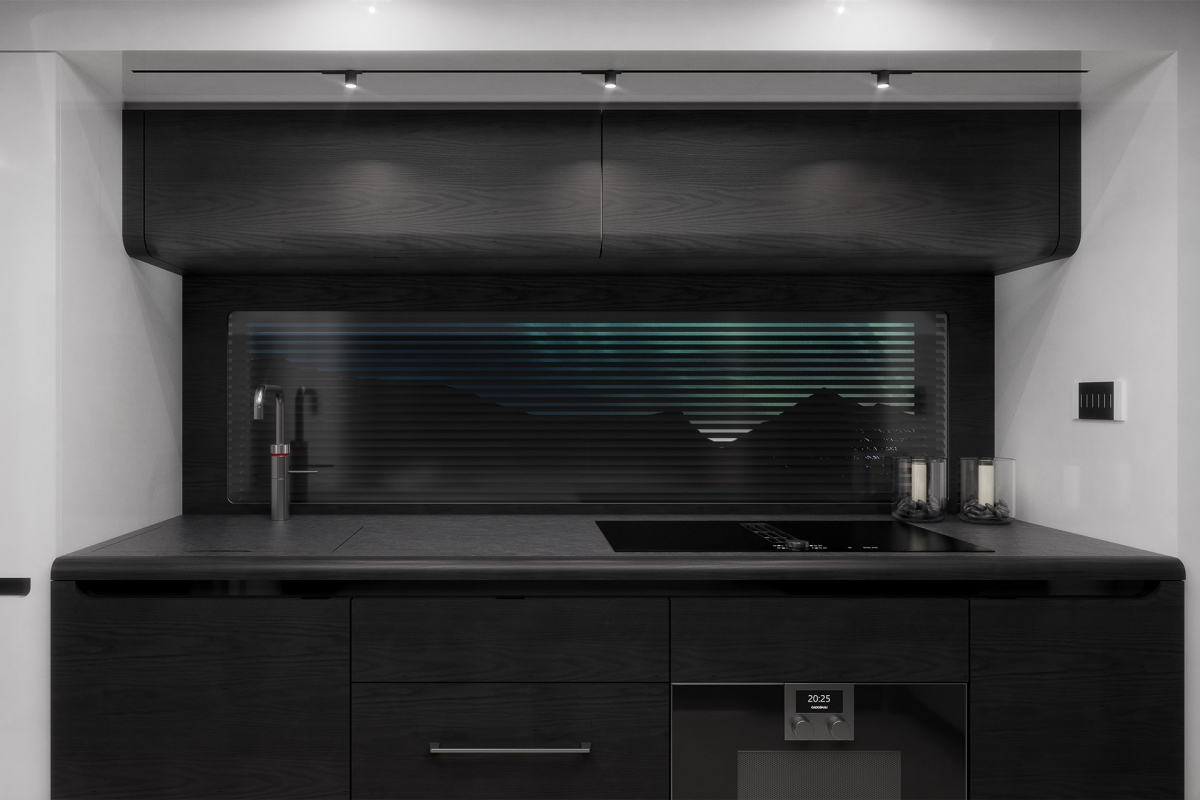 A cozinha é em plano aberto e surpreendentemente bem equipada, depois de ultrapassadas as intimidantes superfícies totalmente pretas. Tem um fogão de indução de dois bicos, um forno elétrico, um frigorífico de grandes dimensões com um congelador separado, uma máquina de lavar louça e até uma prateleira de arrefecimento de vinho com um suporte de vidro separado. Também aqui, a fibra de carbono é utilizada com madeiras pretas para dar aquele toque e aspeto muito específico da Brabus, pelo que verá acabamentos em carbono no frigorífico ou em peças de mobiliário.