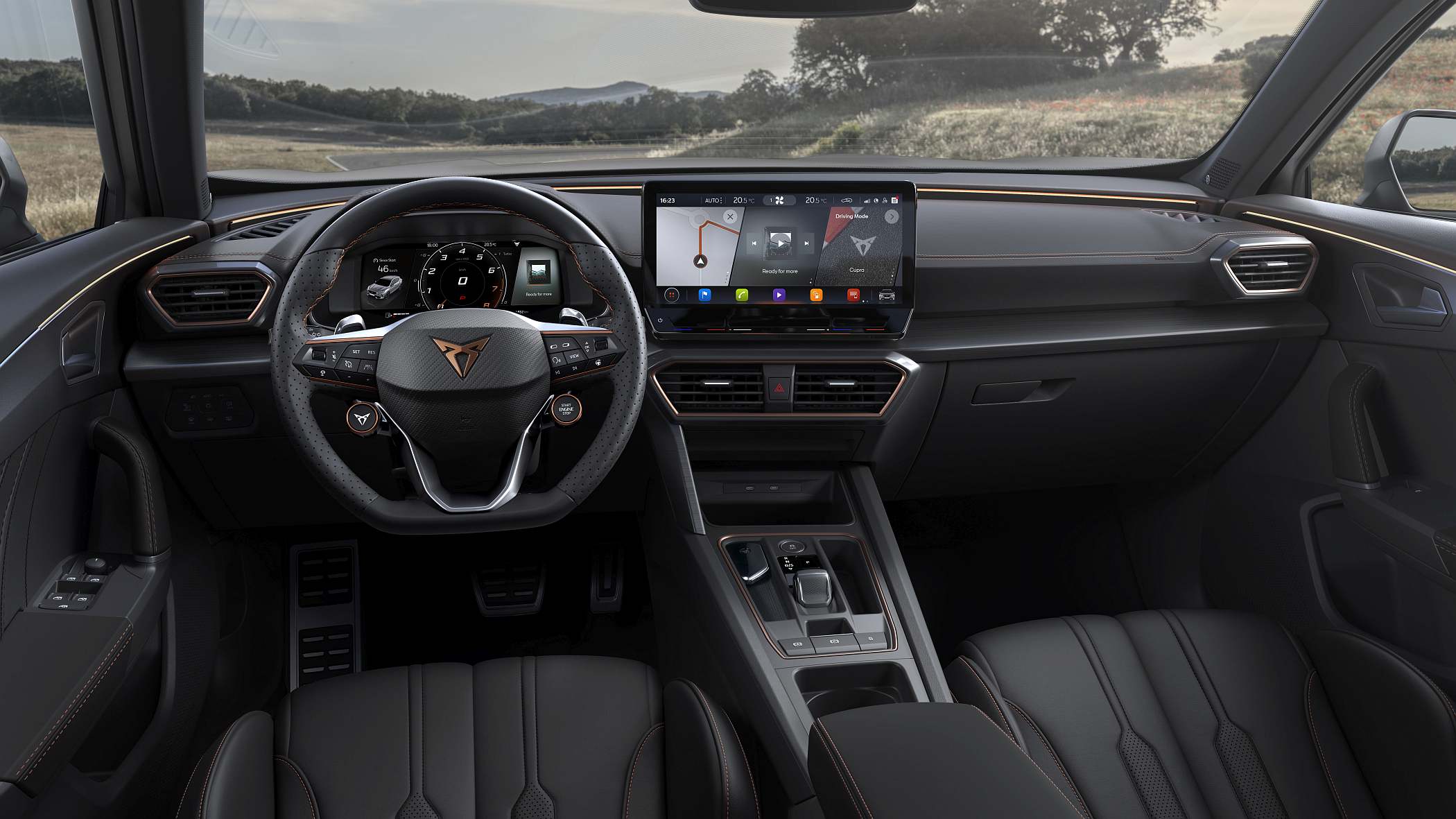 No interior, pouco muda, mantendo-se a aparência ‘racing’ oferecida pelo volante em pele com comandos satélites para os modos de condução (à esquerda) e de arranque (à direita), mas apimentada pela adição de bancos de estilo ‘baquet’ em couro ou, em opção, desportivos ligeiramente mais confortáveis. Destaque ainda para o ecrã de 12 polegadas para o sistema de infoentretenimento que controla todos os elementos do veículos, posicionado ao meio do tablier e em excelente posição de visualização, mas o seu manuseamento padece da mesma necessidade de habituação dos demais modelos da gama. O sistema ‘Full Link’ surge de série, bem como o reconhecimento de voz natural para controlo de algumas funcionalidades.