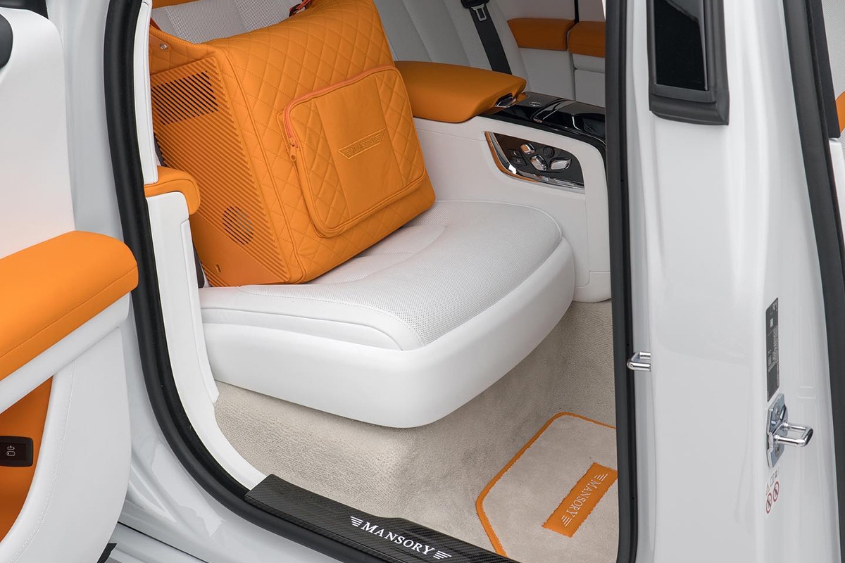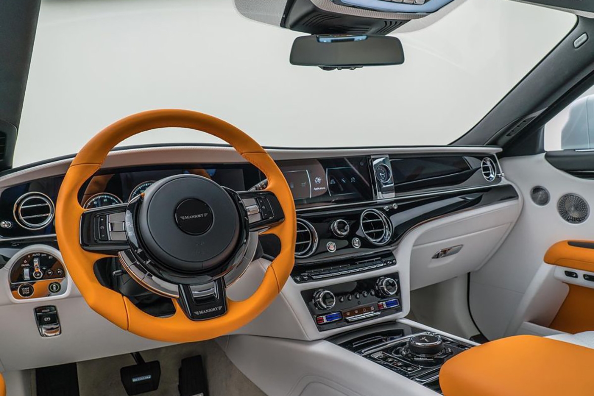 O habitáculo do Rolls-Royce da Mansory recebe um tratamento muito particular, criando um ambiente no qual se misturam o couro branco e o laranja para dar cor ao interior e que é rematado por uma luz ambiental à base de LED.