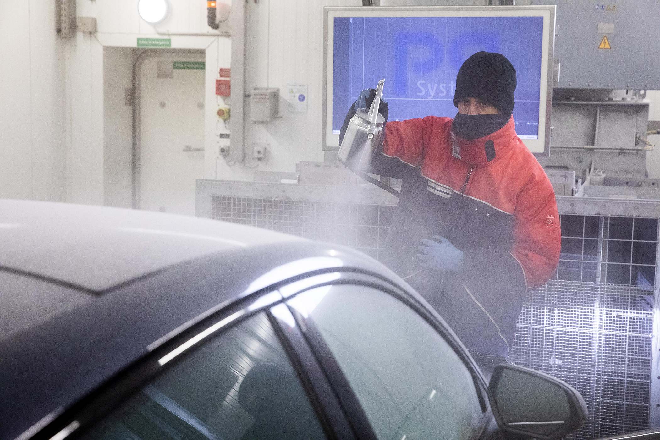 “Queremos comprovar em quanto tempo um motor elétrico ou híbrido é capaz de descongelar um para-brisas completamente coberto de gelo”, comenta Vicente Sancho. Primeiro, o automóvel esteve a aclimatizar dentro da câmara durante umas dez horas. Posteriormente, pulverizaram-no com água, que se transforma em gelo. Vicente entra no veículo, liga a climatização e, antes de 20 minutos, a capa de gelo do para-brisas que impedia a visão desaparece. Além destes testes, a equipa do Centro de Motores controla que todos os componentes funcionam perfeitamente a essa temperatura e que, mesmo viajando para a Antártida, o veículo manterá o seu desempenho a 100%.