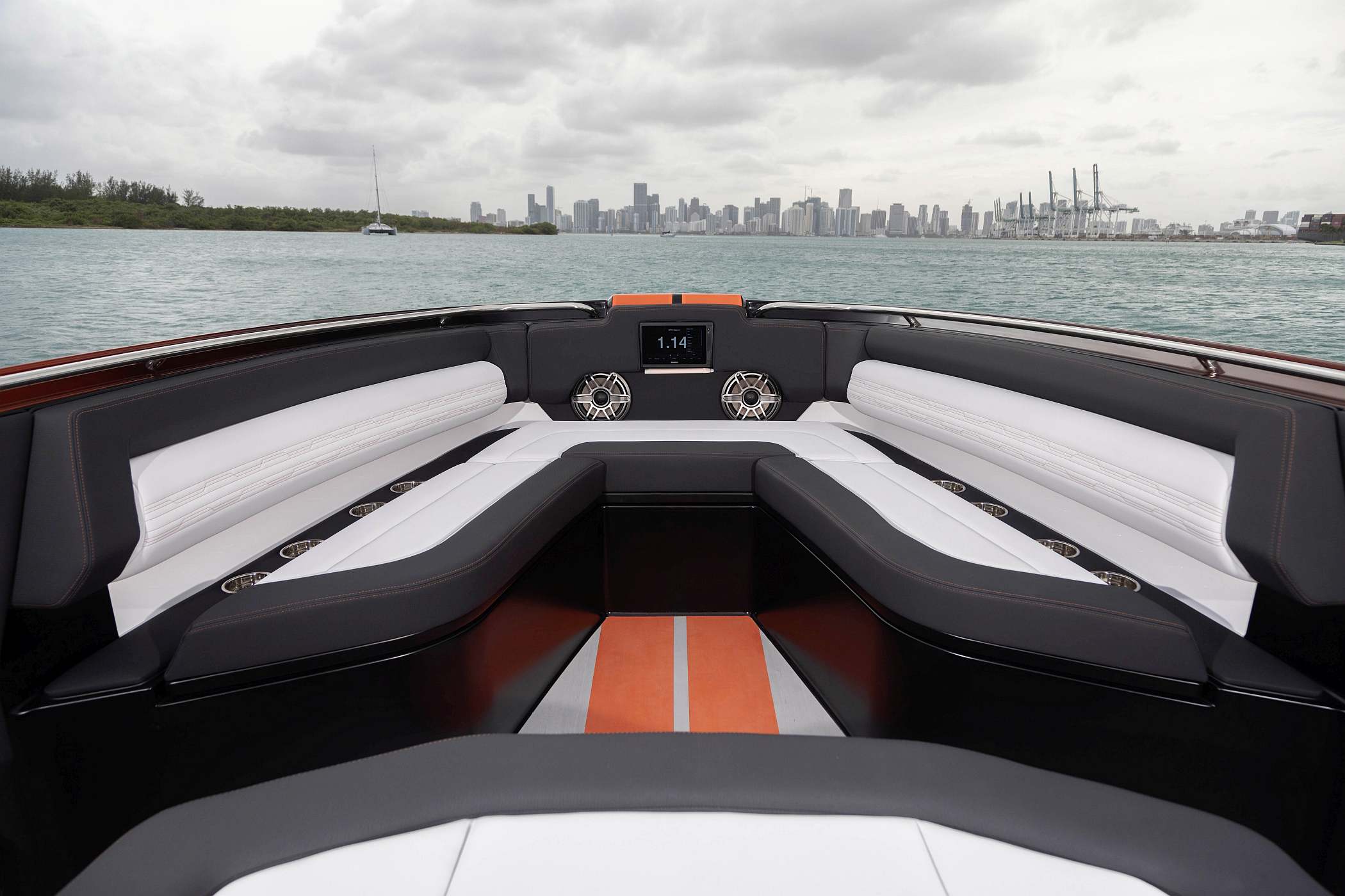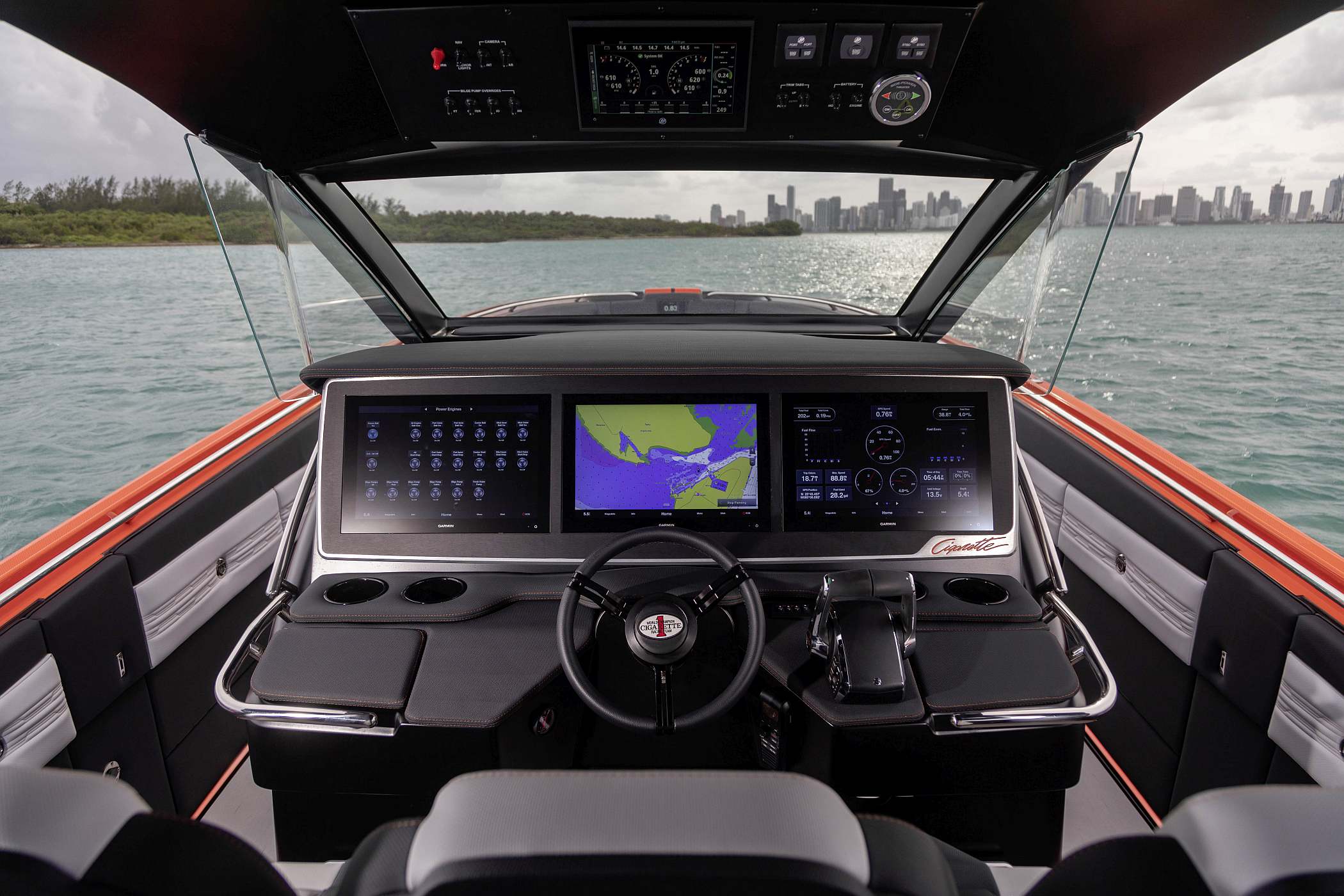 O leme conta com três ecrãs Garmin 8617 multifunções montados num painel de instrumentos concebido a partir de um bloco sólido de alumínio, sendo resistente ao calor, reflexos e impressões digitais.